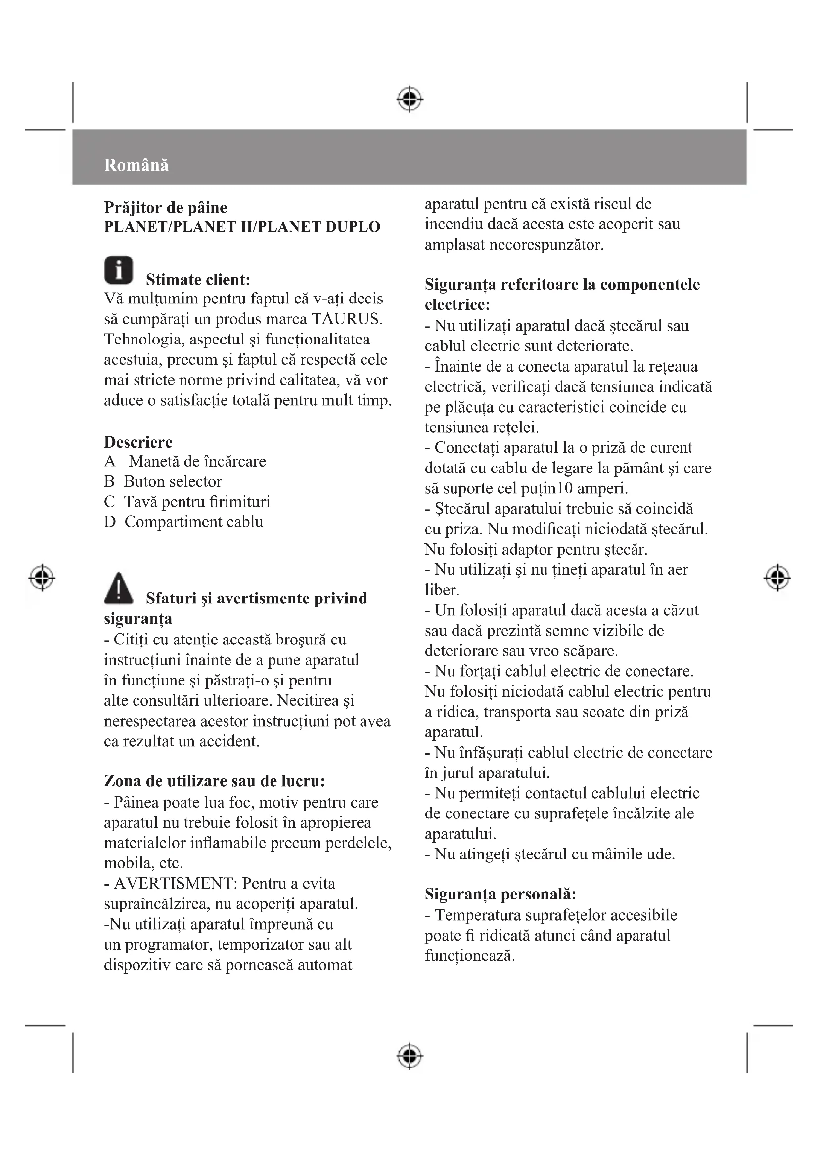 Stimate client: Vă mulţumim pentru faptul că v-aţi decis să cumpăraţi un produs marca TAURUS. Tehnologia, aspectul şi funcţionalitatea acestuia, precum şi faptul că respectă cele mai stricte norme privind calitatea, vă vor aduce o satisfacţie totală pentru mult timp. Descriere A Manetă de încărcare B Buton selector C Tavă pentru rimituri D Compartiment cablu Sfaturi şi avertismente privind siguranţa - Citiţi cu atenţie această broşură cu instrucţiuni înainte de a pune aparatul în funcţiune şi păstraţi-o şi pentru alte consultări ulterioare. Necitirea şi nerespectarea acestor instrucţiuni pot avea ca rezultat un accident. Zona de utilizare sau de lucru: - Pâinea poate lua foc, motiv pentru care aparatul nu trebuie folosit în apropierea materialelor inamabile precum perdelele, mobila, etc. - AVERTISMENT: Pentru a evita supraîncălzirea, nu acoperiţi aparatul. -Nu utilizaţi aparatul împreună cu un programator, temporizator sau alt dispozitiv care să pornească automat aparatul pentru că există riscul de incendiu dacă acesta este acoperit sau amplasat necorespunzător. Siguranţa referitoare la componentele electrice: - Nu utilizaţi aparatul dacă ştecărul sau cablul electric sunt deteriorate. - Înainte de a conecta aparatul la reţeaua electrică, vericaţi dacă tensiunea indicată pe plăcuţa cu caracteristici coincide cu tensiunea reţelei. - Conectaţi aparatul la o priză de curent dotată cu cablu de legare la pământ şi care să suporte cel puţin10 amperi. - Ştecărul aparatului trebuie să coincidă cu priza. Nu modicaţi niciodată ştecărul. Nu folosiţi adaptor pentru ştecăr. - Nu utilizaţi şi nu ţineţi aparatul în aer liber. - Un folosiţi aparatul dacă acesta a căzut sau dacă prezintă semne vizibile de deteriorare sau vreo scăpare. - Nu forţaţi cablul electric de conectare. Nu folosiţi niciodată cablul electric pentru a ridica, transporta sau scoate din priză aparatul. - Nu înfăşuraţi cablul electric de conectare în jurul aparatului. - Nu permiteţi contactul cablului electric de conectare cu suprafeţele încălzite ale aparatului. - Nu atingeţi ştecărul cu mâinile ude. Siguranţa personală: - Temperatura suprafeţelor accesibile poate ridicată atunci când aparatul funcţionează.Utilizare şi îngrijire: - Înaintea ecărei utilizări, desfăşuraţi în mod complet cablul electric al aparatului. - Nu utilizaţi aparatul dacă dispozitivul de pornire / oprire nu funcţionează. - Nu mişcaţi sau deplasaţi aparatul în timp ce funcţionează. - Nu întoarceţi aparatul cu partea superioară în jos în timpul folosirii sau când este în priză. - Deconectaţi aparatul de la reţea când nu îl folosiţi şi înainte de a efectua orice operaţiune de curăţare. - Acest aparat este destinat exclusiv uzului domestic şi nu celui profesional sau industrial. - Acest aparat este destinat utilizării de către adulţi. Nu permiteţi folosirea acestuia de către persoane care nu sunt obişnuite cu acest tip de produse, persoane handicapate sau copii. - Nu lăsaţi acest aparat la îndemâna copiilor şi/sau persoanelor handicapate. - Acest aparato nu este o jucărie. Copiii trebuie supravegheaţi pentru a garanta că nu se joacă cu acest aparat. - Nu puneţi la loc aparatul dacă încă este cald. - Orice utilizare necorespunzătoare sau aată în dezacord cu instrucţiunile de folosire poate conduce la o situaţie de pericol, anulând astfel garanţia şi răspunderea producătorului. Mod de utilizare Note anterioare utilizării: - Înainte de a folosi aparatul pentru prima oară, vă recomandăm să-l utilizaţi fără pâine. Utilizare: - Conectaţi aparatul la reţeaua electrică. - Introduceţi felia / feliile de pâine în aparat. - Selecţionaţi gradul de prăjire cu ajutorul butonului selector. - Puneţi aparatul în funcţiune deplasând maneta de încărcare în jos pînă când se aude un „ţac”. - Feliile de pâine se vor centra automat pentru a asigura prăjirea uniformă. - Pentru reducerea generării de acrilamidă în timpul procesului de prăjire, aveţi grijă ca pâinea să nu capete culoarea maro închis sau negru. - Odată trecut timpul de prăjire selecţionat aparatul se va opri în mod automat. Funcţia Anulare: - Setând controlul gradului de prăjire în poziţia « Stop », ciclul se opreşte automat şi pâinea este ejectată. Prin reglarea în această poziţie, se poate înterupe procesul de prăjire în orice moment. Odată încheiată utilizarea aparatului: - Deconectaţi aparatul de la reţeaua electrică. - Strângeţi cablul în compartimentul său. - Curăţaţi aparatul Locaş Cablu - Acest aparat este prevăzut cu un locaşpentru cablul de conectare la reţea aat în partea sa inferioară. Curăţare - Deconectaţi aparatul de la reţeaua electrică şi aşteptaţi să se răcească înainte de a efectua orice operaţiune de curăţare. - Curăţaţi aparatul cu un prosop umed impregnat cu câteva picături de detergent şi apoi ştergeţi-l. - Nu folosiţi dizolvanţi, produse cu un factor ph acid sau bazic precum leşia, sau produse abrazive pentru a curăţa aparatul. - Este interzisă introducerea aparatului în apă sau în orice alt lichid, sau clătirea lui sub jet de apă. - Se recomandă curăţarea periodică a aparatului şi eliminarea tuturor resturilor de alimente. Tavă pentru rimituri: - Aparatul dispune de o tavă pentru rimituri care permite strângerea acelora care pot rămâne în interiorul aparatului. - Scoateţi tava din aparat - Goliţi conţinutul tăvii. - Scuturaţi uşor aparatul pentru a elimina toate rimiturile care au rămas în el. - Puneţi tava la loc în aparat. Defecţiuni şi repararea lor - În caz de defecţiune, duceţi aparatul la un Serviciu de Asistenţă Tehnică autorizat. Nu încercaţi să-l demontaţi sau să-l reparaţi deoarece poate periculos. - Dacă conexiunea la reţeaua electrică este deteriorată,