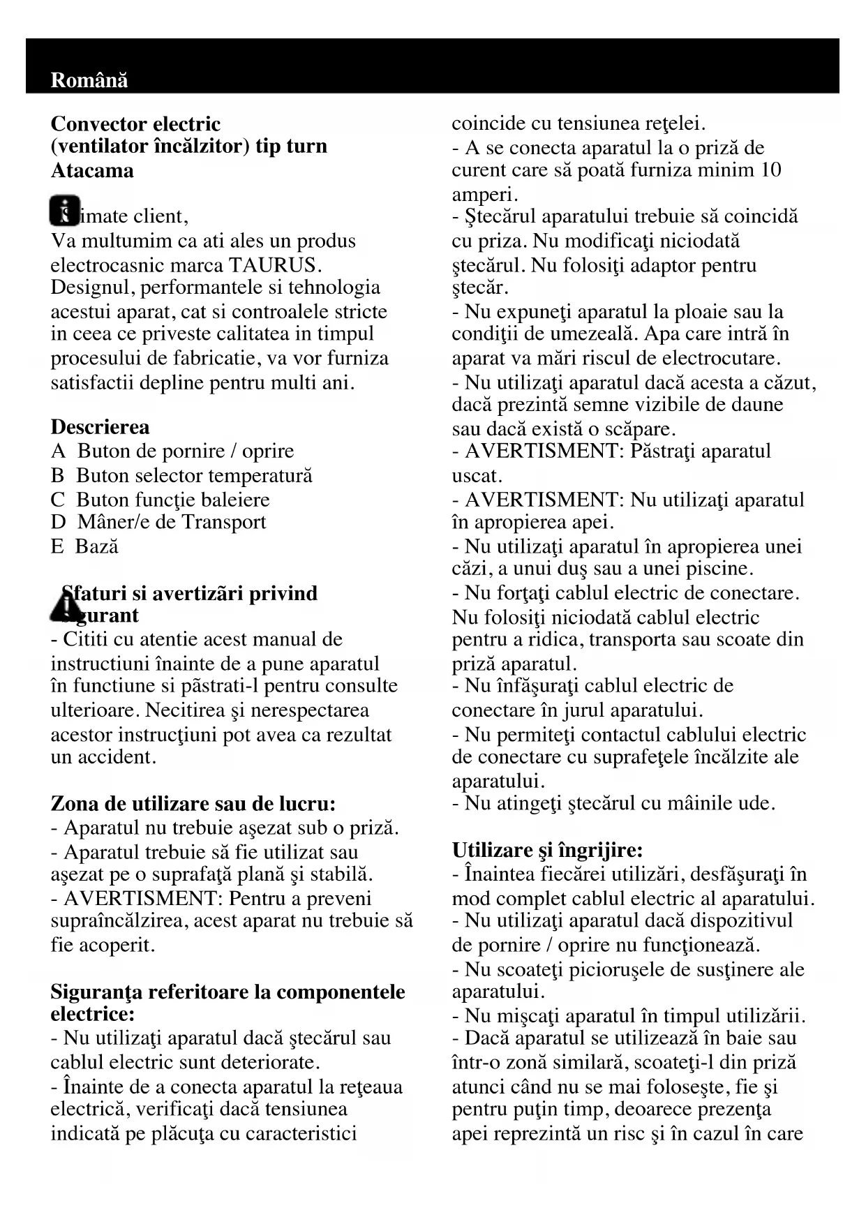 безопасности и гигиены. В соответствии с законом РФ «О Защите Прав Потребителей», срок службы на продукцию TAURUS устанавливается равным трем годам с момента приобретения. При бережном использовании и соблюдении правил эксплуатации, изделия могут иметь значительно больший срок службы, чем установленный в соответствии с Российским законодательством.Română Convector electric (ventilator încălzitor) tip turn Atacama Stimate client, Va multumim ca ati ales un produs electrocasnic marca TAURUS. Designul, performantele si tehnologia acestui aparat, cat si controalele stricte in ceea ce priveste calitatea in timpul procesului de fabricatie, va vor furniza satisfactii depline pentru multi ani. Descrierea A Buton de pornire / oprire B Buton selector temperatură C Buton funcţie baleiere D Mâner/e de Transport E Bază Sfaturi si avertizãri privind sigurant - Cititi cu atentie acest manual de instructiuni înainte de a pune aparatul în functiune si pãstrati-l pentru consulte ulterioare. Necitirea şi nerespectarea acestor instrucţiuni pot avea ca rezultat un accident. Zona de utilizare sau de lucru: - Aparatul nu trebuie aşezat sub o priză. - Aparatul trebuie să fie utilizat sau aşezat pe o suprafaţă plană şi stabilă. - AVERTISMENT: Pentru a preveni supraîncălzirea, acest aparat nu trebuie să fie acoperit. Siguranţa referitoare la componentele electrice: - Nu utilizaţi aparatul dacă ştecărul sau cablul electric sunt deteriorate. - Înainte de a conecta aparatul la reţeaua electrică, verificaţi dacă tensiunea indicată pe plăcuţa cu caracteristici coincide cu tensiunea reţelei. - A se conecta aparatul la o priză de curent care să poată furniza minim 10 amperi. - Ştecărul aparatului trebuie să coincidă cu priza. Nu modificaţi niciodată ştecărul. Nu folosiţi adaptor pentru ştecăr. - Nu expuneţi aparatul la ploaie sau la condiţii de umezeală. Apa care intră în aparat va mări riscul de electrocutare. - Nu utilizaţi aparatul dacă acesta a căzut, dacă prezintă semne vizibile de daune sau dacă există o scăpare. - AVERTISMENT: Păstraţi aparatul uscat. - AVERTISMENT: Nu utilizaţi aparatul în apropierea apei. - Nu utilizaţi aparatul în apropierea unei căzi, a unui duş sau a unei piscine. - Nu forţaţi cablul electric de conectare. Nu folosiţi niciodată cablul electric pentru a ridica, transporta sau scoate din priză aparatul. - Nu înfăşuraţi cablul electric de conectare în jurul aparatului. - Nu permiteţi contactul cablului electric de conectare cu suprafeţele încălzite ale aparatului. - Nu atingeţi ştecărul cu mâinile ude. Utilizare şi îngrijire: - Înaintea fiecărei utilizări, desfăşuraţi în mod complet cablul electric al aparatului. - Nu utilizaţi aparatul dacă dispozitivul de pornire / oprire nu funcţionează. - Nu scoateţi picioruşele de susţinere ale aparatului. - Nu mişcaţi aparatul în timpul utilizǎrii. - Dacă aparatul se utilizează în baie sau într-o zonă similară, scoateţi-l din priză atunci când nu se mai foloseşte, fie şi pentru puţin timp, deoarece prezenţa apei reprezintă un risc şi în cazul în careaparatul este deconectat. - Deconectaţi aparatul de la reţeaua electrică atunci când nu-l mai folosiţi şi înainte de a efectua orice operaţiune de curăţare. - Acest aparat este destinat exclusiv uzului domestic şi nu celui profesional sau industrial. - Acest aparat nu este o jucărie. Copiii trebuie supravegheaţi pentru a garanta că nu se joacă cu acest aparat. - Acest aparat este destinat utilizării de către adulţi. Nu permiteţi utilizarea acestuia de către persoane care nu sunt obişnuite cu acest tip de produse, persoane handicapate sau copii. - Nu lăsaţi acest aparat la îndemâna copiilor şi/sau persoanelor handicapate. - Acest aparat nu este echipat cu un dispozitiv de control al temperaturii ambientale. Nu utilizaţi acest aparat în spaţii mici ocupate de persoane invalide ce nu pot părăsi încăperea fără ajutor, cu excepţia celor supravegheate în mod constant. - Nu expuneţi aparatul la temperaturi extreme. - Orice utilizare incorectã sau în dezacord cu instructiunile de folosire, anuleazã garantia si responsabilitatea fabricantului. Instalare - Tastatura trebuie să fie uşor accesibilă pentru a putea deconecta aparatul în caz de urgenţă. - Aparatul trebuie să funcţioneze cu picioruşele de susţinere montate. Montarea bazei: - Pentru montarea bazei, aşezaţi aparatul cu gura în jos. - Poziţionaţi baza la corpul aparatului. - Fixaţi baza cu ajutorul suporturilor furnizate. Rotiţi din nou aparatul şi verificaţi buna funcţionare a bazei. Mod de utilizare Utilizare: - Desfăşuraţi complet cablul înainte de a porni aparatul. - Conectaţi aparatul la reţeaua electrică. - Puneţi aparatul în funcţiune, acţionând întrerupătorul pornit/oprit. - Selecţionaţi puterea dorită. Funcţie oscilaţie: - Funcţia oscilaţie permite direcţionarea fluxului de aer care iese din aparat pentru a acoperi alternativ şi în mod automat un unghi de până la 75º. - Pentru a activa această funcţie, apăsaţi butonul (C). - Pentru dezactivarea ei, efectuaţi operaţiunea inversă. Odată încheiată utilizarea aparatului: - Opriţi aparatul, acţionând întrerupătorul pornit/oprit. - Deconectaţi aparatul de la reţeaua electrică. Mâner/e de Transport: - Acest aparat dispune de un mâner pe partea sa superioară pentru un transport uşor şi comod (D). Curãtirea - Scoateţi aparatul din priză şi lăsaţi-l să se răcească înainte de a iniţia orice operaţiune de curăţare. - Spălaţi ansamblul electric şi conectorul de la priză cu