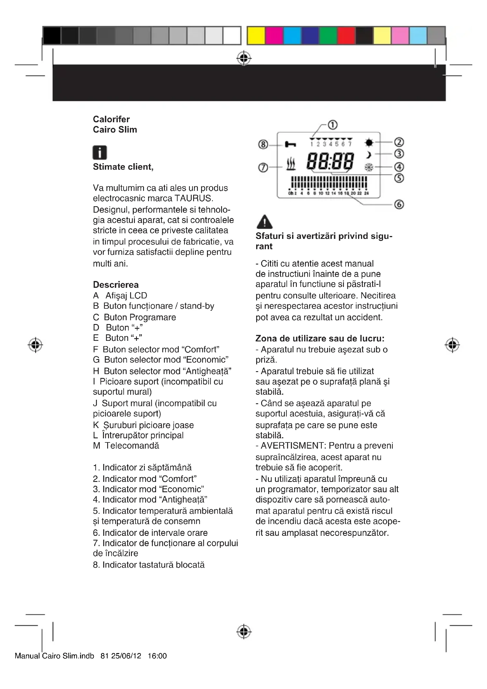 APĂ SAU ÎN ORICE ALT LICHID. - Curăţaţi aparatul cu un prosop umed impregnat cu câteva picături de detergent şi apoi ştergeţi-l. - Nu utilizaţi dizolvanţi, produse cu un factor ph acid sau bazic precum leşia, sau produse abrazive pentru a curăţa aparatul. - Nu permiteţi intrarea apei sau a oricărui alt lichid prin oriciile de aerisire pentru a evita deteriorarea pieselor din interiorul aparatului. - Nu cufundaţi aparatul în apă sau alt lichid şi nu-l puneţi sub jet de apă. Anomalii si reparatii - In cazul aparitiei unor anomalii la cablul de alimentare, nu incercati sa schimbati cablul, ar pute peri- Manual Cairo Slim.indb 86 25/06/12 16:00culos. Duceti aparatul la un service autorizat. - Dacă conexiunea la reţeaua electrică este deteriorată, trebuie înlocuită şi trebuie procedat ca în cazul unei avarii. Pentru produsele provenite din Uniunea Europeană şi/sau în cazul în care acest lucru este solicitat de reglementările din ţara de origine: Caracterul ecologic şi reciclabil al produsului Acest simbol semnalează că, dacă doriţi să vă debarasaţi de acest produs odată încheiată durata sa de viaţă, trebuie să îl predaţi, cu ajutorul mijloacelor adecvate, unui colector de deșeurile de echipamente electrice și electronice (DEEE). Acest simbol semnică faptul că acest produs nu poate acoperit. Acest aparat respectă Directiva 2006/95/CE de Tensiune Joasă, Directiva 2004/108/CE de Compati- bilitate Electromagnetică. Manual Cairo Slim.indb 87 25/06/12 16:00Български Електрически конвектор Cairo Slim Уважаеми клиенти: Благодарим Ви, че закупихте електроуред с марката TAURUS. Неговата технология, дизан и функционалност, наред с факта, че надвишава и на-стриктните норми за качество, ще Ви доставят пълно удовлетворение за дълго време. Основни части A LCD Диспле B Бутон за работа/”stand-by” C Бутон за програмиране D Бутон “+” E Бутон “-” F Бутон селектор за режим