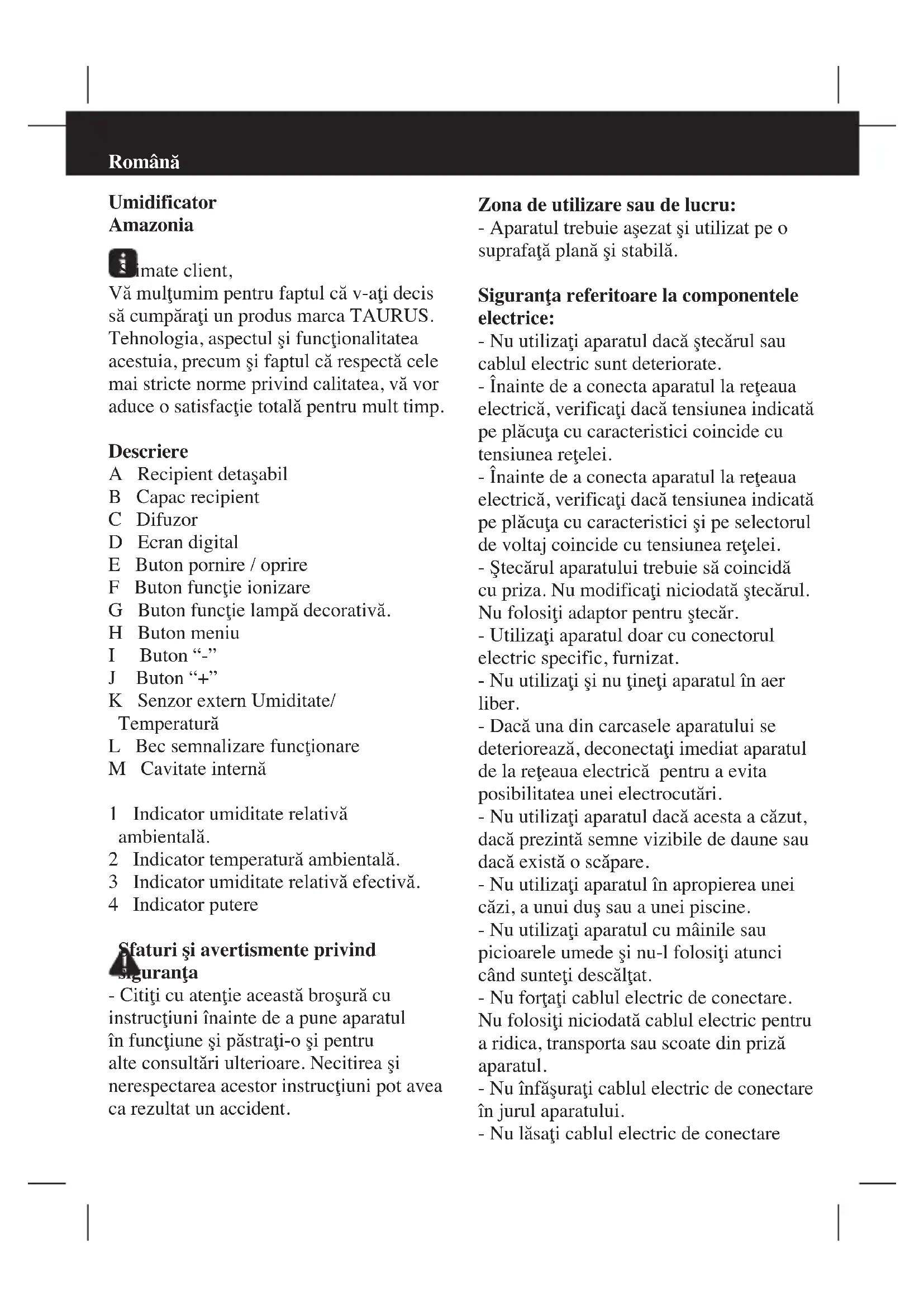 - Данный символ означает, что по окончании полезной жизни прибора его не разрешается выбрасывать в общественный контейнер для мусора. Воспользуйтесь специальными контейнерами, или передайте его в руки представителя организации по утилизации и переработке электрических и электронных приборов RAEE (обратитесь за консультацией в ближайший социальный центр). Изделия марки TAURUS соответствуют всем требуемым европейским и российским стандартам безопасности и гигиены. В соответствии с законом РФ «О Защите Прав Потребителей», срок службы на продукцию TAURUS устанавливается равным трем годам с момента приобретения. При бережном использовании и соблюдении правил эксплуатации, изделия могут иметь значительно больший срок службы, чем установленный в соответствии с Российским законодательством. Настоящий прибор изготовлен в соответствии с требованиями Директивы 2006/95/EC о Низком напряжении и Директивы 2004/108/ EC об Электромагнитной Совместимости электрических приборов.Umidificator Amazonia Stimate client, Vă mulţumim pentru faptul că v-aţi decis să cumpăraţi un produs marca TAURUS. Tehnologia, aspectul şi funcţionalitatea acestuia, precum şi faptul că respectă cele mai stricte norme privind calitatea, vă vor aduce o satisfacţie totală pentru mult timp. Descriere A Recipient detaşabil B Capac recipient C Difuzor D Ecran digital E Buton pornire / oprire F Buton funcţie ionizare G Buton funcţie lampă decorativă. H Buton meniu I Buton “-” J Buton “+” K Senzor extern Umiditate/ Temperatură L Bec semnalizare funcţionare M Cavitate internă 1 Indicator umiditate relativă ambientală. 2 Indicator temperatură ambientală. 3 Indicator umiditate relativă efectivă. 4 Indicator putere Sfaturi şi avertismente privind siguranţa - Citiţi cu atenţie această broşură cu instrucţiuni înainte de a pune aparatul în funcţiune şi păstraţi-o şi pentru alte consultări ulterioare. Necitirea şi nerespectarea acestor instrucţiuni pot avea ca rezultat un accident. Română Zona de utilizare sau de lucru: - Aparatul trebuie aşezat şi utilizat pe o suprafaţă plană şi stabilă. Siguranţa referitoare la componentele electrice: - Nu utilizaţi aparatul dacă ştecărul sau cablul electric sunt deteriorate. - Înainte de a conecta aparatul la reţeaua electrică, verificaţi dacă tensiunea indicată pe plăcuţa cu caracteristici coincide cu tensiunea reţelei. - Înainte de a conecta aparatul la reţeaua electrică, verificaţi dacă tensiunea indicată pe plăcuţa cu caracteristici şi pe selectorul de voltaj coincide cu tensiunea reţelei. - Ştecărul aparatului trebuie să coincidă cu priza. Nu modificaţi niciodată ştecărul. Nu folosiţi adaptor pentru ştecăr. - Utilizaţi aparatul doar cu conectorul electric specific, furnizat. - Nu utilizaţi şi nu ţineţi aparatul în aer liber. - Dacă una din carcasele aparatului se deteriorează, deconectaţi imediat aparatul de la reţeaua electrică pentru a evita posibilitatea unei electrocutări. - Nu utilizaţi aparatul dacă acesta a căzut, dacă prezintă semne vizibile de daune sau dacă există o scăpare. - Nu utilizaţi aparatul în apropierea unei căzi, a unui duş sau a unei piscine. - Nu utilizaţi aparatul cu mâinile sau picioarele umede şi nu-l folosiţi atunci când sunteţi descălţat. - Nu forţaţi cablul electric de conectare. Nu folosiţi niciodată cablul electric pentru a ridica, transporta sau scoate din priză aparatul. - Nu înfăşuraţi cablul electric de conectare în jurul aparatului. - Nu lăsaţi cablul electric de conectareMod de utilizare Umplerea cu apă: - Înainte de punerea în funcţiune a aparatului, se va umple recipientul cu apă. - Scoateţi recipientul din aparat. - Deschideţi capacul recipientului. - Umpleţi recipientul cu apă rece. - Închideţi capacul recipientului, asigurându-vă că este bine închis. - Puneţi la loc recipientul în locaşul său, asigurându-vă că este bine potrivit. - Puneţi din nou recipientul în locaşul său. Utilizare: - Desfăşuraţi cablul în mod complet înainte de a-l introduce în priză. - Conectaţi aparatul la reţeaua electrică. - Becul (L) se aprinde - Orientaţi difuzorul aparatului pentru a umidifica în direcţia dorită. - Puneţi aparatul în funcţiune apăsând butonul pornit/oprit. - Selectaţi puterea dorită. Cu ajutorul butoanelor “+” (J) şi “-“ (I). Odată ce aparatul este în funcţiune, pentru a activa funcţia ionizare apăsaţi butonul funcţie ionizare (F). Când această funcţie este activă pe ecran apare scris “ION”. Funcţie lampă: - Aparatul dispune de funcţia lampă, ce permite iluminarea încăperii cu o lumină ce îşi va schimba gradual culoarea. Pentru a activa şi a dezactiva această funcţie apăsaţi butonul Funcţie lampă decorativă (G). Control electronic al puterii: - Se poate controla puterea aparatului, prin simpla apăsare a butoanelor “+” (J) agăţat sau îndoit. - Verificaţi starea cablului electric de conectare. Cablurile deteriorate sau înfăşurate măresc riscul de electrocutare. - Nu atingeţi ştecărul cu mâinile ude. Utilizare şi îngrijire: - Înaintea fie