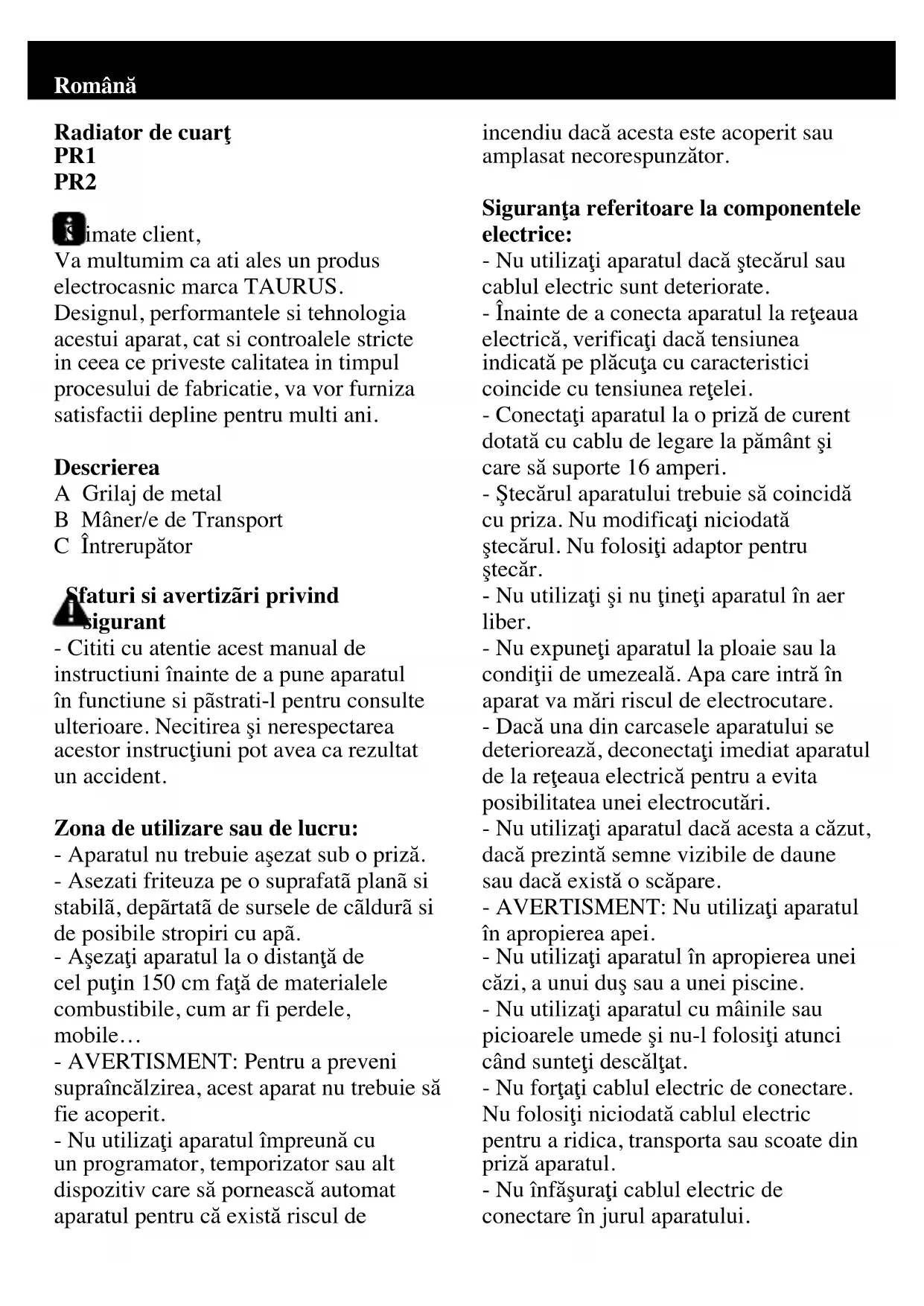 - В соответствии с требованиями по охране окружающей среды, упаковка изготовлена из материалов, предназначенных для вторичной переработки. Если Вы захотите ее выбросить, то можете воспользоваться специальными контейнерами для каждого типа материала. - Ни сам прибор, ни его упаковка не содержат веществ, представляющих опасность для окружающей среды. Прибор изготовлен в соответствии с требованиями Директивы 2006/95/ EC о низком напряжении и Директивы 2004/108/EC об электромагнитной совместимости электрических приборов. Изделия марки TAURUS соответствуют всем требуемым европейским и российским стандартам безопасности и гигиены. В соответствии с законом РФ «О Защите Прав Потребителей», срок службы на продукцию TAURUS устанавливается равным трем годам с момента приобретения. При бережном использовании и соблюдении правил эксплуатации, изделия могут иметь значительно больший срок службы, чем установленный в соответствии с Российским законодательством. - Данный символ означает, что по окончании полезной жизни прибора следует передать его в пункт приема отслуживших электрических и электронных приборов (RAEE) или в руки представителя соответствующей организации. - Данный символ означает, что не следует накрывать прибор во время его работы.Română Radiatordecuarţ PR1 PR2 Stimate client, Va multumim ca ati ales un produs electrocasnic marca TAURUS. Designul, performantele si tehnologia acestui aparat, cat si controalele stricte in ceea ce priveste calitatea in timpul procesului de fabricatie, va vor furniza satisfactii depline pentru multi ani. Descrierea A Grilaj de metal B Mâner/e de Transport C Întrerupător Sfaturi si avertizãri privind sigurant - Cititi cu atentie acest manual de instructiuni înainte de a pune aparatul în functiune si pãstrati-l pentru consulte ulterioare. Necitirea şi nerespectarea acestor instrucţiuni pot avea ca rezultat un accident. Zonadeutilizaresaudelucru: - Aparatul nu trebuie aşezat sub o priză. - Asezati friteuza pe o suprafatã planã si stabilã, depãrtatã de sursele de cãldurã si de posibile stropiri cu apã. - Aşezaţi aparatul la o distanţă de cel puţin 150 cm faţă de materialele combustibile, cum ar fi perdele, mobile… - AVERTISMENT: Pentru a preveni supraîncălzirea, acest aparat nu trebuie să fie acoperit. - Nu utilizaţi aparatul împreună cu un programator, temporizator sau alt dispozitiv care să pornească automat aparatul pentru că există riscul de incendiu dacă acesta este acoperit sau amplasat necorespunzător. Siguranţareferitoarelacomponentele electrice: - Nu utilizaţi aparatul dacă ştecărul sau cablul electric sunt deteriorate. - Înainte de a conecta aparatul la reţeaua electrică, verificaţi dacă tensiunea indicată pe plăcuţa cu caracteristici coincide cu tensiunea reţelei. - Conectaţi aparatul la o priză de curent dotată cu cablu de legare la pământ şi care să suporte 16 amperi. - Ştecărul aparatului trebuie să coincidă cu priza. Nu modificaţi niciodată ştecărul. Nu folosiţi adaptor pentru ştecăr. - Nu utilizaţi şi nu ţineţi aparatul în aer liber. - Nu expuneţi aparatul la ploaie sau la condiţii de umezeală. Apa care intră în aparat va mări riscul de electrocutare. - Dacă una din carcasele aparatului se deteriorează, deconectaţi imediat aparatul de la reţeaua electrică pentru a evita posibilitatea unei electrocutări. - Nu utilizaţi aparatul dacă acesta a căzut, dacă prezintă semne vizibile de daune sau dacă există o scăpare. - AVERTISMENT: Nu utilizaţi aparatul în apropierea apei. - Nu utilizaţi aparatul în apropierea unei căzi, a unui duş sau a unei piscine. - Nu utilizaţi aparatul cu mâinile sau picioarele umede şi nu-l folosiţi atunci când sunteţi descălţat. - Nu forţaţi cablul electric de conectare. Nu folosiţi niciodată cablul electric pentru a ridica, transporta sau scoate din priză aparatul. - Nu înfăşuraţi cablul electric de conectare în jurul aparatului.- Nu lăsaţi cablul electric de conectare agăţat sau îndoit. - Nu permiteţi contactul cablului electric de conectare cu suprafeţele încălzite ale aparatului. - Feriţi aparatul de sursele de căldură şi de marginile ascuţite. - A se verifica starea cablului electric de conexiune. Cablurile deteriorate sau încâlcite cresc riscul de şoc electric. - Se recomandă ca protecţie suplimentară la instalaţia electrică care alimentează aparatul dispunerea de un dispozitiv de curent diferenţial cu o sensibilitate maximă de 30mA. Cereţi sfatul unui instalator competent în acest sens. - Nu atingeţi ştecărul cu mâinile ude. Siguranţapersonală: - Nu utilizaţi aparatul, în cazul persoanelor insensibile la căldură (deoarece aparatul are suprafeţe încălzite). - Aparatul este prevăzut cu dispozitiv de siguranţă care îl închide automat dacă aparatul se află în poziţie necorespunzătoare. Utilizareşiîngrijire: - Înaintea fiecărei utilizări, desf