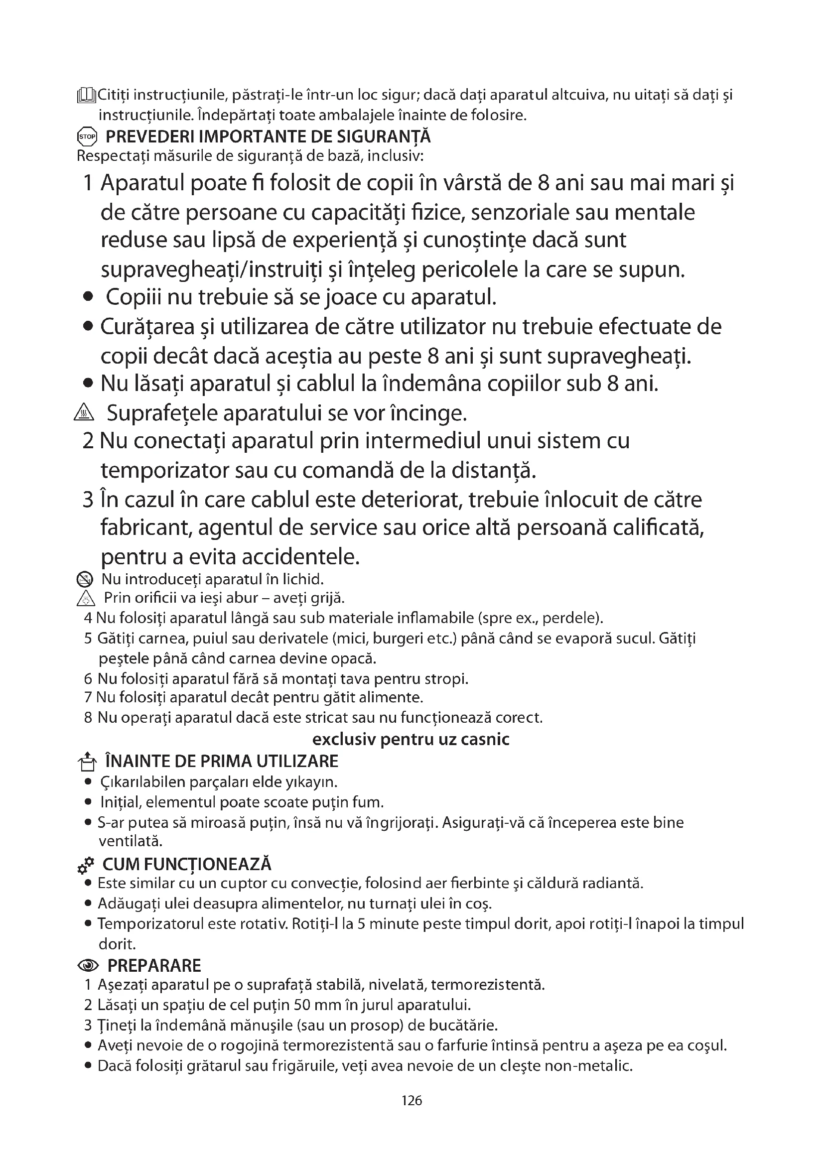 - Nu lăsaţi aparatul și cablul la îndemâna copiilor sub 8 ani. h Suprafeţele aparatului se vor încinge. 2 Nu conectaţi aparatul prin intermediul unui sistem cu temporizator sau cu comandă de la distanţă. 3 În cazul în care cablul este deteriorat, trebuie înlocuit de către fabricant, agentul de service sau orice altă persoană calificată, pentru a evita accidentele. L Nu introduceţi aparatul în lichid. U Prin orificii va ieşi abur – aveţi grijă. 4 Nu folosiţi aparatul lângă sau sub materiale inflamabile (spre ex., perdele). 5 Gătiţi carnea, puiul sau derivatele (mici, burgeri etc.) până când se evaporă sucul. Gătiţi peştele până când carnea devine opacă. 6 Nu folosiţi aparatul fără să montaţi tava pentru stropi. 7 Nu folosiţi aparatul decât pentru gătit alimente. 8 Nu operaţi aparatul dacă este stricat sau nu funcţionează corect. exclusiv pentru uz casnic