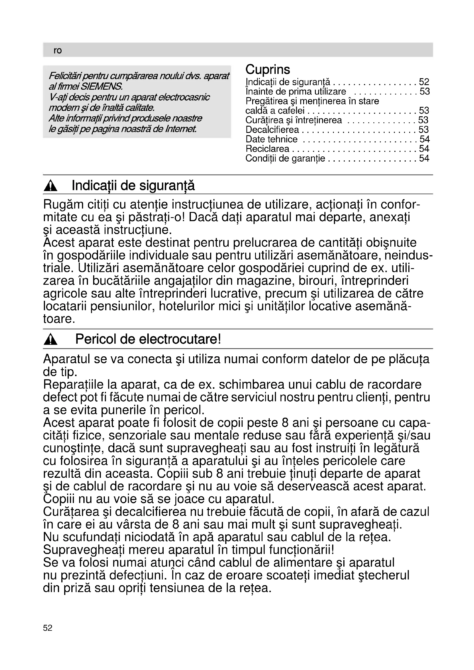 Felicitări pentru cumpărarea noului dvs. aparat al firmei SIEMENS. V-aţi decis pentru un aparat electrocasnic modern şi de înaltă calitate. Alte informaţii privind produsele noastre le găsiţi pe pagina noastră de Internet.53 , Pericol de arsură şi de incendiu! Apucaţi piesele aparatului şi cana de sticlă în timpul funcţionării numai de mânerele prevăzute în acest scop. Nu aşezaţi aparatul pe sau în apropiere de suprafeţe fierbinţi, ca de ex. placa maşinii de gătit. Nu acoperiţi niciodată suprafaţa de aşezare a cănii. , Pericol de sufocare! Nu lăsaţi copii să se joace cu materialul de ambalaj. Aceste instrucţiuni descriu diferite modele: – Modelul de bază (Figura 6a) numai cu comutator Pornit/Oprit,– Modelul (Figura 6b) are un comutator suplimentar pentru alegerea ceştilor,Toate modelele sunt programate cu o oprire automată „auto off” (economie de energie), care opreşte aparatul după cca. 40 minute. Înainte de prima utilizare Se lasă să treacă de două ori câte 9 ceşti de apă, pentru a curăţi aparatul. Poate apare eventual un miros „aparat nou”.În acest caz se lasă să treacă o soluţie diluată de oţet (2 ceşti oţet la 6 ceşti de apă) şi apoi se limpezeşte de două ori cu câte 9 ceşti de apă. Pregătirea şi menţinerea în stare caldă a cafelei Fig. 1–5În rezervor se va pune numai apă curată, în nici un caz lapte sau alte băuturi ca ceai sau cafea (se modifică gustul la următoarea cafea).Introduceţi punga de filtre 1x4 în suportul pentru filtre.Se va folosi cafea cu grad mediu de măcinare (noi recomandăm cca. 7 g de ceaşcă); la mai puţine ceşti se va folosi ceva mai multă cafea de ceaşcă, decât la un număr mai mare de ceşti.Se vor pregăti cel puţin trei ceşti mari, altfel cafeaua nu va avea temperatura şi tăria dorită.= cca. 125 ml = cca. 85 mlPlaca fierbinte se menţine caldă şi un timp după oprire.Automatul de cafea trebuie să se răcească 5 minute înainte de a putea turna apă din nou.Se poate pregăti şi ceai în acest mod. Selectorul pentru ceşti Prin comutarea pe 3–6 (3–6 ceşti) sau 7–10 (7–10 ceşti) se poate selecta tăria şi aroma. Curăţirea şi întreţinerea Pericol de electrocutare Scoateţi ştecherul din priză înainte de cură- ţare. Nu scufundaţi niciodată aparatul în apă şi nu-l puneţi în maşina de spălat vase! Nu folosiţi aparate de curǎţat pe bazǎ de aburi. Toate piesele care intră în contact cu cafeaua trebuie curăţite după fiecare folosire. Resturile influenţează în mod negativ gustul.Toate piesele libere pot fi spălate în maşina de spălat vase; ele nu vor fi poziţionate asupra încălzirii şi nu vor fi prinse (este posibilă defor-marea lor).Carcasa se va şterge umed numai în exterior. Nu se va folosi praf de curăţat. Decalcifierea Aparatul se va decalcifia în mod regulat, cel puţin când– perioada de fierbere se prelungeşte– se produce abur excesiv– aparatul devine mai zgomotos.Mijlocul de decalcifiere se va doza în rezer-vor în conformitate cu indicaţiile producă-torului.Se va lăsa soluţia să stea cca. 5 minute, apoi se porneşte aparatul timp de 1 minut, se opreşte şi se lasă să stea timp de 10 minute. Se va repeta de trei ori (sau mai des, în funcţie de calcifiere). Se va lăsa să treacă restul cantităţii. ro54 Se lasă să treacă de două ori câte 9 ceşti de apă curată. La variantele cu selector de ceşti, în timpul decalcifierii acesta se poziţionează la 3–6 ceşti. Se spală bine toate piesele libere. Recomandări de decalcifiere În cazul în care automatul de cafea se foloseşte zilnic cu apă de tărie normală, el trebuie decalcifiat o dată la 6 săptămâni. Dacă se folosesc mijloace de decalcifiere pe bază de acid acetic sau citric, el trebuie decalcifiat la 3 săptămâni. Date tehnice Reciclarea Acest aparat este marcat corespun- zător directivei europene 2012/19/CE în privinţa aparatelor electrice şi electronice vechi (waste electrical and electronic equipment – WEEE). Directiva prescrie cadrul pentru o preluare înapoi, valabilă în întreaga UE, şi valorificarea aparatelor vechi. Referitor la indicaţiile actuale de reciclare rugăm să vă informaţi la magazinul de specialitate şi la administraţia locală. Condiţii de garanţie Pentru acest aparat sunt valabile Condiţiile de garanţie emise de către reprezentanţa noastră în ţara în care a fost vândut aparatul. Puteţi cere condiţiile de garanţie oricând de la comerciantul de specialitate de la care aţi cumpărat aparatul sau direct la reprezentanţa noastră. Condiţiile de garanţie pentru Germania şi adresele le găsiţi pe dosul paginii caietului. În afară de aceasta condiţiile de garanţie se pot afla şi prin Internet la adresa web menţionată. Pentru revendicarea serviciilor de garanţie este în orice caz necesară prezentarea documen- tului de cumpărare.