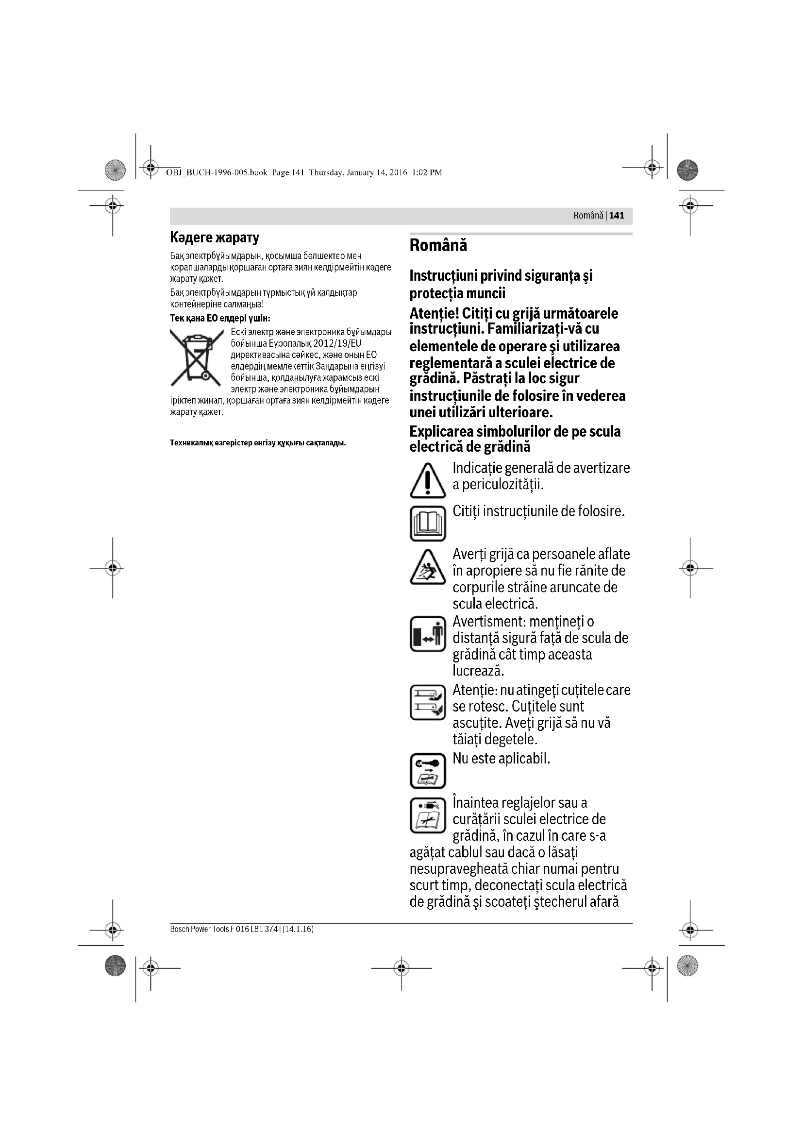 Пышақ шөп арқылы бөгеттеліп тұрБақ электрбұйымын өшіріңіз Бітеулерді жойыңыз (әрқашан арнайы бақ қолғаптарын киіп жүріңіз) Пышақ сомы/пышақ бұрандасы бекітілмеген Пышақ сомын/пышақ бұрандасын бекітіңіз (17 Нм) Қатты вибрациялар/шуылдар Пышақ сомы/пышақ бұрандасы бекітілмеген Пышақ сомын/пышақ бұрандасын бекітіңіз (17 Нм) Пышақ бұзылған Пышақтарды ауыстырыңыз OBJ_BUCH-1996-005.book Page 140 Thursday, January 14, 2016 1:02 PMRomână | 141 Bosch Power Tools F 016 L81 374 | (14.1.16) Кәдеге жарату Бақ электрбұйымдарын, қосымша бөлшектер мен қорапшаларды қоршаған ортаға зиян келдірмейтін кәдеге жарату қажет. Бақ электрбұйымдарын тұрмыстық үй қалдықтар контейнеріне салмаңыз! Тек қана ЕО елдері үшін: Ескі электр және электроника бұйымдары бойынша Еуропалық 2012/19/EU директивасына сәйкес, және оның ЕО елдердің мемлекеттік Заңдарына еңгізуі бойынша, қолданылуға жарамсыз ескі электр және электроника бұйымдарын іріктеп жинап, қоршаған ортаға зиян келдірмейтін кәдеге жарату қажет. Техникалық өзгерістер енгізу құқығы сақталады. Română Instrucţiuni privind siguranţa şi protecţia muncii Atenţie! Citiţi cu grijă următoarele instrucţiuni. Familiarizaţi-vă cu elementele de operare şi utilizarea reglementară a sculei electrice de grădină. Păstraţi la loc sigur instrucţiunile de folosire în vederea unei utilizări ulterioare. Explicarea simbolurilor de pe scula electrică de grădină Indicaţie generală de avertizare a periculozităţii. Citiţi instrucţiunile de folosire. Averţi grijă ca persoanele aflate în apropiere să nu fie rănite de corpurile străine aruncate de scula electrică. Avertisment: menţineţi o distanţă sigură faţă de scula de grădină cât timp aceasta lucrează. Atenţie: nu atingeţi cuţitele care se rotesc. Cuţitele sunt ascuţite. Aveţi grijă să nu vă tăiaţi degetele. Nu este aplicabil. Înaintea reglajelor sau a curăţării sculei electrice de grădină, în cazul în care s-a agăţat cablul sau dacă o lăsaţi nesupravegheată chiar numai pentru scurt timp, deconectaţi scula electrică de grădină şi scoateţi ştecherul afară OBJ_BUCH-1996-005.book Page 141 Thursday, January 14, 2016 1:02 PM142 | Română F 016 L81 374 | (14.1.16) Bosch Power Tools din priza de curent. Ţineţi cablul de alimentare departe de cuţite. Înainte de a atinge scula electrică de grădină, aşteptaţi până când toate componentele acesteia se opresc complet. Cuţitele continuă să se se mai rotească şi după deconectarea sculei electrice de grădină, putând cauza răniri. Nu folosiţi scula electrică de grădină pe timp de ploaie şi nu o expuneţi acţiunii ploii. Protejaţi-vă împotriva electrocutării. Ţineţi cablul de racordare departe de cuţitele de tăiere. Manevrare Nu permiteţi niciodată copiilor sau persoanelor nefamiliarizate cu prezentele instrucţiuni, să folosească scula electrică de grădină. Este posibil ca normele naţionale să limiteze vârsta operatorului. În caz de nefolosire, păstraţi scula electrică de grădină la loc inaccesibil copiilor. Această sculă electrică de grădină nu este destinată utilizării de către persoane (inclusiv copii) cu deficiente senzoriale sau intelectuale sau cu o experienţă insuficientă şi/sau cunoştinţe insuficiente, în afara cazului în care se află sub supravegherea unei persoane răspunzătoare de siguranţa lor sau primesc îndrumări de la aceasta, cu privire la utilizarea sculei electrice de grădină. Copiii trebuie supravegheaţi pentru a ne asigura că aceştia nu se joacă cu scula electrică de grădină. În nici un caz nu cosiţi atunci când în imediata apropiere staţionează persoane, în special copii sau animale de casă. Operatorul sau utilizatorul este ţinut răspunzător pentru accidente sau pagube provocate altor oameni sau bunurilor acestora. Nu folosiţi scula electrică de grădină dacă sunteţi desculţi sau încălţaţi cu sandale deschise. Purtaţi încălţăminte solidă şi pantaloni lungi. Inspectaţi atent suprafaţa pe care urmează să o lucraţi şi îndepărtaţi cu grijă pietrele, beţele, sârmele, oasele şi alte corpuri străine. Înainte de utilizare verificaţi vizual întotdeauna dacă, cuţitele, şuruburile cuţitelor cât şi blocul de cuţite nu sunt uzate sau deteriorate. Pentru evitarea dezechilibrelor, înlocuiţi întotdeauna întregul set de cuţite şi şuruburi de cuţite uzate sau deteriorate. Cosiţi numai la lumina zilei sau la lumină artificială bună. În condiţii meteo nefavorabile în special în caz de furtună, nu lucraţi cu maşina de tuns iarba. Pe cât posibil nu folosiţi scula electrică de grădină la tunderea ierbii ude. Păşiţi întotdeauna încet, nu alergaţi niciodată repede. Nu folosiţi în niciun caz scula electrică de grădină în cazul în care aceasta prezintă dispozitive de protecţie, OBJ_BUCH-1996-005.book Page 142 Thursday, January 14, 2016 1:02 PMRomână | 143 Bosch Power Tools F 016 L81 374 | (14.1.16) capace defecte sau echipamente de siguranţă care lipsesc, ca de exemplu bara de protecţie sau coşul colector de iarbă. Purtaţi protecţii auditive. Cosirea ierbii pe taluzuri poate fi periculoasă. – Nu