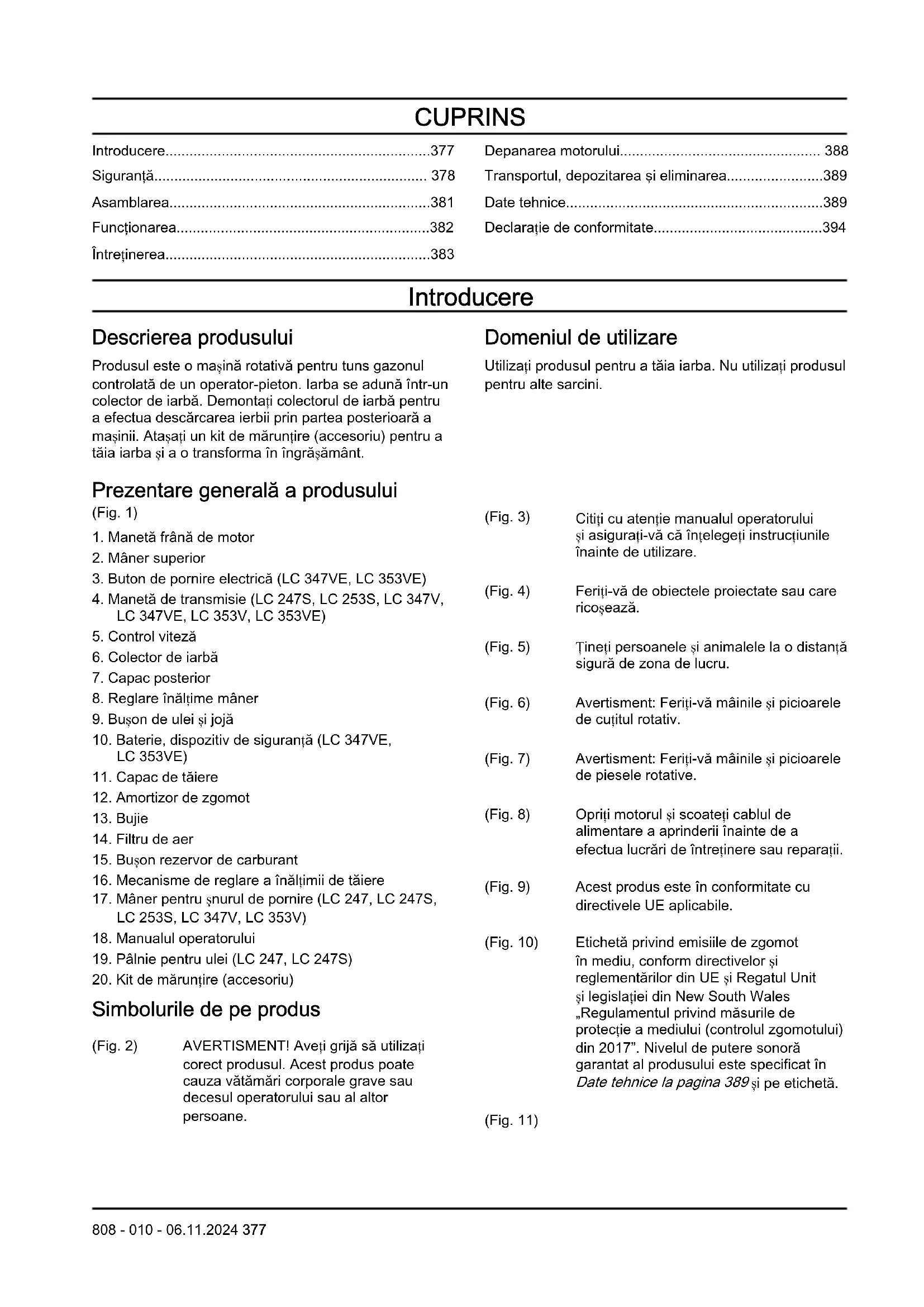 Simbolurile de pe produs (Fig. 2) AVERTISMENT! Aveți grijă să utilizați corect produsul. Acest produs poate cauza vătămări corporale grave sau decesul operatorului sau al altor persoane. (Fig. 3) Citiți cu atenție manualul operatorului și asigurați-vă că înțelegeți instrucțiunile înainte de utilizare. (Fig. 4) Feriți-vă de obiectele proiectate sau care ricoșează. (Fig. 5) Țineți persoanele și animalele la o distanță sigură de zona de lucru. (Fig. 6) Avertisment: Feriți-vă mâinile și picioarele de cuțitul rotativ. (Fig. 7) Avertisment: Feriți-vă mâinile și picioarele de piesele rotative. (Fig. 8) Opriți motorul și scoateți cablul de alimentare a aprinderii înainte de a efectua lucrări de întreținere sau reparații. (Fig. 9) Acest produs este în conformitate cu directivele UE aplicabile. (Fig. 10) Etichetă privind emisiile de zgomot în mediu, conform directivelor și reglementărilor din UE și Regatul Unit și legislației din New South Wales „Regulamentul privind măsurile de protecție a mediului (controlul zgomotului) din 2017”. Nivelul de putere sonoră garantat al produsului este specificat în Date tehnice la pagina 389 și pe etichetă. (Fig. 11)
