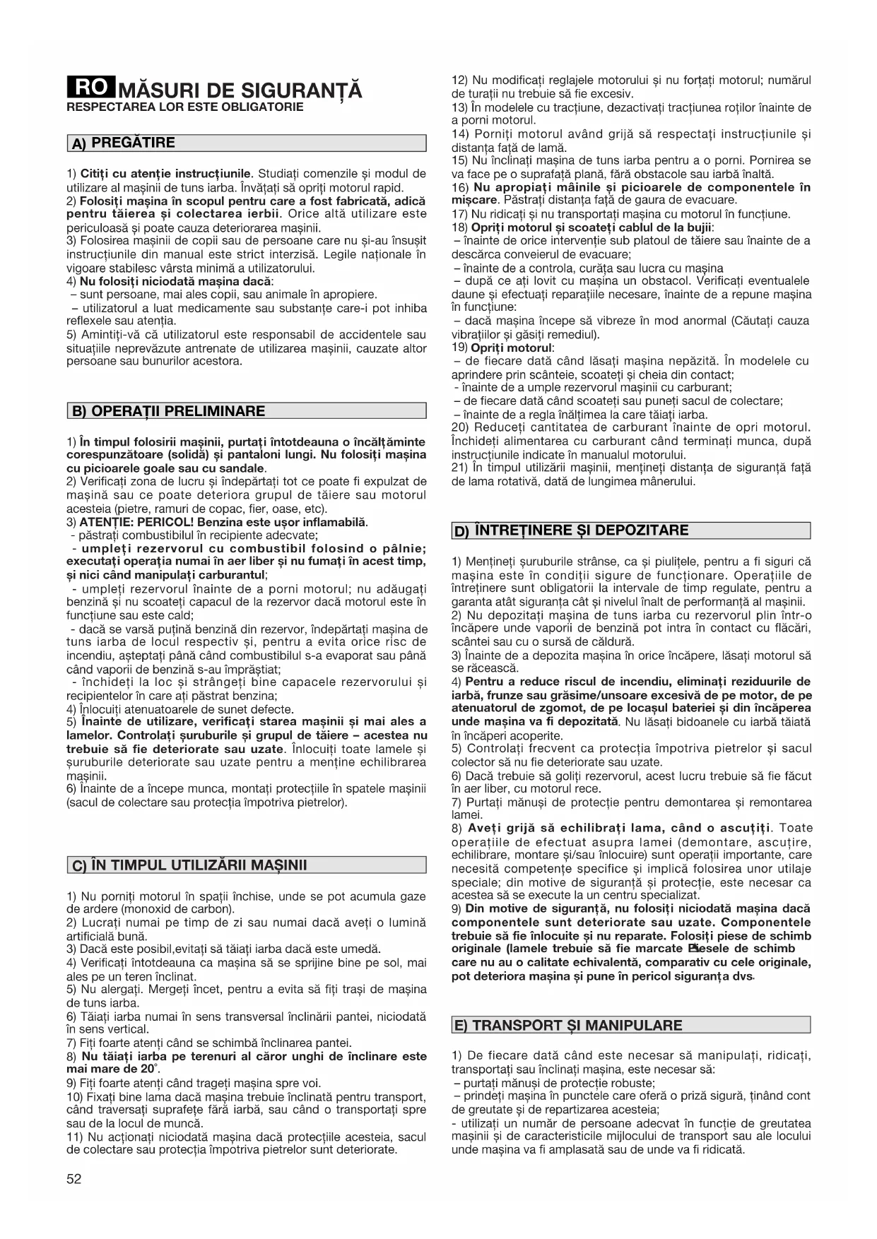 – înainte de orice intervenţie sub platoul de tăiere sau înainte de a descărca conveierul de evacuare; – înainte de a controla, curăţa sau lucra cu mașina – după ce aţi lovit cu mașina un obstacol. Verificaţi eventualele daune și efectuaţi reparaţiile necesare, înainte de a repune mașina în funcţiune: – dacă mașina începe să vibreze în mod anormal (Căutaţi cauza vibraţiilor și găsiţi remediul). 19) Opriţi motorul: – de fiecare dată când lăsaţi mașina nepăzită. În modelele cu aprindere prin scânteie, scoateţi și cheia din contact; - înainte de a umple rezervorul mașinii cu carburant; – de fiecare dată când scoateţi sau puneţi sacul de colectare; – înainte de a regla înălţimea la care tăiaţi iarba.