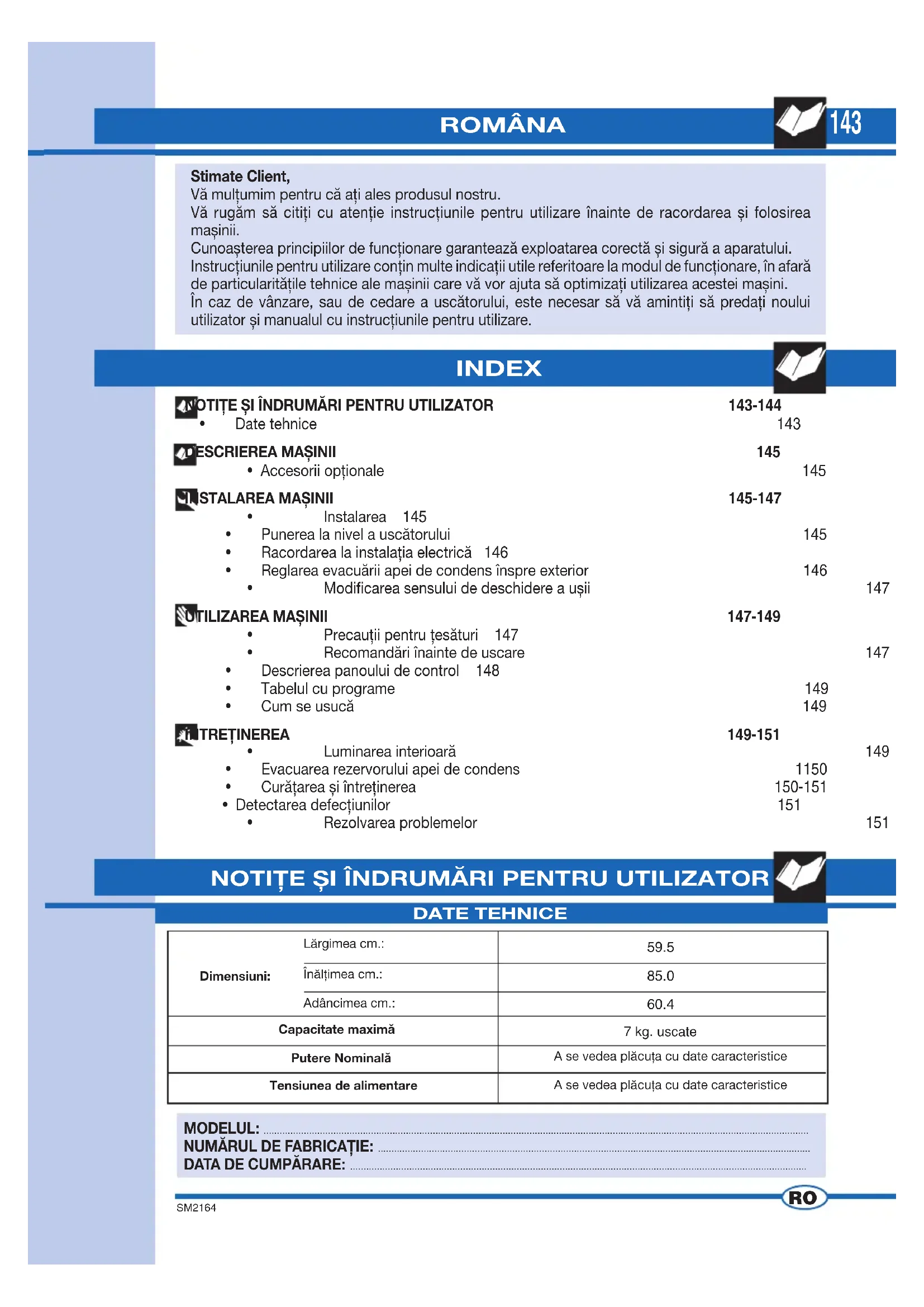INDEX MODELUL: ........................................................................................................................................................................................................... NUMĂRUL DE FABRICAŢIE: ................................................................................................................................................................. DATA DE CUMPĂRARE: .......................................................................................................................................................................... ROMÂNA Stimate Client, Vă mulţumim pentru că aţi ales produsul nostru. Vă rugăm să citiţi cu atenţie instrucţiunile pentru utilizare înainte de racordarea și folosirea mașinii. Cunoașterea principiilor de funcţionare garantează exploatarea corectă și sigură a aparatului. Instrucţiunile pentru utilizare conţin multe indicaţii utile referitoare la modul de funcţionare, în afară de particularităţile tehnice ale mașinii care vă vor ajuta să optimizaţi utilizarea acestei mașini. În caz de vânzare, sau de cedare a uscătorului, este necesar să vă amintiţi să predaţi noului utilizator și manualul cu instrucţiunile pentru utilizare. NOTIŢE ȘI ÎNDRUMĂRI PENTRU UTILIZATOR 143-144