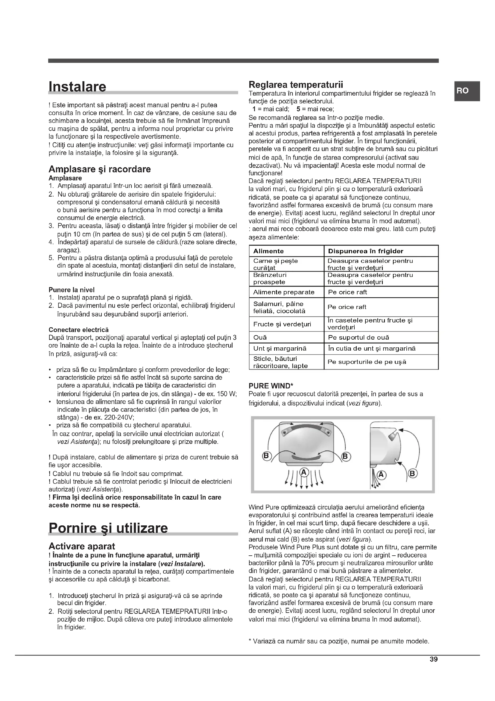 Instalare ! Este important să păstraţi acest manual pentru a-l putea consulta în orice moment. În caz de vânzare, de cesiune sau de schimbare a locuinţei, acesta trebuie să e înmânat împreună cu maşina de spălat, pentru a informa noul proprietar cu privire la funcţionare şi la respectivele avertismente. ! Citiţi cu atenţie instrucţiunile: veţi găsi informaţii importante cu privire la instalaţie, la folosire şi la siguranţă. Amplasare şi racordare Amplasare1. Amplasaţi aparatul într-un loc aerisit şi fără umezeală.2. Nu obturaţi grătarele de aerisire din spatele frigiderului: compresorul şi condensatorul emană căldură şi necesită o bună aerisire pentru a funcţiona în mod corectşi a limita consumul de energie electrică.3. Pentru aceasta, lăsaţi o distanţă între frigider şi mobilier de cel puţin 10 cm (în partea de sus) şi de cel puţin 5 cm (lateral).4. Îndepărtaţi aparatul de sursele de căldură.(raze solare directe, aragaz).5. Pentru a păstra distanţa optimă a produsului faţă de peretele din spate al acestuia, montaţi distanţierii din setul de instalare, urmărind instrucţiunile din foaia anexată.Punere la nivel1. Instalaţi aparatul pe o suprafaţă plană şi rigidă.2. Dacă pavimentul nu este perfect orizontal, echilibraţi frigiderul înşurubând sau deşurubând suporţii anteriori.Conectare electricăDupă transport, poziţionaţi aparatul vertical şi aşteptaţi cel puţin 3 ore înainte de a-l cupla la reţea. Înainte de a introduce ştecherul în priză, asiguraţi-vă ca:• priza să e cu împământare şi conform prevederilor de lege;• caracteristicile prizei să e astfel încât să suporte sarcina de putere a aparatului, indicată pe tăbliţa de caracteristici din interiorul frigiderului (în partea de jos, din stânga) - de ex. 150 W;• tensiunea de alimentare să e cuprinsă în rangul valorilor indicate în plăcuţa de caracteristici (din partea de jos, în stânga) - de ex. 220-240V;• priza să e compatibilă cu ştecherul aparatului. În caz contrar, apelaţi la serviciile unui electrician autorizat ( vezi Asistenţa); nu folosiţi prelungitoare şi prize multiple.! După instalare, cablul de alimentare şi priza de curent trebuie să e uşor accesibile.! Cablul nu trebuie să e îndoit sau comprimat.! Cablul trebuie să e controlat periodic şi înlocuit de electricieni autorizaţi (vezi Asistenţa).! Firma îşi declină orice responsabilitate în cazul în care aceste norme nu se respectă. Pornire şi utilizare Activare aparat ! Înainte de a pune în funcţiune aparatul, urmăriţi instrucţiunile cu privire la instalare (vezi Instalare). ! Înainte de a conecta aparatul la reţea, curăţaţi compartimentele şi accesoriile cu apă călduţă şi bicarbonat.1. Introduceţi ştecherul în priză şi asiguraţi-vă că se aprinde becul din frigider.2. Rotiţi selectorul pentru REGLAREA TEMEPRATURII într-o poziţie de mijloc. După câteva ore puteţi introduce alimentele în frigider. Reglarea temperaturii Temperatura în interiorul compartimentului frigider se reglează în funcţie de poziţia selectorului. 1 = mai cald; 5 = mai rece;Se recomandă reglarea sa într-o poziţie medie.Pentru a mări spaţiul la dispoziţie şi a îmbunătăţi aspectul estetic al acestui produs, partea refrigerentă a fost amplasată în peretele posterior al compartimentului frigider. În timpul funcţionării, peretele va acoperit cu un strat subţire de brumă sau cu picături mici de apă, în funcţie de starea compresorului (activat sau dezactivat). Nu vă impacientaţi! Acesta este modul normal de funcţionare!Dacă reglaţi selectorul pentru REGLAREA TEMPERATURII la valori mari, cu frigiderul plin şi cu o temperatură exterioară ridicată, se poate ca şi aparatul să funcţioneze continuu, favorizând astfel formarea excesivă de brumă (cu consum mare de energie). Evitaţi acest lucru, reglând selectorul în dreptul unor valori mai mici (frigiderul va elimina bruma în mod automat). : aerul mai rece coboară deoarece este mai greu. Iată cum puteţi aşeza alimentele: Alimente Dispunerea în frigider Carne şi peşte curăţat Deasupra casetelor pentru fructe şi verdeţuri Brânzeturi proaspete Deasupra casetelor pentru fructe şi verdeţuri Alimente preparate Pe orice raft Salamuri, pâine feliată, ciocolată Pe orice raft Fructe şi verdeţuri În casetele pentru fructe şi verdeţuri Ouă Pe suportul de ouă Unt şi margarină În cutia de unt şi margarină Sticle, băuturi răcoritoare, lapte Pe suporturile de pe uşă PURE WIND* Poate uşor recuoscut datorită prezenţei, în partea de sus a frigiderului, a dispozitivului indicat (vezi gura).