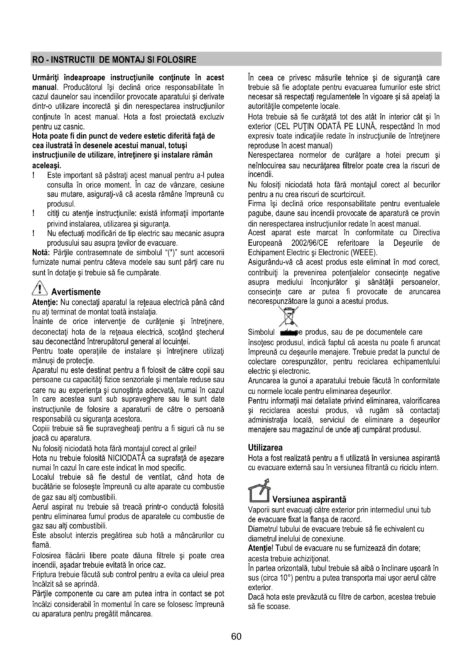W przypadku, gdy oś wietlenie nie działa należy najpierw sprawdzić, czy lampki zostały prawidłowo zamontowane. Jeżeli po przeprowadzeniu takiej kontroli oświetlenie nadal nie działa, należy zwrócić się do serwisu.60 RO - INSTRUCTII DE MONTAJ SI FOLOSIRE Urmăriţi îndeaproape instrucţiunile conţinute în acest manual. Producătorul îşi declină orice responsabilitate în cazul daunelor sau incendiilor provocate aparatului şi derivate dintr-o utilizare incorectă şi din nerespectarea instrucţiunilor conţinute în acest manual. Hota a fost proiectată excluziv pentru uz casnic. Hota poate fi din punct de vedere estetic diferită faţă de cea ilustrată în desenele acestui manual, totuşi instrucţiunile de utilizare, întreţinere şi instalare rămân aceleaşi. ! Este important să păstraţi acest manual pentru a-l putea consulta în orice moment. În caz de vânzare, cesiune sau mutare, asiguraţi-vă că acesta rămâne împreună cu produsul. ! citiţi cu atenţie instrucţiunile: există informaţii importante privind instalarea, utilizarea şi siguranţa. ! Nu efectuaţi modificări de tip electric sau mecanic asupra produsului sau asupra ţevilor de evacuare. Notă: Părţile contrasemnate de simbolul “(*)” sunt accesorii furnizate numai pentru câteva modele sau sunt părţi care nu sunt în dotaţie şi trebuie să fie cumpărate. Avertismente Atenţie: Nu conectaţi aparatul la reţeaua electrică până când nu aţi terminat de montat toată instalaţia. Înainte de orice intervenţie de curăţenie şi întreţinere, deconectaţi hota de la reţeaua electrică, scoţând ştecherul sau deconectând întrerupătorul general al locuinţei. Pentru toate operaţiile de instalare și întreţinere utilizaţi mănuși de protecţie. Aparatul nu este destinat pentru a fi folosit de către copii sau persoane cu capacităţi fizice senzoriale şi mentale reduse sau care nu au experienţa şi cunoştinţa adecvată, numai în cazul în care acestea sunt sub supraveghere sau le sunt date instrucţiunile de folosire a aparaturii de către o persoană responsabilă cu siguranţa acestora. Copiii trebuie să fie supravegheaţi pentru a fi siguri că nu se joacă cu aparatura. Nu folosiţi niciodată hota fără montajul corect al grilei! Hota nu trebuie folosită NICIODATĂ ca suprafaţă de aşezare numai în cazul în care este indicat în mod specific. Localul trebuie să fie destul de ventilat, când hota de bucătărie se foloseşte împreună cu alte aparate cu combustie de gaz sau alţi combustibili. Aerul aspirat nu trebuie să treacă printr-o conductă folosită pentru eliminarea fumul produs de aparatele cu combustie de gaz sau alţi combustibili. Este absolut interzis pregătirea sub hotă a mâncărurilor cu flamă. Folosirea flăcării libere poate dăuna filtrele şi poate crea incendii, aşadar trebuie evitată în orice caz. Friptura trebuie făcută sub control pentru a evita ca uleiul prea încălzit să se aprindă. Părţile componente cu care am putea intra in contact se pot încălzi considerabil în momentul în care se folosesc împreună cu aparatura pentru pregătit mâncarea. În ceea ce privesc măsurile tehnice şi de siguranţă care trebuie să fie adoptate pentru evacuarea fumurilor este strict necesar să respectaţi regulamentele în vigoare şi să apelaţi la autorităţile competente locale. Hota trebuie să fie curăţată tot des atât în interior cât şi în exterior (CEL PUŢIN ODATĂ PE LUNĂ, respectând în mod expresiv toate indicaţiile redate în instrucţiunile de întreţinere reproduse în acest manual) Nerespectarea normelor de curăţare a hotei precum şi neînlocuirea sau necurăţarea filtrelor poate crea la riscuri de incendii. Nu folosiţi niciodată hota fără montajul corect al becurilor pentru a nu crea riscuri de scurtcircuit. Firma îşi declină orice responsabilitate pentru eventualele pagube, daune sau incendii provocate de aparatură ce provin din nerespectarea instrucţiunilor redate în acest manual. Acest aparat este marcat în conformitate cu Directiva Europeană 2002/96/CE referitoare la Deşeurile de Echipament Electric şi Electronic (WEEE). Asigurându-vă că acest produs este eliminat în mod corect, contribuiţi la prevenirea potenţialelor consecinţe negative asupra mediului înconjurător şi sănătăţii persoanelor, consecin ţe care ar putea fi provocate de aruncarea necorespunzătoare la gunoi a acestui produs. Simbolul de pe produs, sau de pe documentele care însoţesc produsul, indică faptul că acesta nu poate fi aruncat împreună cu deşeurile menajere. Trebuie predat la punctul de colectare corespunzător, pentru reciclarea echipamentului electric şi electronic. Aruncarea la gunoi a aparatului trebuie făcută în conformitate cu normele locale pentru eliminarea deşeurilor. Pentru informaţii mai detaliate privind eliminarea, valorificarea şi reciclarea acestui produs, vă rugăm să contactaţi administraţia locală, serviciul de eliminare a deşeurilor menajere sau magazinul de unde aţi cumpărat produsul. Utilizarea Hota a fost realizată pentru a fi utilizată în versiunea aspirantă cu evacuare externă sau în versiunea filtrantă cu riciclu intern. Versiunea aspirantă Vaporii sunt evacuaţi către exterior prin intermediul unui tub de evacuare fixat la flanşa de racord. Diametrul tubului de evacuare trebuie să fie echivalent cu diametrul inelului de conexiune. Atenţie! Tubul de evacuare nu se furnizează din dotare; acesta trebuie achiziţionat. În partea orizontală, tubul trebuie să aibă o înclinare uşoară în sus (circa 10°) pentru a putea transporta mai uşor aerul către exterior. Dacă hota este prevăzută cu filtre de carbon, acestea trebuie să fie scoase.61 Racordaţi hota la cablurile şi orificiile de evacuare prin perete cu diametru egal cu ieşirea aerului (flanşa de record). Utilizarea tuburilor şi orificiilor de evacuare la 