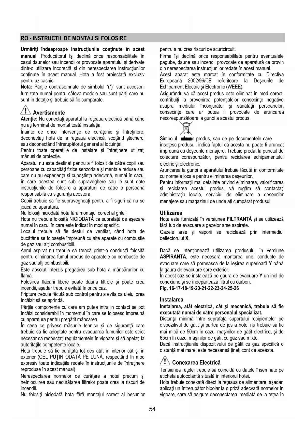 Niektóre modele są wyposażone w boczne oświetlenie: Do wymiany należy użyć żarówek o takim samym kształcie i mocy wynoszącej max 40W (E14). Aby dostać się do gniazda żarówek należy usunąć pokrywę A. W przypadku, gdy oświetlenie nie działa należy najpierw sprawdzić, czy lampki zostały prawidłowo zamontowane. Jeżeli po przeprowadzeniu takiej kontroli oświetlenie nadal nie działa, należy zwrócić się do serwisu.54 RO - INSTRUCTII DE MONTAJ SI FOLOSIRE Urmăriţi îndeaproape instrucţiunile conţinute în acest manual. Producătorul îşi declină orice responsabilitate în cazul daunelor sau incendiilor provocate aparatului şi derivate dintr-o utilizare incorectă şi din nerespectarea instrucţiunilor conţinute în acest manual. Hota a fost proiectată excluziv pentru uz casnic. Notă: Părţile contrasemnate de simbolul “(*)” sunt accesorii furnizate numai pentru câteva modele sau sunt părţi care nu sunt în dotaţie şi trebuie să fie cumpărate. Avertismente Atenţie: Nu conectaţi aparatul la reţeaua electrică până când nu aţi terminat de montat toată instalaţia. Înainte de orice intervenţie de curăţenie şi întreţinere, deconectaţi hota de la reţeaua electrică, scoţând ştecherul sau deconectând întrerupătorul general al locuinţei. Pentru toate operaţiile de instalare și întreţinere utilizaţi mănuși de protecţie. Aparatul nu este destinat pentru a fi folosit de către copii sau persoane cu capacităţi fizice senzoriale şi mentale reduse sau care nu au experienţa şi cunoştinţa adecvată, numai în cazul în care acestea sunt sub supraveghere sau le sunt date instrucţiunile de folosire a aparaturii de către o persoană responsabilă cu siguranţa acestora. Copiii trebuie să fie supravegheaţi pentru a fi siguri că nu se joacă cu aparatura. Nu folosiţi niciodată hota fără montajul corect al grilei! Hota nu trebuie folosită NICIODATĂ ca suprafaţă de aşezare numai în cazul în care este indicat în mod specific. Localul trebuie să fie destul de ventilat, când hota de bucătărie se foloseşte împreună cu alte aparate cu combustie de gaz sau alţi combustibili. Aerul aspirat nu trebuie să treacă printr-o conductă folosită pentru eliminarea fumul produs de aparatele cu combustie de gaz sau alţi combustibili. Este absolut interzis pregătirea sub hotă a mâncărurilor cu flamă. Folosirea flăcării libere poate dăuna filtrele şi poate crea incendii, aşadar trebuie evitată în orice caz. Friptura trebuie făcută sub control pentru a evita ca uleiul prea încălzit să se aprindă. Părţile componente cu care am putea intra in contact se pot încălzi considerabil în momentul în care se folosesc împreună cu aparatura pentru pregătit mâncarea. În ceea ce privesc măsurile tehnice şi de siguranţă care trebuie să fie adoptate pentru evacuarea fumurilor este strict necesar să respectaţi regulamentele în vigoare şi să apelaţi la autorităţile competente locale. Hota trebuie să fie curăţată tot des atât în interior cât şi în exterior (CEL PUŢIN ODATĂ PE LUNĂ, respectând în mod expresiv toate indicaţiile redate în instrucţiunile de întreţinere reproduse în acest manual) Nerespectarea normelor de curăţare a hotei precum şi neînlocuirea sau necurăţarea filtrelor poate crea la riscuri de incendii. Nu folosiţi niciodată hota fără montajul corect al becurilor pentru a nu crea riscuri de scurtcircuit. Firma îşi declină orice responsabilitate pentru eventualele pagube, daune sau incendii provocate de aparatură ce provin din nerespectarea instrucţiunilor redate în acest manual. Acest aparat este marcat în conformitate cu Directiva Europeană 2002/96/CE referitoare la Deşeurile de Echipament Electric şi Electronic (WEEE). Asigurându-vă că acest produs este eliminat în mod corect, contribuiţi la prevenirea potenţialelor consecinţe negative asupra mediului înconjurător şi sănătăţ ii persoanelor, consecinţe care ar putea fi provocate de aruncarea necorespunzătoare la gunoi a acestui produs. Simbolul de pe produs, sau de pe documentele care însoţesc produsul, indică faptul că acesta nu poate fi aruncat împreună cu deşeurile menajere. Trebuie predat la punctul de colectare corespunzător, pentru reciclarea echipamentului electric şi electronic. Aruncarea la gunoi a aparatului trebuie făcută în conformitate cu normele locale pentru eliminarea deşeurilor. Pentru informaţii mai detaliate privind eliminarea, valorificarea şi reciclarea acestui produs, vă rugăm să contactaţi administraţia locală, serviciul de eliminare a deşeurilor menajere sau magazinul de unde aţi cumpărat produsul. Utilizarea Hota este furnizată în versiunea FILTRANTĂ şi se utilizează fără tub de evacuare a gazelor arse aspirate. Gazele arse şi vaporii se reciclează prin intermediul deflectorului X. Dacă se intenţionează utilizarea produsului în versiune ASPIRANTĂ, este necesară montarea unei conducte de evacuare care să pornească de la ieşirea superioară Y până la gaura de evacuare spre exterior. În acest caz se instalează pe gaura de evacuare Y un inel de conexiune şi se îndepărtează filtrul cu carbon. Fig. 16-17-18-19-20-21-22-23-24-25-26 Instalarea Instalarea, atât electrică, cât şi mecanică, trebuie să fie executată numai de către personalul specializat. Distanţa minimă între suprafaţa suportului recipientelor pe dispozitivul de gătit şi partea de jos a hotei nu trebuie să fie mai mică de 50cm în cazul maşinilor de gătit electrice, şi de 65cm în cazul maşinilor de gătit cu gaz sau mixte. Dacă instrucţiiunile dispozitivului de gătit cu gaz specifică o distanţă mai mare, este necesar să ţineţi cont de aceasta. Conexarea Electrică Tensiunea reţelei trebuie să coincidă cu datele însemnate pe eticheta autocolantă situată în interiorul hotei. Hota trebuie conexată direct la reţeau