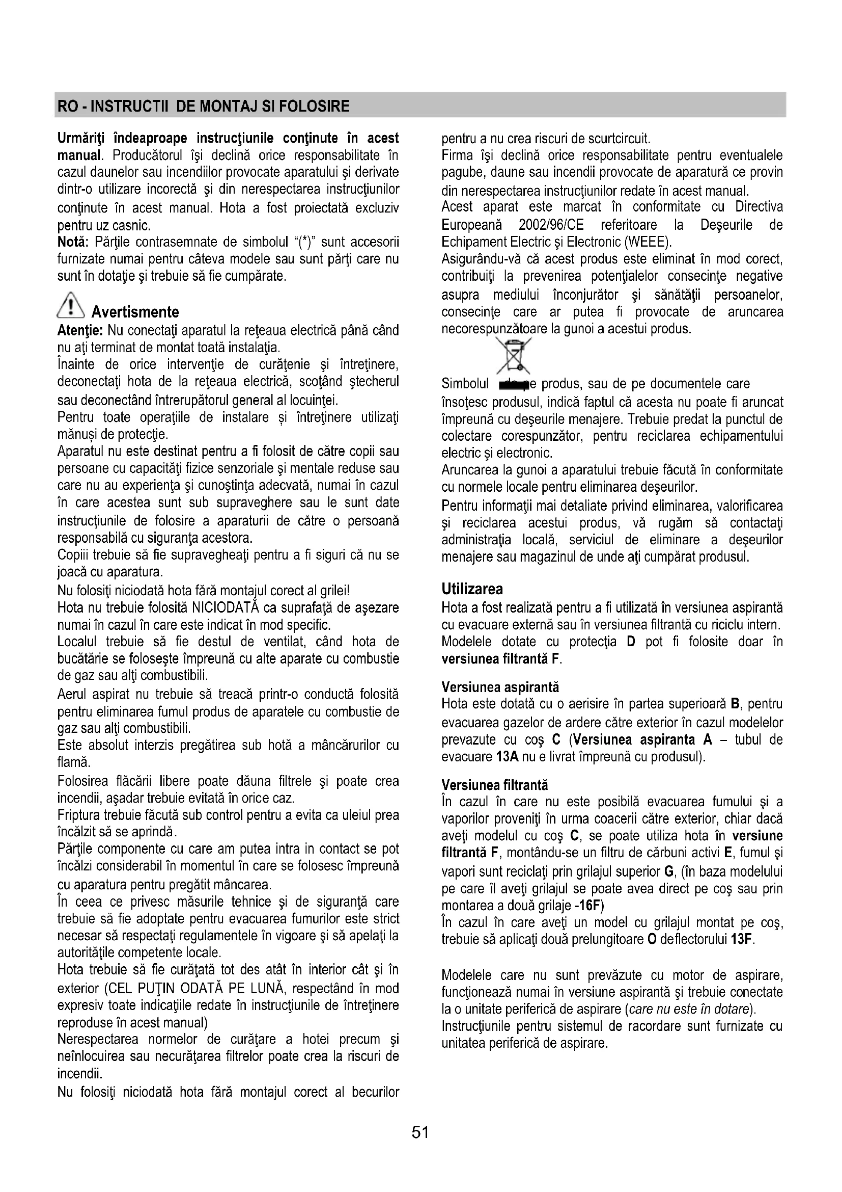trebuie să aplicaţi două prelungitoare O deflectorului 13F. Modelele care nu sunt prevăzute cu motor de aspirare, funcţionează numai în versiune aspirantă şi trebuie conectate la o unitate periferică de aspirare (care nu este în dotare). Instrucţiunile pentru sistemul de racordare sunt furnizate cu unitatea periferică de aspirare.52 Instalarea Distanţa minimă între suprafaţa suportului recipientelor pe dispozitivul de gătit şi partea de jos a hotei nu trebuie să fie mai mică de 60cm în cazul maşinilor de gătit electrice, şi de 70cm în cazul maşinilor de gătit cu gaz sau mixte. Dacă instrucţiiunile dispozitivului de gătit cu gaz specifică o distanţă mai mare, este necesar să ţineţi cont de aceasta. Conexarea Electrică Tensiunea din reţea trebuie să corespundă cu tensiunea la care se referă eticheta situată în interiorul hotei. Dacă este prevăzută cu ştecher conectaţi hota la o priză conform cu normele în vigoare, poziţionată într-o zona accesibilă şi după instalare. Dacă nu este prevăzută cu ştecher (conexiunea este direct la reţea) sau ştecherul nu este poziţionat într-o zonă accesibilă şi după instalare, aplicaţi un întrerupător bipolar la normă care să asigure deconectarea completă de la reţea în condiţiile categoriei de supratensiune III, conform regulilor de instalare. Atenţie! înainte de a efectua conectarea circuitului hotei la alimentaţia din reţea şi de a verifica funcţionarea corectă, controlaţi totdeauna dacă cablul a fost montat în mod corect. Montarea Hota este dotată cu dibluri de fixare adecvate pentru toţi pereţi/ tavane. Este necesar, totuşi, să cereţi parerea unui tehnician specialist pentru a se asigura de calitatea materialelor şi felul de perete sau tavan. Peretele/tavanul trebuie să fie destul de gros pentru a putea susţine gretutatea hotei. Funcţionarea Hota este prevăzută cu un panou de control ce se află pe partea anterioară a hotei, cu taste sau butoane, în baza tipului de model pe care îl aveţi consultaţi, pentru funcţionare, textul de mai jos precum şi desenul corespunzător. Se recomandă o viteza crescută, în special în cazul unei concentraţii mari de vapori în bucătărie. Vă sfătuim să o lăsaţi să aspire 5 minute înainte de a demara procesul de coacere şi de a o lăsa în funcţiune, la închiderea procesului de coacere, pentru încă 15 minute (aproximativ). Funcţionarea - Model cu Panou de comandă Descrierea panoului de control şi funcţionarea hotei