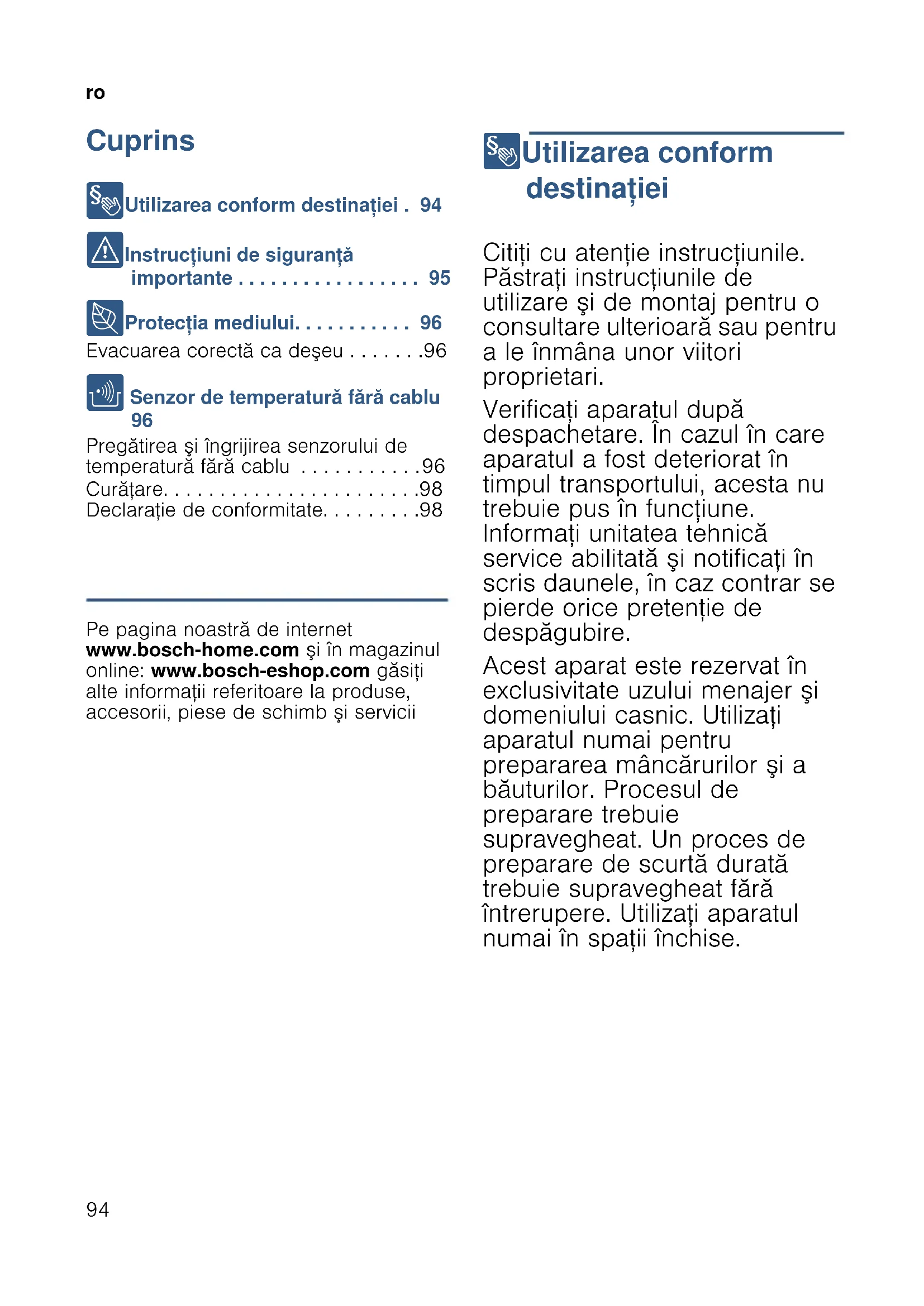 Pregătirea şi îngrijirea senzorului de temperatură fără cablu . . . . . . . . . . .96 Curăţare. . . . . . . . . . . . . . . . . . . . . . .98 Declaraţie de conformitate. . . . . . . . .98 Informaţii despre produs Pe pagina noastră de internet www.bosch-home.com şi în magazinul online: www.bosch-eshop.com găsiţi alte informaţii referitoare la produse, accesorii, piese de schimb şi servicii 8 Utilizarea conform destinaţiei De s t i n a ţ ia de utilizare Citiţi cu atenţie instrucţiunile. Păstraţi instrucţiunile de utilizare şi de montaj pentru o consultare ulterioară sau pentru a le înmâna unor viitori proprietari. Verificaţi aparatul după despachetare. În cazul în care aparatul a fost deteriorat în timpul transportului, acesta nu trebuie pus în funcţiune. Informaţi unitatea tehnică service abilitată şi notificaţi în scris daunele, în caz contrar se pierde orice pretenţie de despăgubire. Acest aparat este rezervat în exclusivitate uzului menajer şi domeniului casnic. Utilizaţi aparatul numai pentru prepararea mâncărurilor şi a băuturilor. Procesul de preparare trebuie supravegheat. Un proces de preparare de scurtă durată trebuie supravegheat fără întrerupere. Utilizaţi aparatul numai în spaţii închise.ro