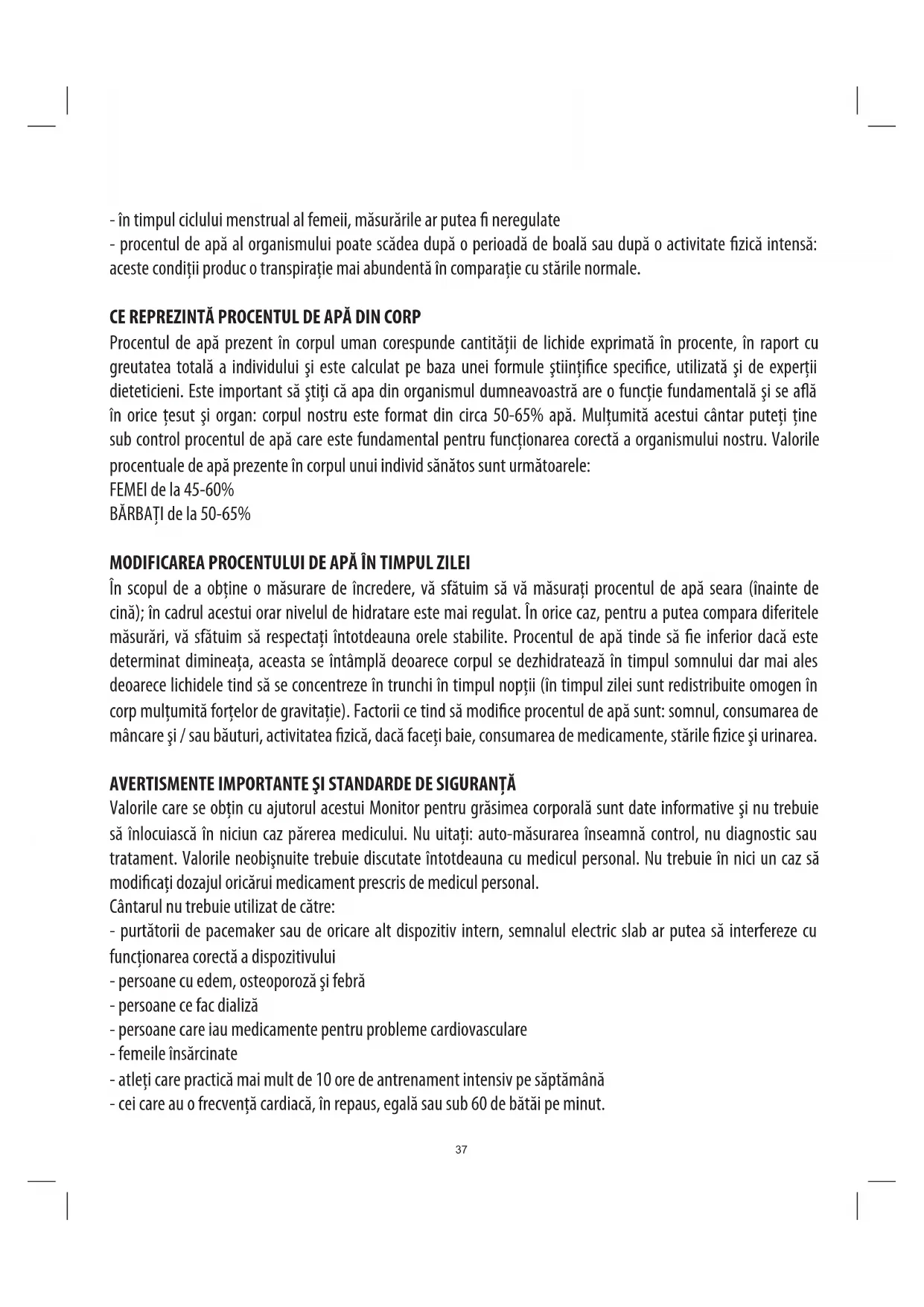 Valorile care se obţin cu ajutorul acestui Monitor pentru grăsimea corporală sunt date informative şi nu trebuie să înlocuiască în niciun caz părerea medicului. Nu uitaţi: auto-măsurarea înseamnă control, nu diagnostic sau tratament. Valorile neobişnuite trebuie discutate întotdeauna cu medicul personal. Nu trebuie în nici un caz să modicaţi dozajul oricărui medicament prescris de medicul personal. Cântarul nu trebuie utilizat de către: - purtătorii de pacemaker sau de oricare alt dispozitiv intern, semnalul electric slab ar putea să interfereze cu funcţionarea corectă a dispozitivului - persoane cu edem, osteoporoză şi febră - persoane ce fac dializă - persoane care iau medicamente pentru probleme cardiovasculare - femeile însărcinate - atleţi care practică mai mult de 10 ore de antrenament intensiv pe săptămână - cei care au o frecvenţă cardiacă, în repaus, egală sau sub 60 de bătăi pe minut.38