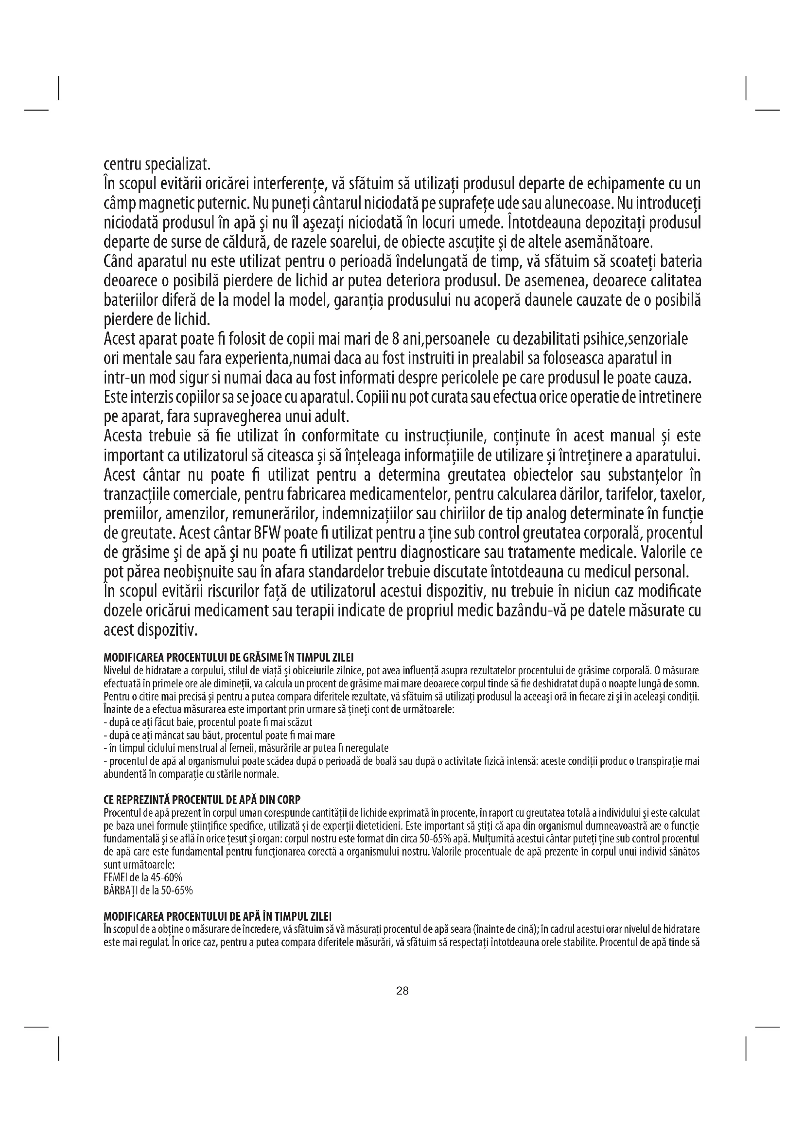 centru specializat. În scopul evitării oricărei interferenţe, vă sfătuim să utilizaţi produsul departe de echipamente cu un câmp magnetic puternic. Nu puneţi cântarul niciodată pe suprafeţe ude sau alunecoase. Nu introduceţi niciodată produsul în apă şi nu îl aşezaţi niciodată în locuri umede. Întotdeauna depozitaţi produsul departe de surse de căldură, de razele soarelui, de obiecte ascuţite şi de altele asemănătoare. Când aparatul nu este utilizat pentru o perioadă îndelungată de timp, vă sfătuim să scoateţi bateria deoarece o posibilă pierdere de lichid ar putea deteriora produsul. De asemenea, deoarece calitatea bateriilor diferă de la model la model, garanţia produsului nu acoperă daunele cauzate de o posibilă pierdere de lichid. Acest aparat poate folosit de copii mai mari de 8 ani,persoanele cu dezabilitati psihice,senzoriale ori mentale sau fara experienta,numai daca au fost instruiti in prealabil sa foloseasca aparatul in intr-un mod sigur si numai daca au fost informati despre pericolele pe care produsul le poate cauza. Este interzis copiilor sa se joace cu aparatul. Copiii nu pot curata sau efectua orice operatie de intretinere pe aparat, fara supravegherea unui adult. Acesta trebuie să e utilizat în conformitate cu instrucțiunile, conținute în acest manual și este important ca utilizatorul să citeasca și să înțeleaga informațiile de utilizare și întreținere a aparatului. Acest cântar nu poate utilizat pentru a determina greutatea obiectelor sau substanţelor în tranzacţiile comerciale, pentru fabricarea medicamentelor, pentru calcularea dărilor, tarifelor, taxelor, premiilor, amenzilor, remunerărilor, indemnizaţiilor sau chiriilor de tip analog determinate în funcţie de greutate. Acest cântar BFW poate utilizat pentru a ţine sub control greutatea corporală, procentul de grăsime şi de apă şi nu poate utilizat pentru diagnosticare sau tratamente medicale. Valorile ce pot părea neobişnuite sau în afara standardelor trebuie discutate întotdeauna cu medicul personal. În scopul evitării riscurilor faţă de utilizatorul acestui dispozitiv, nu trebuie în niciun caz modicate dozele oricărui medicament sau terapii indicate de propriul medic bazându-vă pe datele măsurate cu acest dispozitiv. MODIFICAREA PROCENTULUI DE GRĂSIME ÎN TIMPUL ZILEI Nivelul de hidratare a corpului, stilul de viaţă şi obiceiurile zilnice, pot avea inuenţă asupra rezultatelor procentului de grăsime corporală. O măsurare efectuată în primele ore ale dimineţii, va calcula un procent de grăsime mai mare deoarece corpul tinde să e deshidratat după o noapte lungă de somn. Pentru o citire mai precisă şi pentru a putea compara diferitele rezultate, vă sfătuim să utilizaţi produsul la aceeaşi oră în ecare zi şi în aceleaşi condiţii. Înainte de a efectua măsurarea este important prin urmare să ţineţi cont de următoarele: - după ce aţi făcut baie, procentul poate mai scăzut - după ce aţi mâncat sau băut, procentul poate mai mare - în timpul ciclului menstrual al femeii, măsurările ar putea neregulate - procentul de apă al organismului poate scădea după o perioadă de boală sau după o activitate zică intensă: aceste condiţii produc o transpiraţie mai abundentă în comparaţie cu stările normale. CE REPREZINTĂ PROCENTUL DE APĂ DIN CORP Procentul de apă prezent în corpul uman corespunde cantităţii de lichide exprimată în procente, în raport cu greutatea totală a individului şi este calculat pe baza unei formule ştiinţice specice, utilizată şi de experţii dieteticieni. Este important să ştiţi că apa din organismul dumneavoastră are o funcţie fundamentală şi se aă în orice ţesut şi organ: corpul nostru este format din circa 50-65% apă. Mulţumită acestui cântar puteţi ţine sub control procentul de apă care este fundamental pentru funcţionarea corectă a organismului nostru. Valorile procentuale de apă prezente în corpul unui individ sănătos sunt următoarele: FEMEI de la 45-60% BĂRBAŢI de la 50-65% MODIFICAREA PROCENTULUI DE APĂ ÎN TIMPUL ZILEI În scopul de a obţine o măsurare de încredere, vă sfătuim să vă măsuraţi procentul de apă seara (înainte de cină); în cadrul acestui orar nivelul de hidratare este mai regulat. În orice caz, pentru a putea compara diferitele măsurări, vă sfătuim să respectaţi întotdeauna orele stabilite. Procentul de apă tinde să28