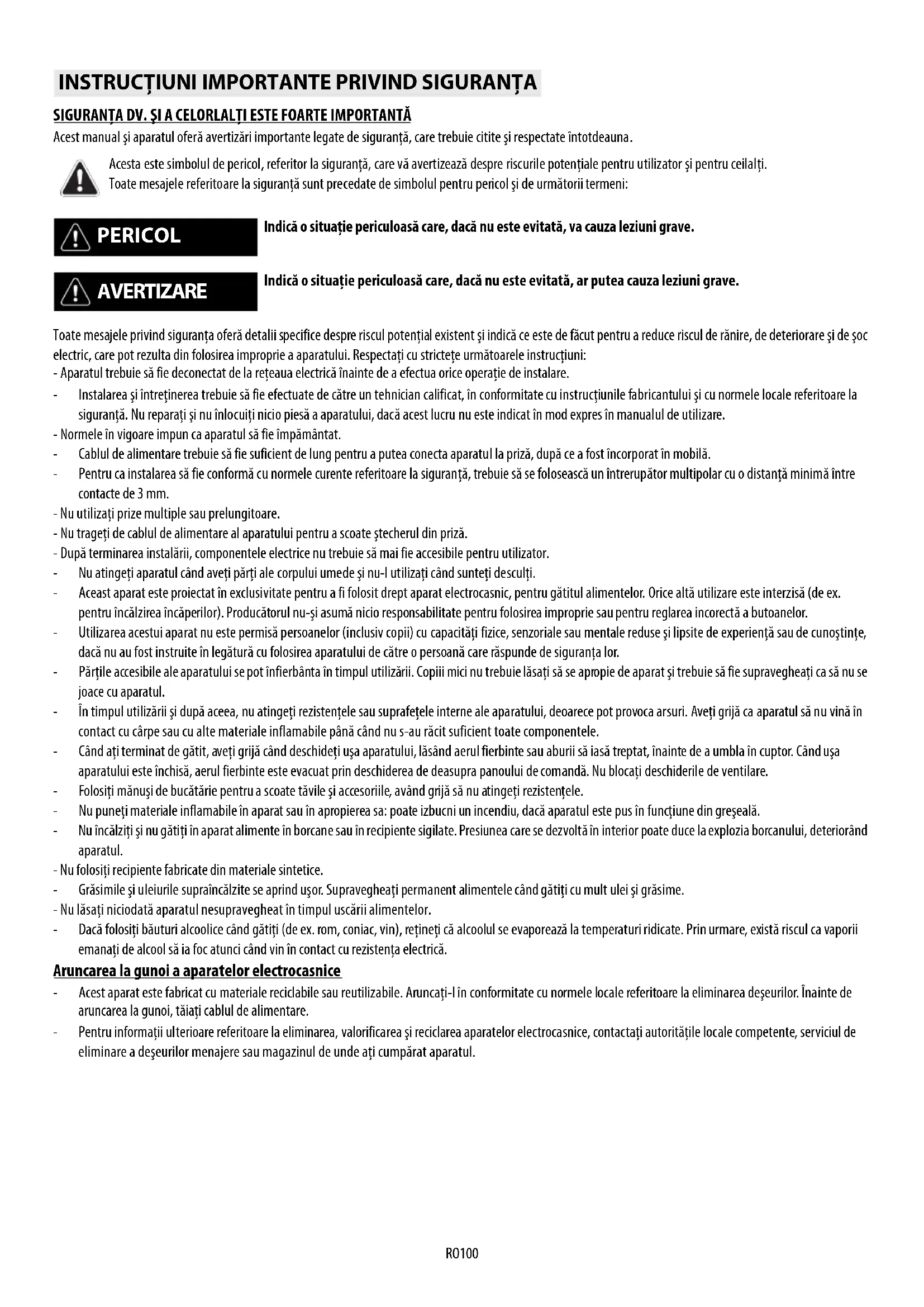 СЪВЕТИ ЗА ИЗПОЛЗВАНЕ И ПРЕПОРЪКИRO100 SIGURANŢA DV. ŞI A CELORLALŢI ESTE FOARTE IMPORTANTĂ Acest manual şi aparatul oferă avertizări importante legate de siguranţă, care trebuie citite şi respectate întotdeauna. Toate mesajele privind siguranţa oferă detalii specifice despre riscul potenţial existent şi indică ce este de făcut pentru a reduce riscul de rănire, de deteriorare şi de şoc electric, care pot rezulta din folosirea improprie a aparatului. Respectaţi cu stricteţe următoarele instrucţiuni: - Aparatul trebuie să fie deconectat de la reţeaua electrică înainte de a efectua orice operaţie de instalare. - Instalarea şi întreţinerea trebuie să fie efectuate de către un tehnician calificat, în conformitate cu instrucţiunile fabricantului şi cu normele locale referitoare la siguranţă. Nu reparaţi şi nu înlocuiţi nicio piesă a aparatului, dacă acest lucru nu este indicat în mod expres în manualul de utilizare. - Normele în vigoare impun ca aparatul să fie împământat. - Cablul de alimentare trebuie să fie suficient de lung pentru a putea conecta aparatul la priză, după ce a fost încorporat în mobilă. - Pentru ca instalarea să fie conformă cu normele curente referitoare la siguranţă, trebuie să se folosească un întrerupător multipolar cu o distanţă minimă între contacte de 3 mm. - Nu utilizaţi prize multiple sau prelungitoare. - Nu trageţi de cablul de alimentare al aparatului pentru a scoate ştecherul din priză. - După terminarea instalării, componentele electrice nu trebuie să mai fie accesibile pentru utilizator. - Nu atingeţi aparatul când aveţi părţi ale corpului umede şi nu-l utilizaţi când sunteţi desculţi. - Aceast aparat este proiectat în exclusivitate pentru a fi folosit drept aparat electrocasnic, pentru gătitul alimentelor. Orice altă utilizare este interzisă (de ex. pentru încălzirea încăperilor). Producătorul nu-şi asumă nicio responsabilitate pentru folosirea improprie sau pentru reglarea incorectă a butoanelor. - Utilizarea acestui aparat nu este permisă persoanelor (inclusiv copii) cu capacităţi fizice, senzoriale sau mentale reduse şi lipsite de experienţă sau de cunoştinţe, dacă nu au fost instruite în legătură cu folosirea aparatului de către o persoană care răspunde de siguranţa lor. - Părţile accesibile ale aparatului se pot înfierbânta în timpul utilizării. Copiii mici nu trebuie lăsaţi să se apropie de aparat şi trebuie să fie supravegheaţi ca să nu se joace cu aparatul. - În timpul utilizării şi după aceea, nu atingeţi rezistenţele sau suprafeţele interne ale aparatului, deoarece pot provoca arsuri. Aveţi grijă ca aparatul să nu vină în contact cu cârpe sau cu alte materiale inflamabile până când nu s-au răcit suficient toate componentele. - Când aţi terminat de gătit, aveţi grijă când deschideţi uşa aparatului, lăsând aerul fierbinte sau aburii să iasă treptat, înainte de a umbla în cuptor. Când uşa aparatului este închisă, aerul fierbinte este evacuat prin deschiderea de deasupra panoului de comandă. Nu blocaţi deschiderile de ventilare. - Folosiţi mănuşi de bucătărie pentru a scoate tăvile şi accesoriile, având grijă să nu atingeţi rezistenţele. - Nu puneţi materiale inflamabile în aparat sau în apropierea sa: poate izbucni un incendiu, dacă aparatul este pus în funcţiune din greşeală. - Nu încălziţi şi nu gătiţi în aparat alimente în borcane sau în recipiente sigilate. Presiunea care se dezvoltă în interior poate duce la explozia borcanului, deteriorând aparatul. - Nu folosiţi recipiente fabricate din materiale sintetice. - Grăsimile şi uleiurile supraîncălzite se aprind uşor. Supravegheaţi permanent alimentele când gătiţi cu mult ulei şi grăsime. - Nu lăsaţi niciodată aparatul nesupravegheat în timpul uscării alimentelor. - Dacă folosiţi băuturi alcoolice când gătiţi (de ex. rom, coniac, vin), reţineţi că alcoolul se evaporează la temperaturi ridicate. Prin urmare, există riscul ca vaporii emanaţi de alcool să ia foc atunci când vin în contact cu rezistenţa electrică. Aruncarea la gunoi a aparatelor electrocasnice - Acest aparat este fabricat cu materiale reciclabile sau reutilizabile. Aruncaţi-l în conformitate cu normele locale referitoare la eliminarea deşeurilor. Înainte de aruncarea la gunoi, tăiaţi cablul de alimentare. - Pentru informaţii ulterioare referitoare la eliminarea, valorificarea şi reciclarea aparatelor electrocasnice, contactaţi autorităţile locale competente, serviciul de eliminare a deşeurilor menajere sau magazinul de unde aţi cumpărat aparatul.