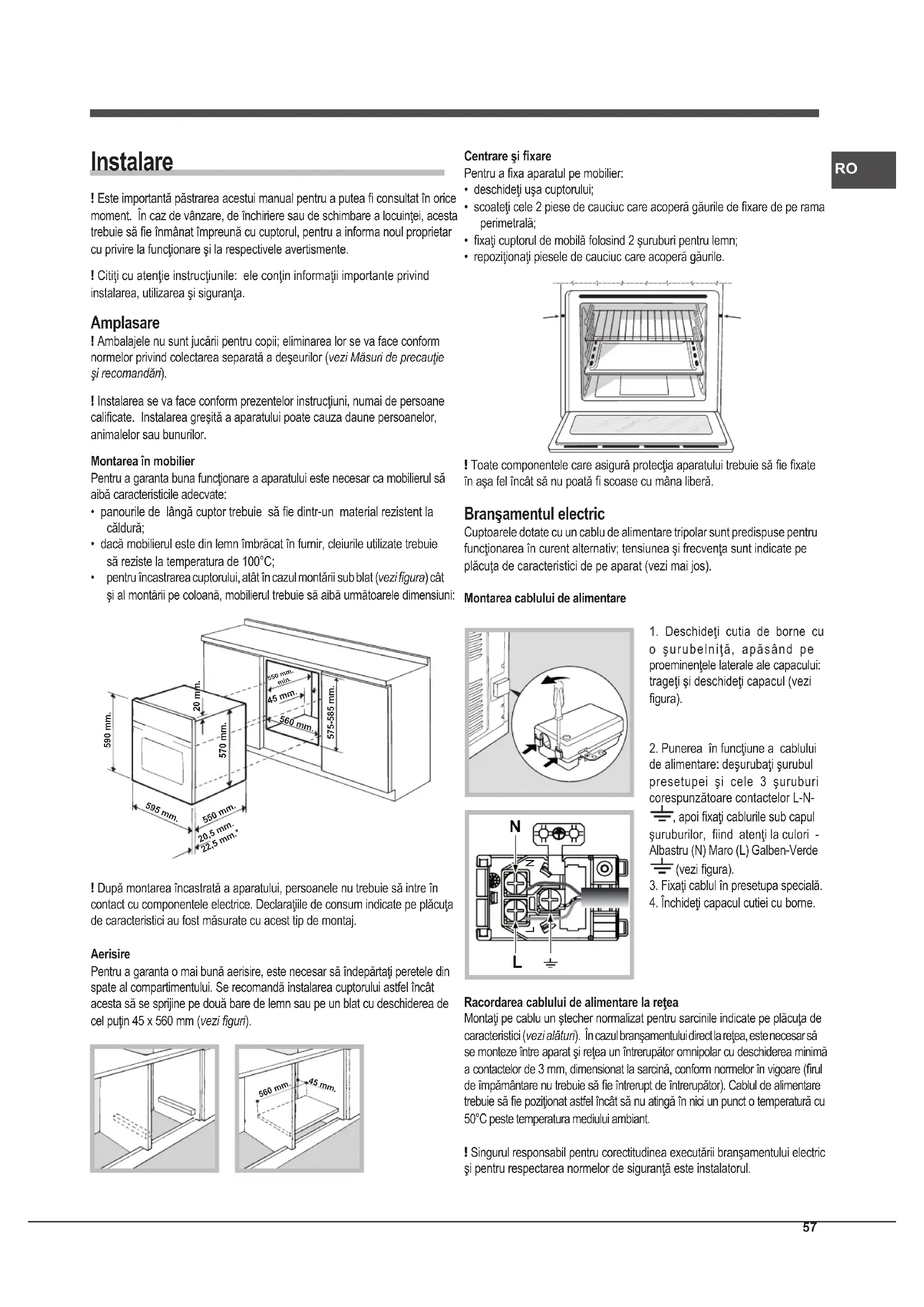 Instalare ! Este importantă păstrarea acestui manual pentru a putea consultat în orice moment. În caz de vânzare, de închiriere sau de schimbare a locuinţei, acesta trebuie să e înmânat împreună cu cuptorul, pentru a informa noul proprietar cu privire la funcţionare şi la respectivele avertismente. ! Citiţi cu atenţie instrucţiunile: ele conţin informaţii importante privind instalarea, utilizarea şi siguranţa. Amplasare ! Ambalajele nu sunt jucării pentru copii; eliminarea lor se va face conform normelor privind colectarea separată a deşeurilor (vezi Măsuri de precauţie şi recomandări). ! Instalarea se va face conform prezentelor instrucţiuni, numai de persoane calicate. Instalarea greşită a aparatului poate cauza daune persoanelor, animalelor sau bunurilor. Montarea în mobilier Pentru a garanta buna funcţionare a aparatului este necesar ca mobilierul să aibă caracteristicile adecvate: