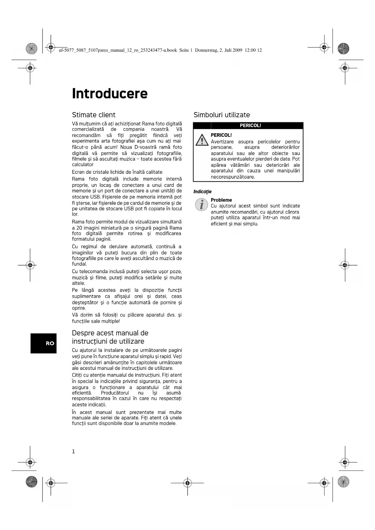 Avertizare asupra pericolelor pentru personane, asupra deteriorarilor aparatului Sau ale altero obiecte sau asupra eventualeor pierderi de date. Pot aparea vatakari Sau deteriorarile aparatului din caza unei manipulari necorespunzatoare.