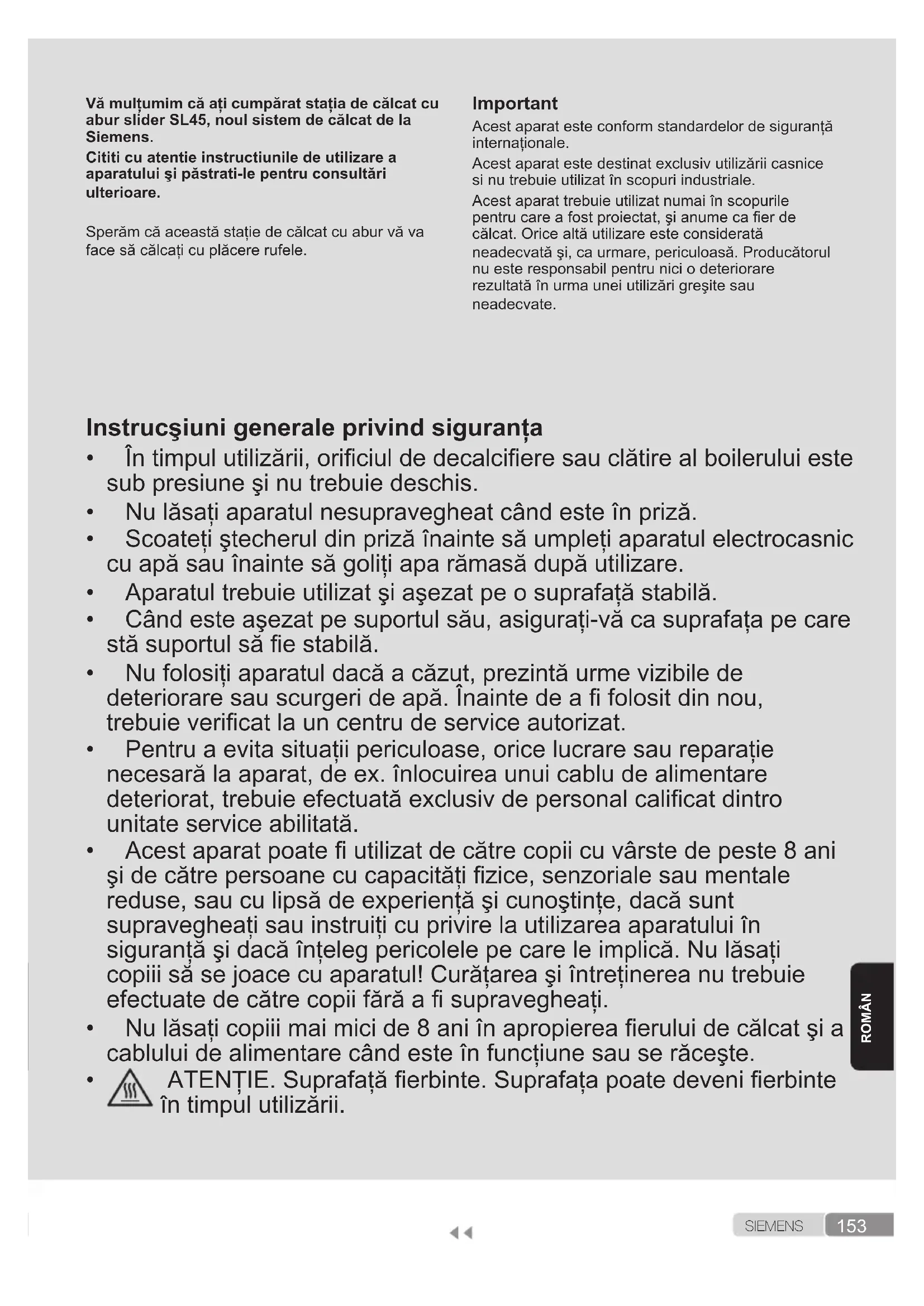 Еще раз нажмите на кнопку подачи пара, и выход пара прекратится. Если ни одно из приведенных выше действий не устраняет проблему, обратитесь в авторизованный сервисный центр.153 S I E M E N S ROMÂN Vă mulţumim că aţi cumpărat staţia de călcat cu abur slider SL45, noul sistem de călcat de la Siemens. Cititi cu atentie instructiunile de utilizare a aparatului şi păstrati-le pentru consultări ulterioare. Sperămcăaceastăstaţiedecălcatcuaburvăva facesăcălcaţicuplăcererufele. Important Acestaparatesteconformstandardelordesiguranţă internaţionale. Acestaparatestedestinatexclusivutilizăriicasnice sinutrebuieutilizatînscopuriindustriale. Acestaparattrebuieutilizatnumaiînscopurile pentrucareafostproiectat,şianumecaerde călcat.Oricealtăutilizareesteconsiderată neadecvatăşi,caurmare,periculoasă.Producătorul nu este responsabil pentru nici o deteriorare rezultatăînurmauneiutilizărigreşitesau neadecvate. Instrucşiuni generale privind siguranţa