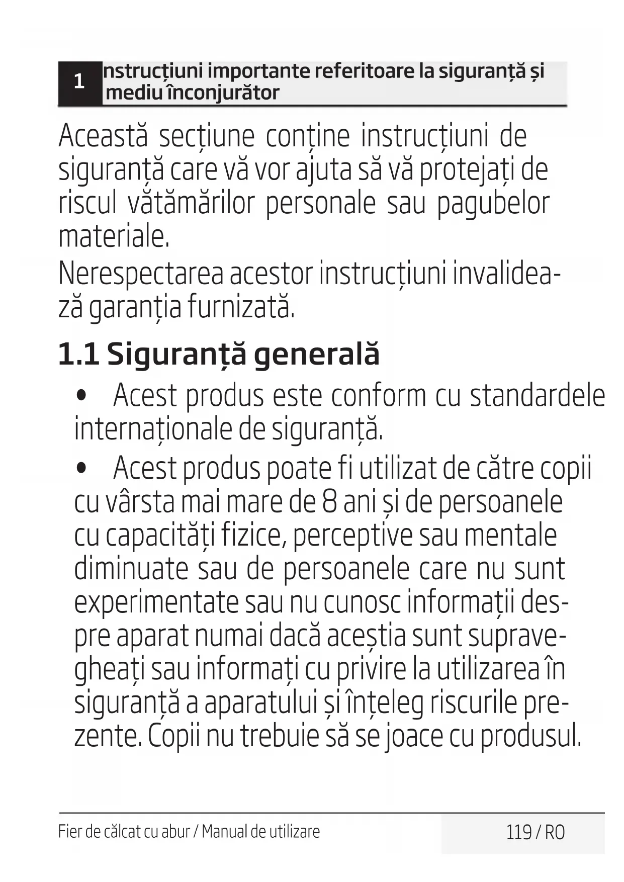 119 / RO Fier de călcat cu abur / Manual de utilizare Această secţiune conţine instrucţiuni de siguranță care vă vor ajuta să vă protejați de riscul vătămărilor personale sau pagubelor materiale. Nerespectarea acestor instrucţiuni invalidea- ză garanţia furnizată.