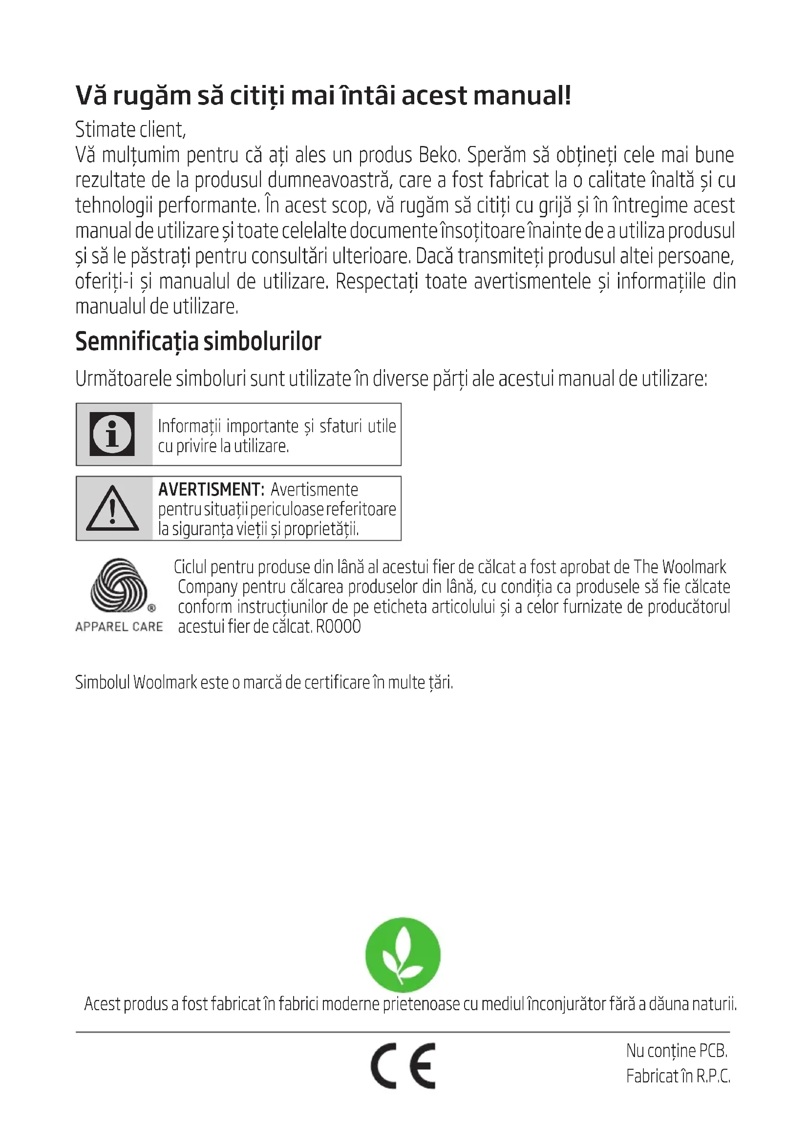 - Ispuštanje uređaja na tlo može uzrokovati trajno oštećenje i onemogućiti njegov rad.Vă rugăm să citiţi mai întâi acest manual! Stimate client, Vă mulţumim pentru că aţi ales un produs Beko. Sperăm să obţineţi cele mai bune rezultate de la produsul dumneavoastră, care a fost fabricat la o calitate înaltă şi cu tehnologii performante. În acest scop, vă rugăm să citiţi cu grijă şi în întregime acest manual de utilizare şi toate celelalte documente însoţitoare înainte de a utiliza produsul şi să le păstraţi pentru consultări ulterioare. Dacă transmiteţi produsul altei persoane, oferiţi-i şi manualul de utilizare. Respectaţi toate avertismentele şi informaţiile din manualul de utilizare. Semnificaţia simbolurilor Următoarele simboluri sunt utilizate în diverse părţi ale acestui manual de utilizare: