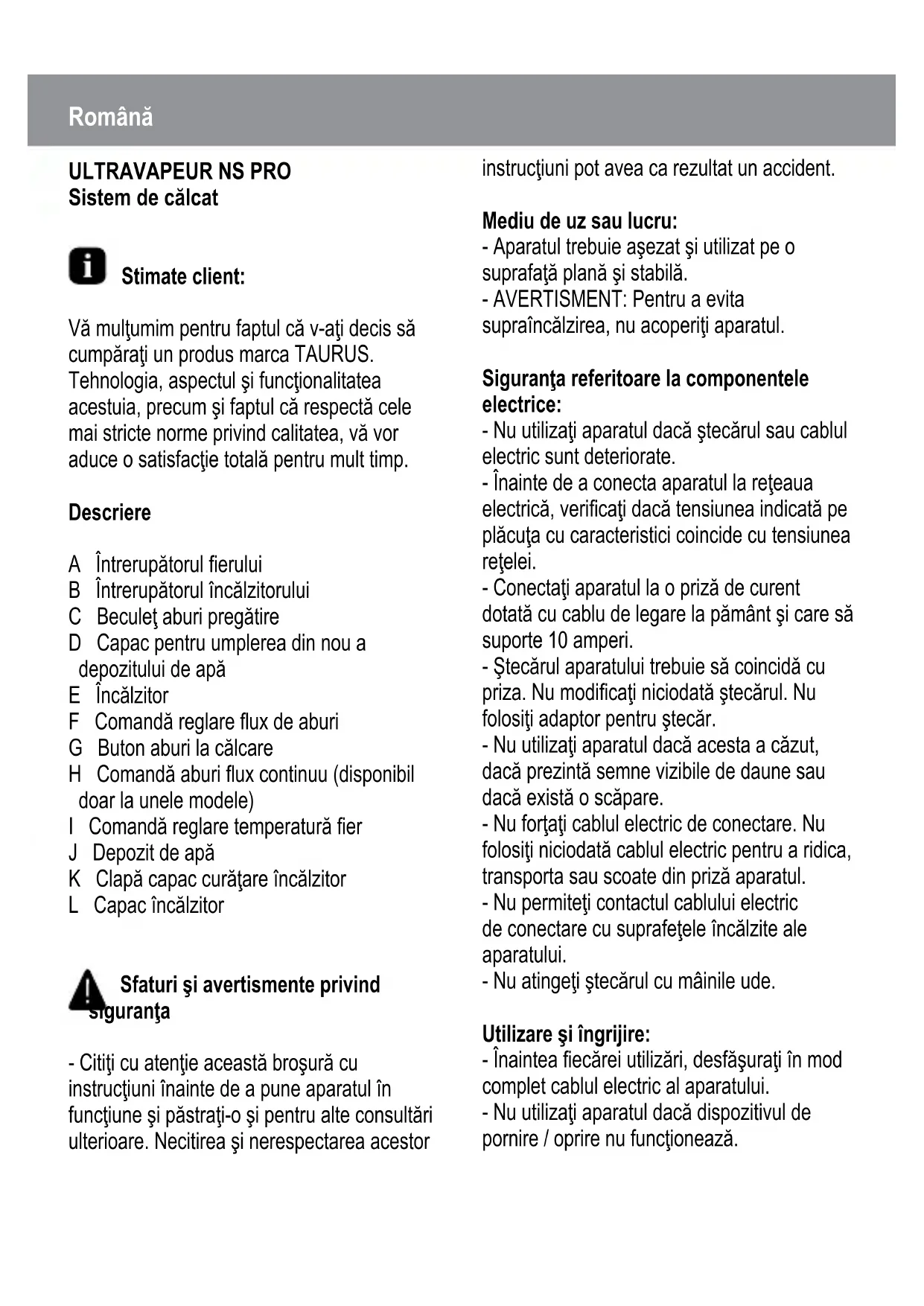 Sistem de călcat Stimate client: Vă mulţumim pentru faptul că v-aţi decis să cumpăraţi un produs marca TAURUS. Tehnologia, aspectul şi funcţionalitatea acestuia, precum şi faptul că respectă cele mai stricte norme privind calitatea, vă vor aduce o satisfacţie totală pentru mult timp. Descriere A Întrerupătorul erului B Întrerupătorul încălzitorului C Beculeţ aburi pregătire D Capac pentru umplerea din nou a depozitului de apă E Încălzitor F Comandă reglare ux de aburi G Buton aburi la călcare H Comandă aburi ux continuu (disponibil doar la unele modele) I Comandă reglare temperatură er J Depozit de apă K Clapă capac curăţare încălzitor L Capac încălzitor