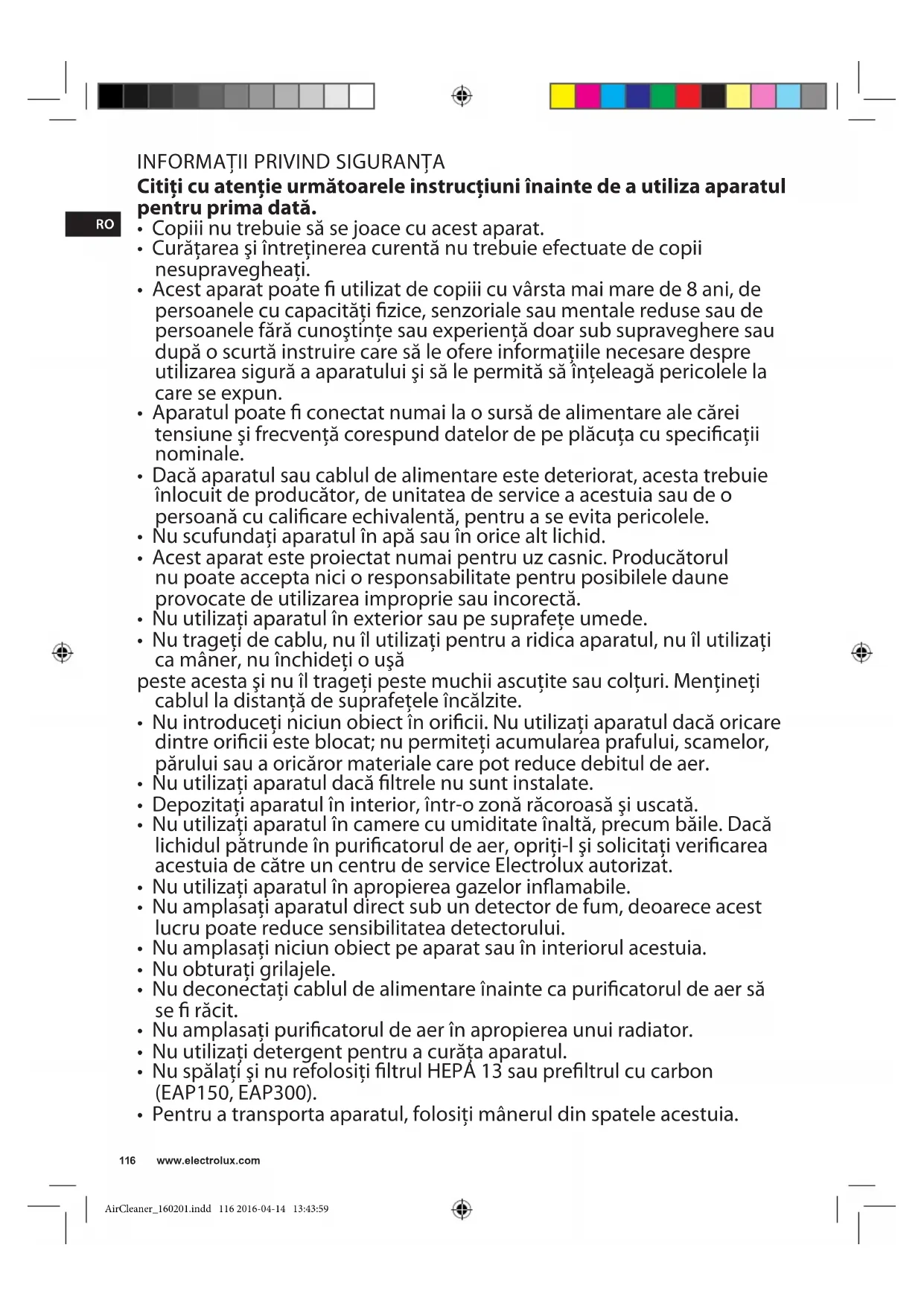 EAP150, EAP300, EAP450Situaţie Cauze posibile / soluţiePot spăla ltrul? Nu, ltrele furnizate împreună cu aparatul se vor dezintegra şi vor deveni inutilizabile dacă apa trece prin acestea. (Filtrele pentru modelul EAP450 spot spălate)Pot curăţa ltrul cu aspiratorul? Nu, aspirarea va readuce praful în aer. Dacă sunteţi de părere că ltrul este prea murdar, poate indicată înlocuirea acestuia. (Preltrul lavabil pentru modelul EAP450 poate curăţat cu aspiratorul sau cu o perie moale)Aparatul produce un miros neplăcut la prima deschidere.Unitatea a fost depozitată într-un ambalaj strâns de carton striat şi plastic. Deoarece aparatul are un ventilator prin care aspiră aer, este posibilă apariţia unor mirosuri „noi”. În funcţie de sensibilitate, aceste mirosuri vor dispărea, în mod normal, în câteva zile sau o săptămână, în funcţie de gradul de utilizare.Aparatul poate purica aerul dintr-o cameră cu suprafaţă mai mare decât cea specicată?Specicaţiile CADR sunt determinate în medii de testare controlate; modicarea mediului de utilizare poate afecta performanţele. Dacă aveţi o cameră puţin mai mare decât cea indicată în cadrul specicaţiilor CADR, aparatul va îmbunătăţi calitatea aerului, însă acest lucru poate dura mai mult. Unde trebuie să aşez unitatea? Permiteţi circulaţia corespunzătoare a aerului în jurul marginilor şi în faţa unităţii. Uşile sau holurile înguste pot reduce circulaţia aerului către puricatorul de aer, însă aerul va continua să circule în apropierea aparatului.Lumina Air Quality (Calitate aer) este portocalie sau roşie, însă aerul pare curat.Curăţaţi senzorul cu un aspirator, deoarece acesta poate obturat sau înfundat.În anumite cazuri, puteţi îndepărta praful de pe senzor cu ajutorul unui spray cu aer comprimat.Pot vedea în continuare praf în aer sau pe mobilă.Aparatul va reţine cea mai mare parte a prafului şi particulelor, însă deschiderea uşilor şi ferestrelor sau utilizarea sistemelor de încălzire sau aer condiţionat etc. pot împiedica eliminarea completă a prafului.Nu există nicio piesă care să xeze ltrele în poziţie.Filtrele sunt concepute pentru a rămâne în poziţia corectă în aparat; după pornirea acestuia, forţa aerului aspirat prin aparat va apăsa ltrele în poziţie.Pot auzi funcţionarea motorului ventilatorului.Acest lucru este normal; în special noaptea, atunci când zgomotul ambiant este redus, veţi putea auzi funcţionarea motorului.Unitatea nu mai elimină ecient mirosurile neplăcute sau generează un miros neplăcut.Asiguraţi-vă că senzorul de calitate a aerului nu este blocat sau înfundat.Apropiaţi aparatul de sursa mirosurilor neplăcute.Înlocuiţi ltrele, deoarece este posibil ca acestea să îşi atins capacitatea maximă de absorbţie a poluanţilor. Poate necesar să înlocuiţi ltrele mai frecvent.Indicatorul Check lter (Vericare ltru) rămâne aprins după înlocuirea ltrului HEPA.Apăsaţi butonul RESET FILTER (Resetare ltru) introducând cu grijă o agrafă în oriciul butonului RESET FILTER (Resetare ltru). Menţineţi butonul apăsat timp de 3-5 secunde până la emiterea unui semnal sonor care indică resetarea aparatului. www.electrolux.com