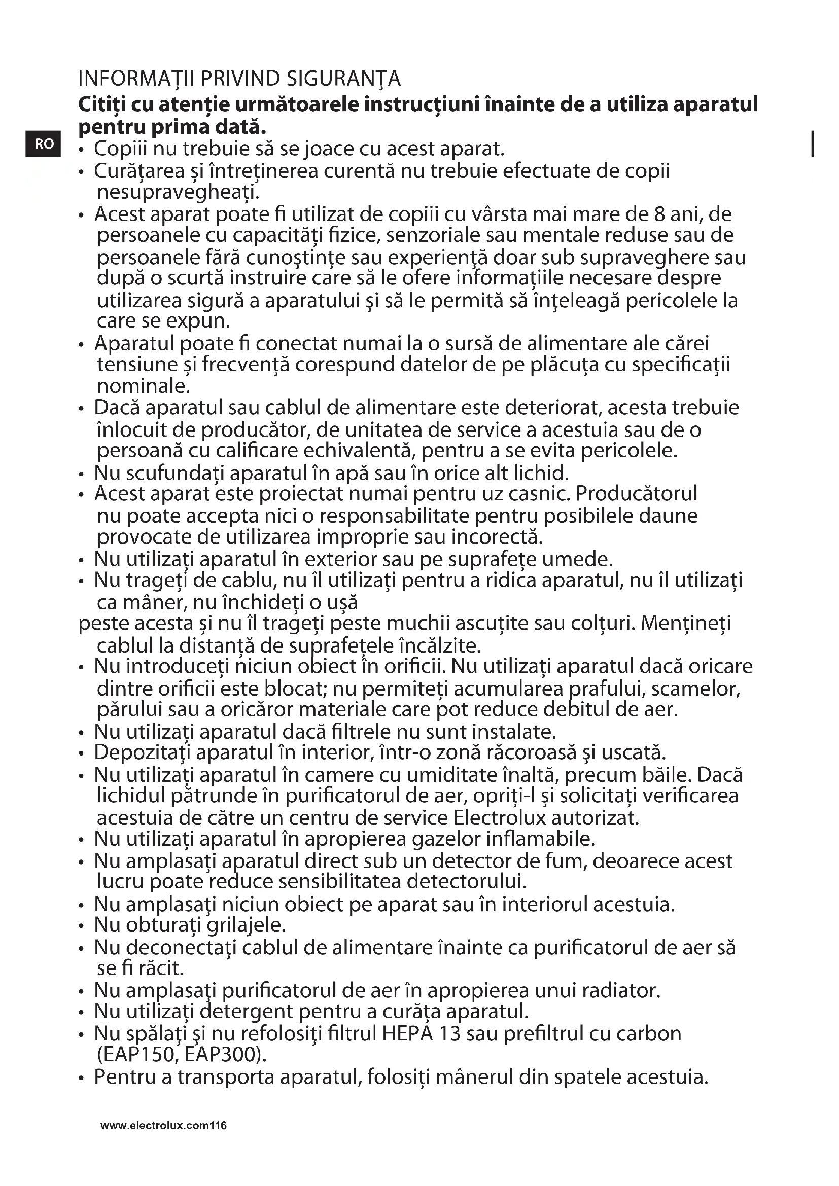 - Nu utilizaţi aparatul în camere cu umiditate înaltă, precum băile. Dacă lichidul pătrunde în puricatorul de aer, opriţi-l şi solicitaţi vericarea acestuia de către un centru de service Electrolux autorizat.