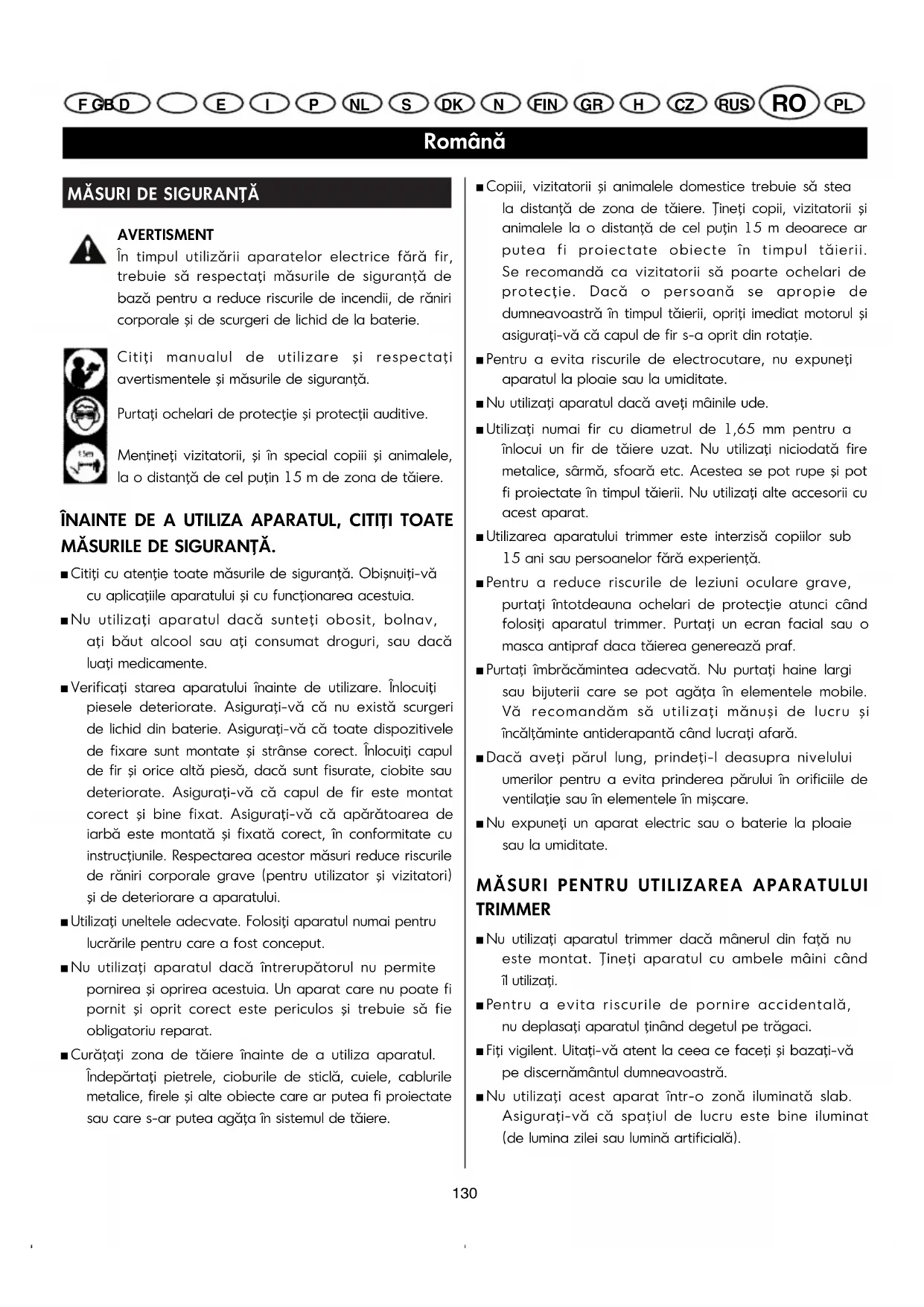 RUS F GB D êÛÒÒÍËÈ E I P NL S DK N FIN GR H CZ RO PL CLT-1423P / 1823 P manual 24/11/04 11:57 Page 129MĂSURI DE SIGURANŢĂ AVERTISMENT În timpul utilizării aparatelor electrice fără fir, trebuie să respectaţi măsurile de siguranţă de bază pentru a reduce riscurile de incendii, de răniri corporale şi de scurgeri de lichid de la baterie. Citiţi manualul de utilizare şi respectaţi avertismentele şi măsurile de siguranţă. Purtaţi ochelari de protecţie şi protecţii auditive. Menţineţi vizitatorii, şi în special copiii şi animalele, la o distanţă de cel puţin 15 m de zona de tăiere. ÎNAINTE DE A UTILIZA APARATUL, CITIŢI TOATE MĂSURILE DE SIGURANŢĂ. ■ Citiţi cu atenţie toate măsurile de siguranţă. Obişnuiţi-vă cu aplicaţiile aparatului şi cu funcţionarea acestuia. ■ Nu utilizaţi aparatul dacă sunteţi obosit, bolnav, aţi băut alcool sau aţi consumat droguri, sau dacă luaţi medicamente. ■ Verificaţi starea aparatului înainte de utilizare. Înlocuiţi piesele deteriorate. Asiguraţi-vă că nu există scurgeri de lichid din baterie. Asiguraţi-vă că toate dispozitivele de fixare sunt montate şi strânse corect. Înlocuiţi capul de fir şi orice altă piesă, dacă sunt fisurate, ciobite sau deteriorate. Asiguraţi-vă că capul de fir este montat corect şi bine fixat. Asiguraţi-vă că apărătoarea de iarbă este montată şi fixată corect, în conformitate cu instrucţiunile. Respectarea acestor măsuri reduce riscurile de răniri corporale grave (pentru utilizator şi vizitatori) şi de deteriorare a aparatului. ■ Utilizaţi uneltele adecvate. Folosiţi aparatul numai pentru lucrările pentru care a fost conceput. ■ Nu utilizaţi aparatul dacă întrerupătorul nu permite pornirea şi oprirea acestuia. Un aparat care nu poate fi pornit şi oprit corect este periculos şi trebuie să fie obligatoriu reparat. ■ Curăţaţi zona de tăiere înainte de a utiliza aparatul. Îndepărtaţi pietrele, cioburile de sticlă, cuiele, cablurile metalice, firele şi alte obiecte care ar putea fi proiectate sau care s-ar putea agăţa în sistemul de tăiere. ■ Copiii, vizitatorii şi animalele domestice trebuie să stea la distanţă de zona de tăiere. Ţineţi copii, vizitatorii şi animalele la o distanţă de cel puţin 15 m deoarece ar putea fi proiectate obiecte în timpul tăierii. Se recomandă ca vizitatorii să poarte ochelari de protecţie. Dacă o persoană se apropie de dumneavoastră în timpul tăierii, opriţi imediat motorul şi asiguraţi-vă că capul de fir s-a oprit din rotaţie. ■ Pentru a evita riscurile de electrocutare, nu expuneţi aparatul la ploaie sau la umiditate. ■ Nu utilizaţi aparatul dacă aveţi mâinile ude.■ Utilizaţi numai fir cu diametrul de 1,65 mm pentru a înlocui un fir de tăiere uzat. Nu utilizaţi niciodată fire metalice, sârmă, sfoară etc. Acestea se pot rupe şi pot fi proiectate în timpul tăierii. Nu utilizaţi alte accesorii cu acest aparat. ■ Utilizarea aparatului trimmer este interzisă copiilor sub 15 ani sau persoanelor fără experienţă. ■ Pentru a reduce riscurile de leziuni oculare grave, purtaţi întotdeauna ochelari de protecţie atunci când folosiţi aparatul trimmer. Purtaţi un ecran facial sau o masca antipraf daca tăierea generează praf. ■ Purtaţi îmbrăcămintea adecvată. Nu purtaţi haine largi sau bijuterii care se pot agăţa în elementele mobile. Vă recomandăm să utilizaţi mănuşi de lucru şi încălţăminte antiderapantă când lucraţi afară. ■ Dacă aveţi părul lung, prindeţi-l deasupra nivelului umerilor pentru a evita prinderea părului în orificiile de ventilaţie sau în elementele în mişcare. ■ Nu expuneţi un aparat electric sau o baterie la ploaie sau la umiditate.