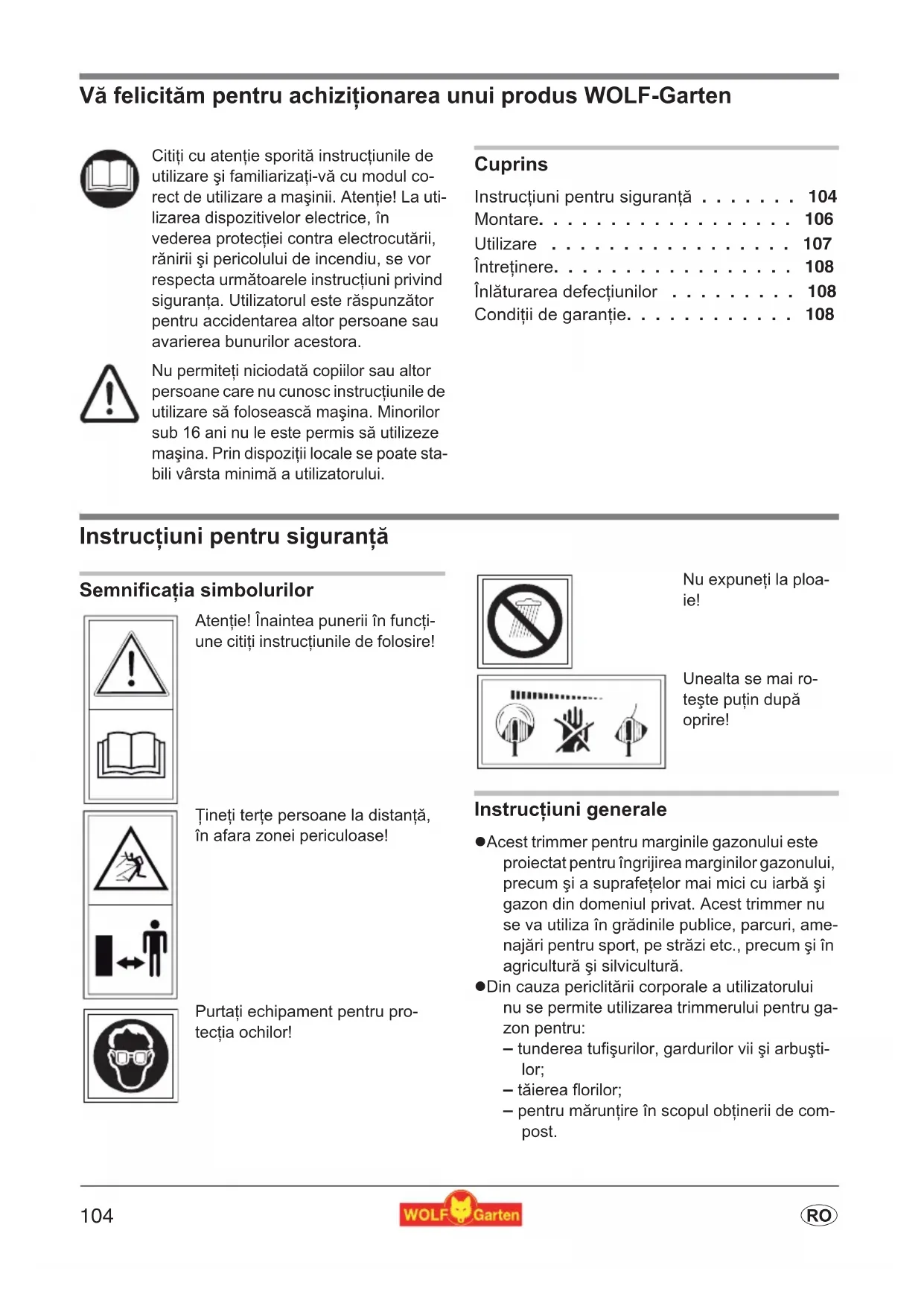 Lucrările de intreținereși curătare a utilajului, precumși indepartarea dispositivelor de proteție sau inlocuirea casetei firelor se vor efectua doar cu motorul opritși cu unealta tăietoare decuplata,și numai după ce se scoate stecherul din przyă. Utilizăi numai casete pentru fir WOLF-Garten originale, respectăti instructiunile de montaj!
