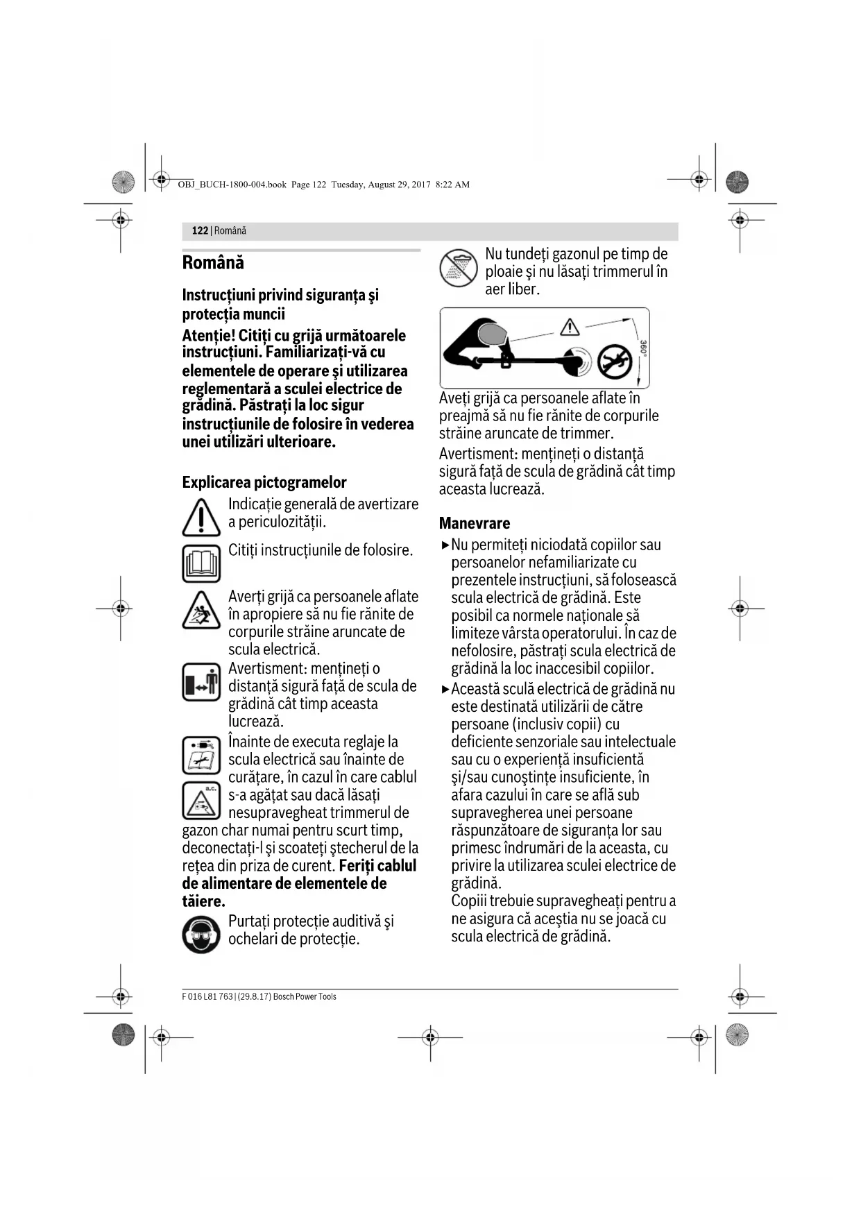 Жіп орауышын тексеріп, керек болса, кесу жібін қайта ораңыз Шөп кесі триммерін қате түрде қолдану Шөпті тек қана кесу жібінің ұшымен кесіңіз; тас, қабырға және басқа қатты заттарға тиіп қалуын болдырмаңыз. Кесу диаметрін толығымен пайдалану үшін кесу жібін үнемі өткізіп отыруыңыз лазым. Симптомдар Мүмкін болған себептер Көмек OBJ_BUCH-1800-004.book Page 121 Tuesday, August 29, 2017 8:22 AM122 | Română F 016 L81 763 | (29.8.17) Bosch Power Tools Română Instrucţiuni privind siguranţa şi protecţia muncii Atenţie! Citiţi cu grijă următoarele instrucţiuni. Familiarizaţi-vă cu elementele de operare şi utilizarea reglementară a sculei electrice de grădină. Păstraţi la loc sigur instrucţiunile de folosire în vederea unei utilizări ulterioare. Explicarea pictogramelor Indicaţie generală de avertizare a periculozităţii. Citiţi instrucţiunile de folosire. Averţi grijă ca persoanele aflate în apropiere să nu fie rănite de corpurile străine aruncate de scula electrică. Avertisment: menţineţi o distanţă sigură faţă de scula de grădină cât timp aceasta lucrează. Înainte de executa reglaje la scula electrică sau înainte de curăţare, în cazul în care cablul s-a agăţat sau dacă lăsaţi nesupravegheat trimmerul de gazon char numai pentru scurt timp, deconectaţi-l şi scoateţi ştecherul de la reţea din priza de curent. Feriţi cablul de alimentare de elementele de tăiere. Purtaţi protecţie auditivă şi ochelari de protecţie. Nu tundeţi gazonul pe timp de ploaie şi nu lăsaţi trimmerul în aer liber. Aveţi grijă ca persoanele aflate în preajmă să nu fie rănite de corpurile străine aruncate de trimmer. Avertisment: menţineţi o distanţă sigură faţă de scula de grădină cât timp aceasta lucrează. Manevrare Nu permiteţi niciodată copiilor sau persoanelor nefamiliarizate cu prezentele instrucţiuni, să folosească scula electrică de grădină. Este posibil ca normele naţionale să limiteze vârsta operatorului. În caz de nefolosire, păstraţi scula electrică de grădină la loc inaccesibil copiilor. Această sculă electrică de grădină nu este destinată utilizării de către persoane (inclusiv copii) cu deficiente senzoriale sau intelectuale sau cu o experienţă insuficientă şi/sau cunoştinţe insuficiente, în afara cazului în care se află sub supravegherea unei persoane răspunzătoare de siguranţa lor sau primesc îndrumări de la aceasta, cu privire la utilizarea sculei electrice de grădină. Copiii trebuie supravegheaţi pentru a ne asigura că aceştia nu se joacă cu scula electrică de grădină. OBJ_BUCH-1800-004.book Page 122 Tuesday, August 29, 2017 8:22 AMRomână | 123 Bosch Power Tools F 016 L81 763 | (29.8.17) Nu folosiţi în niciun caz scula electrică de grădină atunci când în imediata apropiere se află persoane, în special copii sau animale de casă. Nu folosiţi în niciun caz trimmerul dacă acesta prezintă capace sau echipamete de protecţie lipsă, deteriorate sau care nu sunt poziţionate corect. Înainte de utilizare verficaţi cablul de alimentare respectiv cablul prelungitor cu privire la deteriorări sau semne de uzură. În cazul în care cablul se defectează în timpul utilizării, scoateţi imediat ştecherul de la reţea din priza de curent. NU