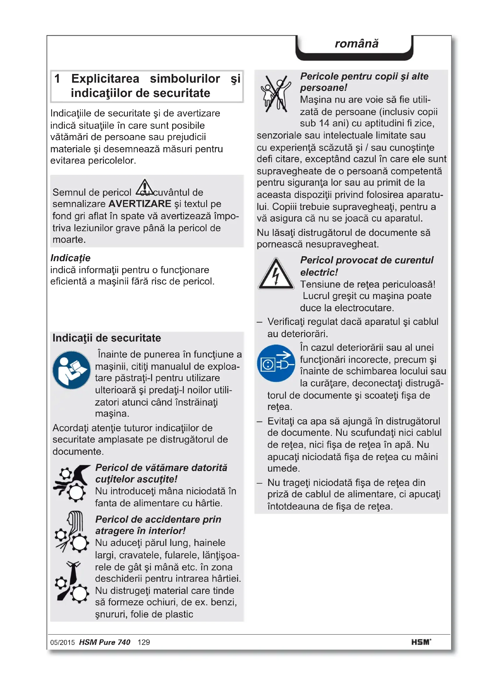 - Lăsaţi aparatul de tăiere să funcţioneze aprox. 10 s pe mod permanent fără ali- mentare cu hârtie. Se desprind praf de hârtie şi particule. AVERTIZARE Tensiune de reţea periculoasă! Lucrul greşit cu maşina poate duce la elec- trocutare. Înainte de schimbarea locului sau la curăţare, opriţi distrugătorul de documente şi scoateţi fi şa de reţea. Lucrările de servisare corelate cu înlăturarea capacelor carcasei sunt permise numai serviciul pentru clienţi HSM şi tehnicienilor de service ai partenerilor noştri contractuali. Pentru adresele serviciului de asistenţă tehnică, a se vedea pagina 160.05/2015 HSM Pure 740 135 română Distrugătorul de documente îndeplineşte prescripţiile de armonizare afl ate în vigoare ale Uniunii Europene: