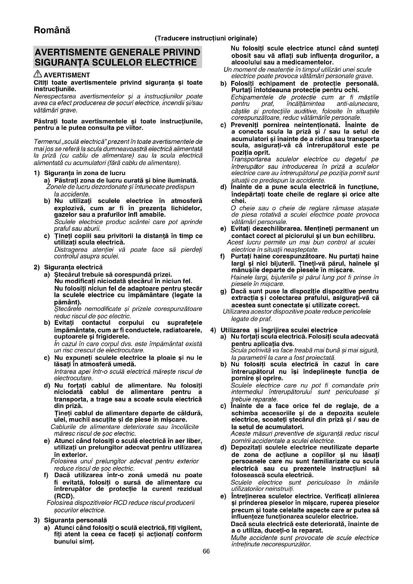 AVERTISMENT Citiţi toate avertismentele privind siguranţa și toate instrucţiunile. Nerespectarea avertismentelor și a instrucţiunilor poate avea ca efect producerea de șocuri electrice, incendii și/sau vătămări grave. Păstraţi toate avertismentele și toate instrucţiunile, pentru a le putea consulta pe viitor. Termenul „sculă electrică” prezent în toate avertismentele de mai jos se referă la scula dumneavoastră electrică alimentată la priză (cu cablu de alimentare) sau la scula electrică alimentată cu acumulatori (fără cablu de alimentare).