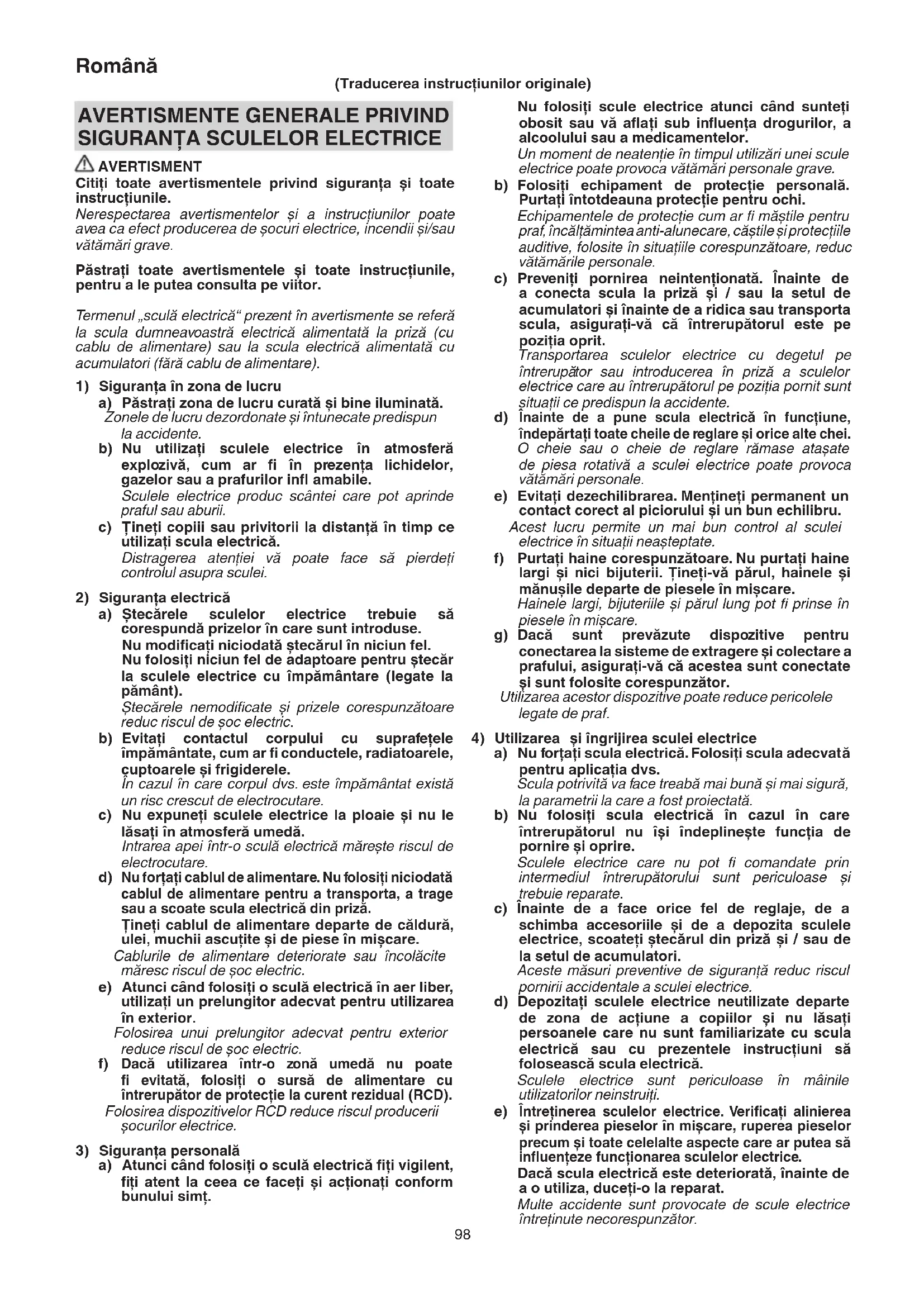 AVERTISMENT Citiţi toate avertismentele privind siguranţa și toate instrucţiunile. Nerespectarea avertismentelor și a instrucţiunilor poate avea ca efect producerea de șocuri electrice, incendii și/sau vătămări grave. Păstraţi toate avertismentele și toate instrucţiunile, pentru a le putea consulta pe viitor. Termenul „sculă electrică“ prezent în avertismente se referă la scula dumneavoastră electrică alimentată la priză (cu cablu de alimentare) sau la scula electrică alimentată cu acumulatori (fără cablu de alimentare).