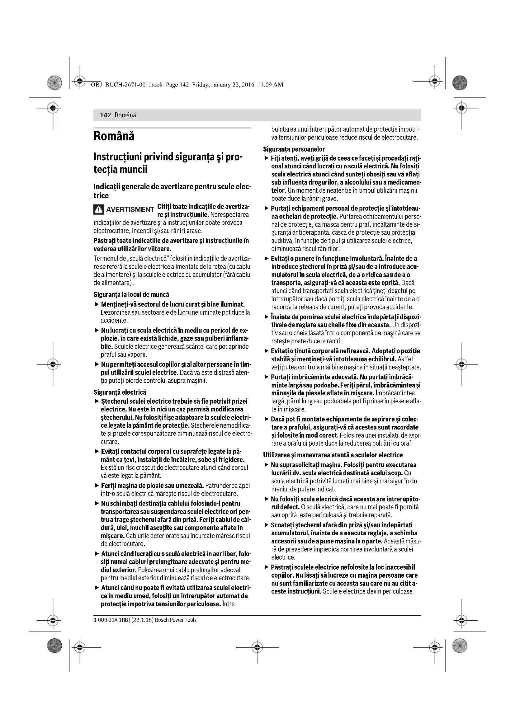 OBJ_BUCH-2671-001.book Page 142 Friday, January 22, 2016 11:09 AMRomână | 143 Bosch Power Tools 1 609 92A 1RB | (22.1.16) atunci când sunt folosite de persoane lipsite de experien- ţă. Întreţineţi-vă scula electrică cu grijă. Controlaţi dacă componentele mobile ale sculei electrice funcţionează impecabil şi dacă nu se blochează, sau dacă există pie- se rupte sau deteriorate astfel încât să afecteze funcţi- onarea sculei electrice. Înainte de utilizare daţi la repa- rat piesele deteriorate. Cauza multor accidente a fost în- treţinerea necorespunzătoare a sculelor electrice. Menţineţi bine ascuţite şi curate dispozitivele de tăie- re. Dispozitivele de tăiere întreţinute cu grijă, cu tăişuri as- cuţite se înţepenesc în mai mică măsură şi pot fi conduse mai uşor. Folosiţi scula electrică, accesoriile, dispozitivele de lu- cru etc. conform prezentelor instrucţiuni. Ţineţi cont de condiţiile de lucru şi de activitatea care trebuie des- făşurată. Folosirea sculelor electrice în alt scop decât pen- tru utilizările prevăzute, poate duce la situaţii periculoase. Manevrarea şi utilizarea atentă a sculelor electrice cu acu- mulator