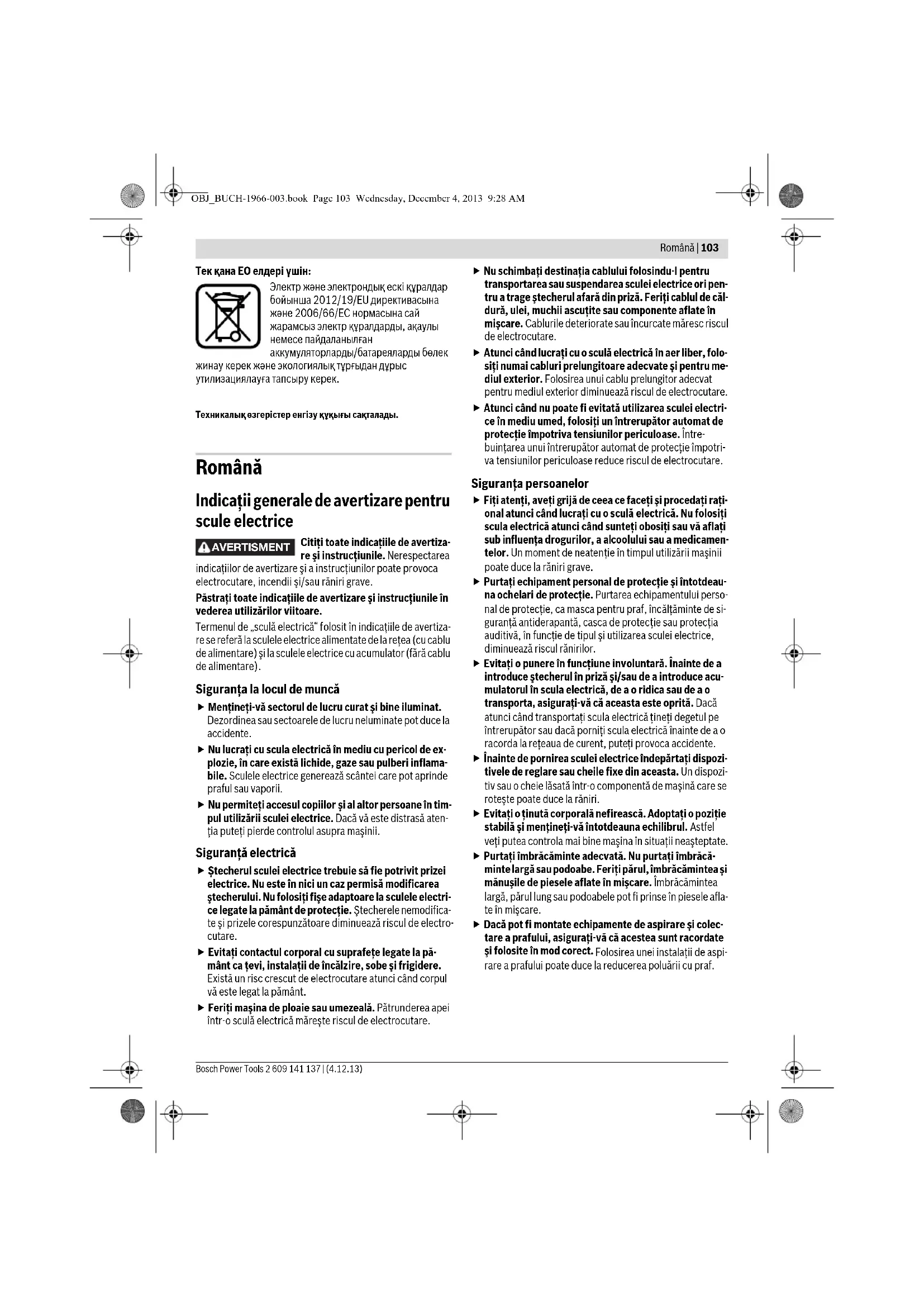 Керек-жарақтарды таңдау – 163 OBJ_BUCH-1966-003.book Page 102 Wednesday, December 4, 2013 9:28 AMRomână | 103 Bosch Power Tools 2 609 141 137 | (4.12.13) Тек қана ЕО елдері үшін: Электр және электрондық ескі құралдар бойынша 2012/19/EU директивасына және 2006/66/EC нормасына сай жарамсыз электр құралдарды, ақаулы немесе пайдаланылған аккумуляторларды/батареяларды бөлек жинау керек және экологиялық тұрғыдан дұрыс утилизациялауға тапсыру керек. Техникалық өзгерістер енгізу құқығы сақталады. Română Indicaţii generale de avertizare pentru scule electrice Citiţi toate indicaţiile de avertiza- re şi instrucţiunile. Nerespectarea indicaţiilor de avertizare şi a instrucţiunilor poate provoca electrocutare, incendii şi/sau răniri grave. Păstraţi toate indicaţiile de avertizare şi instrucţiunile în vederea utilizărilor viitoare. Termenul de „sculă electrică“ folosit în indicaţiile de avertiza- re se referă la sculele electrice alimentate de la reţea (cu cablu de alimentare) şi la sculele electrice cu acumulator (fără cablu de alimentare). Siguranţa la locul de muncă Menţineţi-vă sectorul de lucru curat şi bine iluminat. Dezordinea sau sectoarele de lucru neluminate pot duce la accidente. Nu lucraţi cu scula electrică în mediu cu pericol de ex- plozie, în care există lichide, gaze sau pulberi inflama- bile. Sculele electrice generează scântei care pot aprinde praful sau vaporii. Nu permiteţi accesul copiilor şi al altor persoane în tim- pul utilizării sculei electrice. Dacă vă este distrasă aten- ţia puteţi pierde controlul asupra maşinii. Siguranţă electrică Ştecherul sculei electrice trebuie să fie potrivit prizei electrice. Nu este în nici un caz permisă modificarea ştecherului. Nu folosiţi fişe adaptoare la sculele electri- ce legate la pământ de protecţie. Ştecherele nemodifica- te şi prizele corespunzătoare diminuează riscul de electro- cutare. Evitaţi contactul corporal cu suprafeţe legate la pă- mânt ca ţevi, instalaţii de încălzire, sobe şi frigidere. Există un risc crescut de electrocutare atunci când corpul vă este legat la pământ. Feriţi maşina de ploaie sau umezeală. Pătrunderea apei într-o sculă electrică măreşte riscul de electrocutare. Nu schimbaţi destinaţia cablului folosindu-l pentru transportarea sau suspendarea sculei electrice ori pen- tru a trage ştecherul afară din priză. Feriţi cablul de căl- dură, ulei, muchii ascuţite sau componente aflate în mişcare. Cablurile deteriorate sau încurcate măresc riscul de electrocutare. Atunci când lucraţi cu o sculă electrică în aer liber, folo- siţi numai cabluri prelungitoare adecvate şi pentru me- diul exterior. Folosirea unui cablu prelungitor adecvat pentru mediul exterior diminuează riscul de electrocutare. Atunci când nu poate fi evitată utilizarea sculei electri- ce în mediu umed, folosiţi un întrerupător automat de protecţie împotriva tensiunilor periculoase. Între- buinţarea unui întrerupător automat de protecţie împotri- va tensiunilor periculoase reduce riscul de electrocutare. Siguranţa persoanelor Fiţi atenţi, aveţi grijă de ceea ce faceţi şi procedaţi raţi- onal atunci când lucraţi cu o sculă electrică. Nu folosiţi scula electrică atunci când sunteţi obosiţi sau vă aflaţi sub influenţa drogurilor, a alcoolului sau a medicamen- telor. Un moment de neatenţie în timpul utilizării maşinii poate duce la răniri grave. Purtaţi echipament personal de protecţie şi întotdeau- na ochelari de protecţie. Purtarea echipamentului perso- nal de protecţie, ca masca pentru praf, încălţăminte de si- guranţă antiderapantă, casca de protecţie sau protecţia auditivă, în funcţie de tipul şi utilizarea sculei electrice, diminuează riscul rănirilor. Evitaţi o punere în funcţiune involuntară. Înainte de a introduce ştecherul în priză şi/sau de a introduce acu- mulatorul în scula electrică, de a o ridica sau de a o transporta, asiguraţi-vă că aceasta este oprită. Dacă atunci când transportaţi scula electrică ţ ineţi degetul pe întrerupător sau dacă porniţi scula electrică înainte de a o racorda la reţeaua de curent, puteţi provoca accidente. Înainte de pornirea sculei electrice îndepărtaţi dispozi- tivele de reglare sau cheile fixe din aceasta. Un dispozi- tiv sau o cheie lăsată într-o componentă de maşină care se roteşte poate duce la răniri. Evitaţi o ţinută corporală nefirească. Adoptaţi o poziţie stabilă şi menţineţi-vă întotdeauna echilibrul. Astfel veţi putea controla mai bine maşina în situaţii neaşteptate. Purtaţi îmbrăcăminte adecvată. Nu purtaţi îmbrăcă- minte largă sau podoabe. Feriţi părul, îmbrăcămintea şi mănuşile de piesele aflate în mişcare. Îmbrăcămintea largă, părul lung sau podoabele pot fi prinse în piesele afla- te în mişcare. Dacă pot fi montate echipamente de aspirare şi colec- tare a prafului, asiguraţi-vă că acestea sunt racordate şi folosite în mod corect. Folosirea unei instalaţii de aspi- rare a prafului poate duce la reducerea poluării cu praf. AVERTISMENT OBJ_BUCH-1966-003.book Page 103 Wednesday, December 4, 2013 9:28 AM104 | Română 2 609 141 137 | (4.12.13) Bosch Power Tools Utilizarea şi manevrarea atentă a sculelor electrice Nu suprasolicitaţi maşina. Folosiţi pentru executarea lucrării dv. scula electrică destinată acelui scop. Cu scula electrică potrivită lucraţi mai bine şi mai sigur în do- meniul de putere indicat. Nu folosiţi scula elecrică dacă aceasta are întrerupăto- rul defect. O sculă electrică, care nu mai poate fi pornit