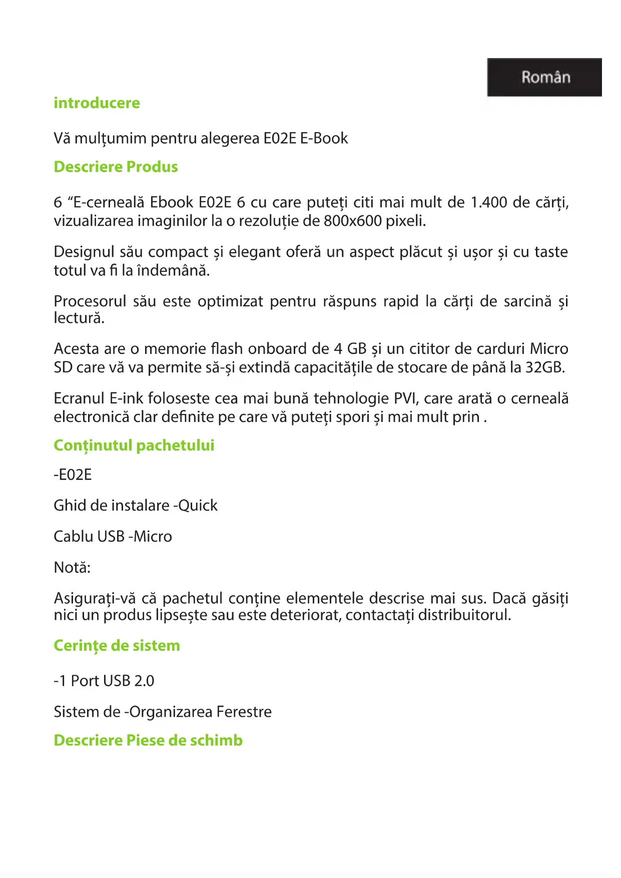 No menu principal, selecione Manual do Usuário e pressione Enter. O manual do usuário eBook vai abrir Suporte Técnico Para mais informações sobre este produto, por favor, visite nossa seção de suporte no nosso site www.billowtechnology.com ou envie um e-mail para support@billowtechnology.comintroducere Vă mulțumim pentru alegerea E02E E-Book Descriere Produs 6 “E-cerneală Ebook E02E 6 cu care puteți citi mai mult de 1.400 de cărți, vizualizarea imaginilor la o rezoluție de 800x600 pixeli. Designul său compact și elegant oferă un aspect plăcut și ușor și cu taste totul va la îndemână. Procesorul său este optimizat pentru răspuns rapid la cărți de sarcină și lectură. Acesta are o memorie ash onboard de 4 GB și un cititor de carduri Micro SD care vă va permite să-și extindă capacitățile de stocare de până la 32GB. Ecranul E-ink foloseste cea mai bună tehnologie PVI, care arată o cerneală electronică clar denite pe care vă puteți spori și mai mult prin . Conținutul pachetului -E02E Ghid de instalare -Quick Cablu USB -Micro Notă: Asigurați-vă că pachetul conține elementele descrise mai sus. Dacă găsiți nici un produs lipsește sau este deteriorat, contactați distribuitorul. Cerințe de sistem -1 Port USB 2.0 Sistem de -Organizarea Ferestre Descriere Piese de schimb1. “Acasă” Butonul 2. “Conrm”