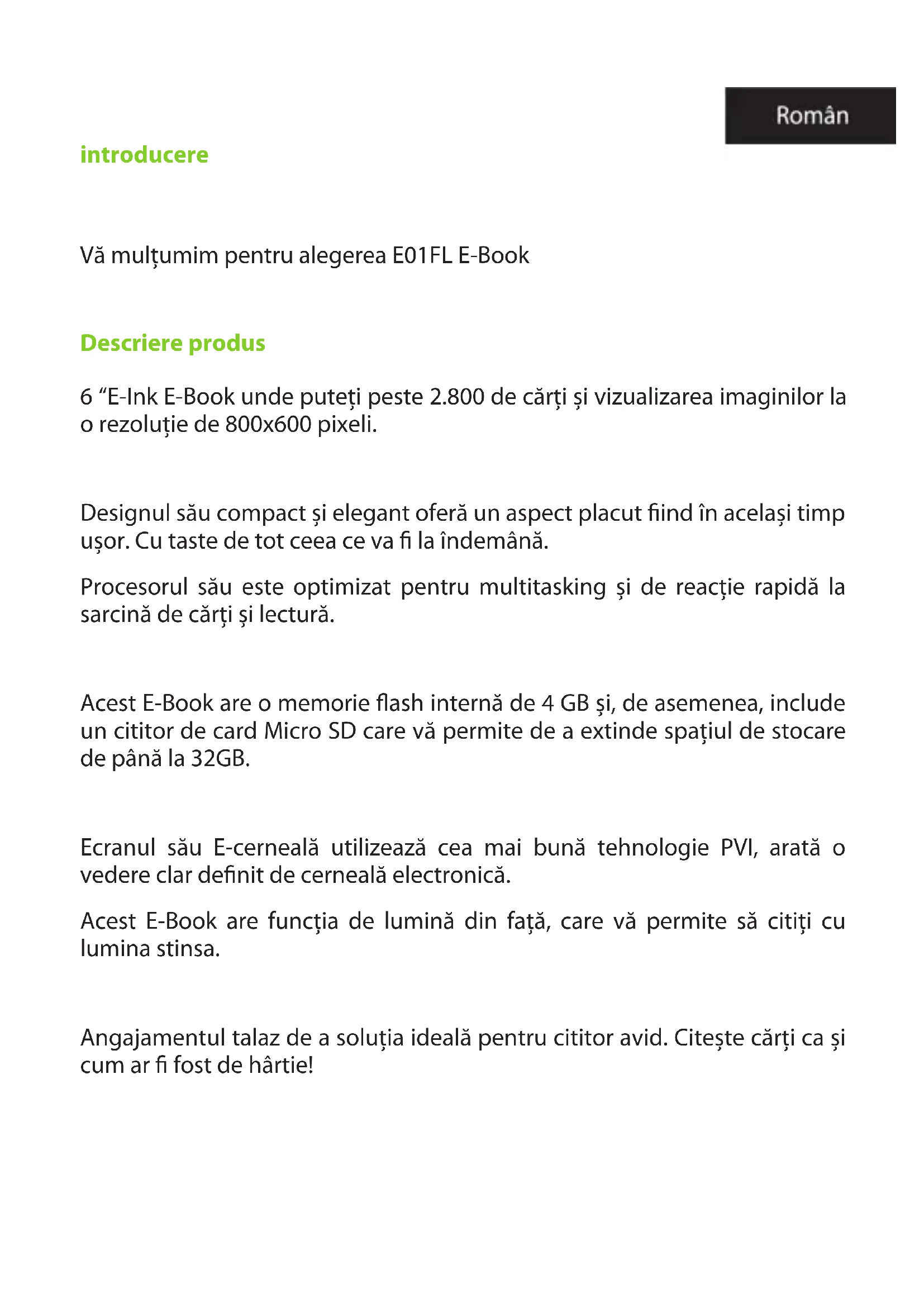 A partir do menu principal, selecione Manual do Usuário e pressione Enter. O manual do usuário e-book vai abrir Suporte técnico Para mais informações sobre este produto, visite nossa seção de suporte no nosso site www.billowtechnology.com ou envie um e-mail para Support@ billowtechnology.comintroducere Vă mulțumim pentru alegerea E01FL E-Book Descriere produs 6 “E-Ink E-Book unde puteți peste 2.800 de cărți și vizualizarea imaginilor la o rezoluție de 800x600 pixeli. Designul său compact și elegant oferă un aspect placut ind în același timp ușor. Cu taste de tot ceea ce va la îndemână. Procesorul său este optimizat pentru multitasking și de reacție rapidă la sarcină de cărți și lectură. Acest E-Book are o memorie ash internă de 4 GB și, de asemenea, include un cititor de card Micro SD care vă permite de a extinde spațiul de stocare de până la 32GB. Ecranul său E-cerneală utilizează cea mai bună tehnologie PVI, arată o vedere clar denit de cerneală electronică. Acest E-Book are funcția de lumină din față, care vă permite să citiți cu lumina stinsa. Angajamentul talaz de a soluția ideală pentru cititor avid. Citește cărți ca și cum ar fost de hârtie!Conținutul pachetului -E01FL -Ghid rapid de instalare Cablu USB Mini- Notă: Asigurați-vă că pachetul conține elementele descrise mai sus. Dacă găsiți orice elemente lipsesc sau sunt deteriorate, vă rugăm să contactați distribuitorul. Cerințe de sistem -1 Port USB 2.0 -Sistem de operare Windows Descrierea piese