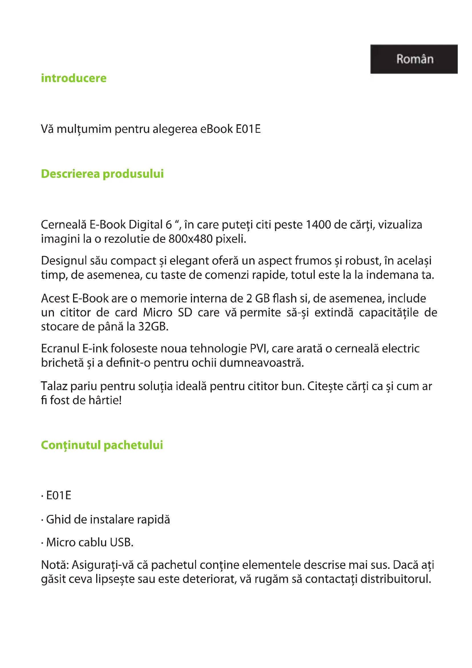 - Pressione o botão Menu para usar o menu de opções. Apoio Por favor, para mais informações sobre como instalar e congurar o produto ir para a nossa seção de suporte billowtechnology.com web e fazer o download do guia completo ou escrever um e-mail para o seguinte endereço: support@billowtechnology.comintroducere Vă mulțumim pentru alegerea eBook E01E Descrierea produsului Cerneală E-Book Digital 6 “, în care puteți citi peste 1400 de cărți, vizualiza imagini la o rezolutie de 800x480 pixeli. Designul său compact și elegant oferă un aspect frumos și robust, în același timp, de asemenea, cu taste de comenzi rapide, totul este la la indemana ta. Acest E-Book are o memorie interna de 2 GB ash si, de asemenea, include un cititor de card Micro SD care vă permite să-și extindă capacitățile de stocare de până la 32GB. Ecranul E-ink foloseste noua tehnologie PVI, care arată o cerneală electric brichetă și a denit-o pentru ochii dumneavoastră. Talaz pariu pentru soluția ideală pentru cititor bun. Citește cărți ca și cum ar fost de hârtie! Conținutul pachetului