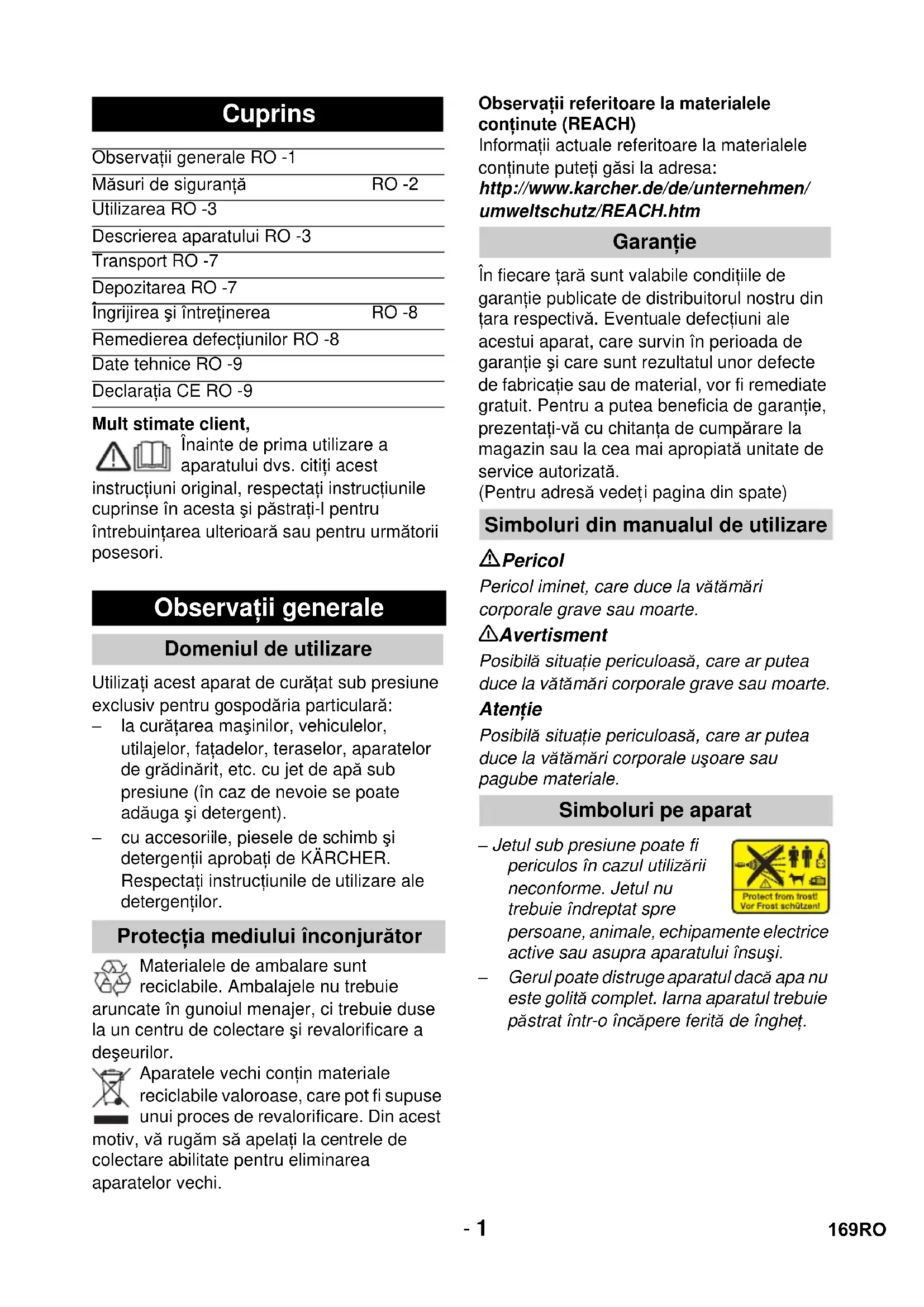 dB(A) 92 93 89 Deklaracja UE Produkt: Myjka wysokociśnieniowa Typ: 1.180-xxx 1.181-xxx Obowiązujące dyrektywy WE 2006/42/WE (+2009/127/WE) 2004/108/WE 2000/14/WE Zastosowane normy zharmonizowane EN 55014–1: 2006 EN 55014–2: 1997 + A1: 2001 EN 60335–1 EN 60335–2–79 EN 61000–3–2: 2006 EN 61000–3–3: 2008 EN 62233: 2008 Zastosowana metoda oceny zgodności Załącznik V Poziom mocy akustycznej dB(A) K 3.700 K 4.700 K 5.700 Zmierzony: 90 90 87 Gwarantowany: 92 93 89 CEO Head of Approbation 168 PL- 1 Mult stimate client, Înainte de prima utilizare a aparatului dvs. citiţi acest instrucţiuni original, respectaţi instrucţiunile cuprinse în acesta şi păstraţi-l pentru întrebuinţarea ulterioară sau pentru următorii posesori. Utilizaţi acest aparat de curăţat sub presiune exclusiv pentru gospodăria particulară: – la curăţarea maşinilor, vehiculelor, utilajelor, faţadelor, teraselor, aparatelor de grădinărit, etc. cu jet de apă sub presiune (în caz de nevoie se poate adăuga şi detergent). – cu accesoriile, piesele de schimb şi detergenţii aprobaţi de KÄRCHER. Respectaţi instrucţiunile de utilizare ale detergenţilor. Materialele de ambalare sunt reciclabile. Ambalajele nu trebuie aruncate în gunoiul menajer, ci trebuie duse la un centru de colectare şi revalorificare a deşeurilor. Aparatele vechi conţin materiale reciclabile valoroase, care pot fi supuse unui proces de revalorificare. Din acest motiv, vă rugăm să apelaţi la centrele de colectare abilitate pentru eliminarea aparatelor vechi. Observaţii referitoare la materialele conţinute (REACH) Informaţii actuale referitoare la materialele conţinute puteţi găsi la adresa: http://www.karcher.de/de/unternehmen/ umweltschutz/REACH.htm În fiecare ţară sunt valabile condiţiile de garanţie publicate de distribuitorul nostru din ţara respectivă. Eventuale defecţiuni ale acestui aparat, care survin în perioada de garanţie şi care sunt rezultatul unor defecte de fabricaţie sau de material, vor fi remediate gratuit. Pentru a putea beneficia de garanţie, prezentaţi-vă cu chitanţa de cumpărare la magazin sau la cea mai apropiată unitate de service autorizată. (Pentru adresă vedeţ i pagina din spate) Pericol Pericol iminet, care duce la vătămări corporale grave sau moarte. 몇 Avertisment Posibilă situaţie periculoasă, care ar putea duce la vătămări corporale grave sau moarte. Atenţie Posibilă situaţie periculoasă, care ar putea duce la vătămări corporale uşoare sau pagube materiale. – Jetul sub presiune poate fi periculos în cazul utilizării neconforme. Jetul nu trebuie îndreptat spre persoane, animale, echipamente electrice active sau asupra aparatului însuşi. – Gerul poate distruge aparatul dacă apa nu este golită complet. Iarna aparatul trebuie păstrat într-o încăpere ferită de îngheţ. Cuprins Observaţii generale RO -1 Măsuri de siguranţă RO -2 Utilizarea RO -3 Descrierea aparatului RO -3 Transport RO -7 Depozitarea RO -7 Îngrijirea şi întreţinerea RO -8 Remedierea defecţiunilor RO -8 Date tehnice RO -9 Declaraţia CE RO -9 Observaţii generale Domeniul de utilizare Protecţia mediului înconjurător Garanţie Simboluri din manualul de utilizare Simboluri pe aparat 169RO- 2