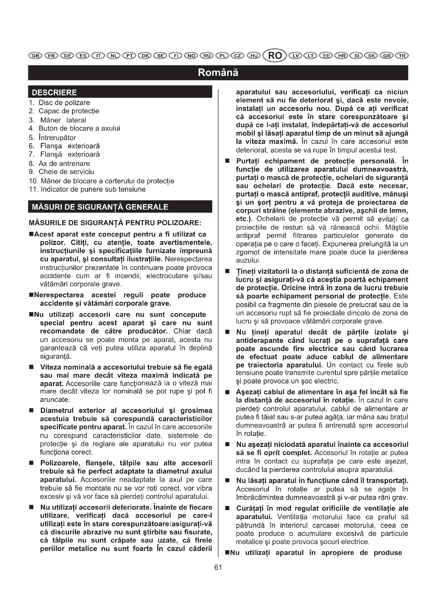 Verifica]i dac^ viteza indicat^ pe discul de polizare este egal^ sau mai mare decât viteza nominal^ a utilajului. Asigura]i-v^ c^ diametrul discului de polizare este compatibil cu utilajul ¥i c^ discul se insereaz^ corect pe ax. Discurile de polizare trebuie p^strate într-un loc uscat. Nu a¥eza]i nici un obiect pe discuri. Discurile nu trebuie folosite în alte scopuri decât pentru opera]iuni de polizare. Discurile trebuie s^ fie p^strate ¥i manipulate cu precau]ie, în conformitate cu instruc]iunile produc^torului. Înainte de a utiliza discul de polizare, asigura]i-v^ c^ acesta nu este ¥tirbit sau fisurat. În aceste cazuri discul se poate sparge, ceea ce poate duce la r^niri corporale grave. Asigura]i-v^ c^ discul este instalat în conformitate cu instruc]iunile din acest manual. Înainte de a utiliza polizorul, asigura]i-v^ c^ discul de polizare este montat ¥i strâns corect, apoi l^sa]i utilajul s^ mearg^ în gol timp de 30 de secunde orientându-l în a¥a fel încât s^ nu prezinte nici un pericol. Opri]i imediat utilajul dac^ acesta vibreaz^ excesiv sau dac^ observa]i alte anomalii. În acest caz, controla]i utilajul pentru a determina cauza problemei. Nu utiliza]i inele reductoare sau adaptoare pentru a reduce diametrul de prindere a discurilor cu orificii largi. Asigura]i-v^ c^ piesa de prelucrat este fixat^ corect. Utiliza]i doar accesorii recomandate. Asigura]i-v^ c^ scânteile produse de utilizarea aparatului nu produc situa]ii periculoase, c^ nu sunt proiectate asupra persoanelor sau a unor substan]e inflamabile. Purta]i întotdeauna ochelari de protec]ie ¥i protec]ii auditive. Dac^ este necesar, utiliza]i ¥i alte mijloace de protec]ie individual^, cum ar fi m ^nu¥i, ¥or]uri sau c^¥ti. Nu pune]i niciodat^ utilajul pe sol sau pe alte suprafe]e atunci când acesta este în func]iune. Polizorul se învârte din iner]ie dup^ oprirea utilajului. Nu atinge]i niciodat^ polizorul ¥i nu îl pune]i pe sol sau pe alte63 Român