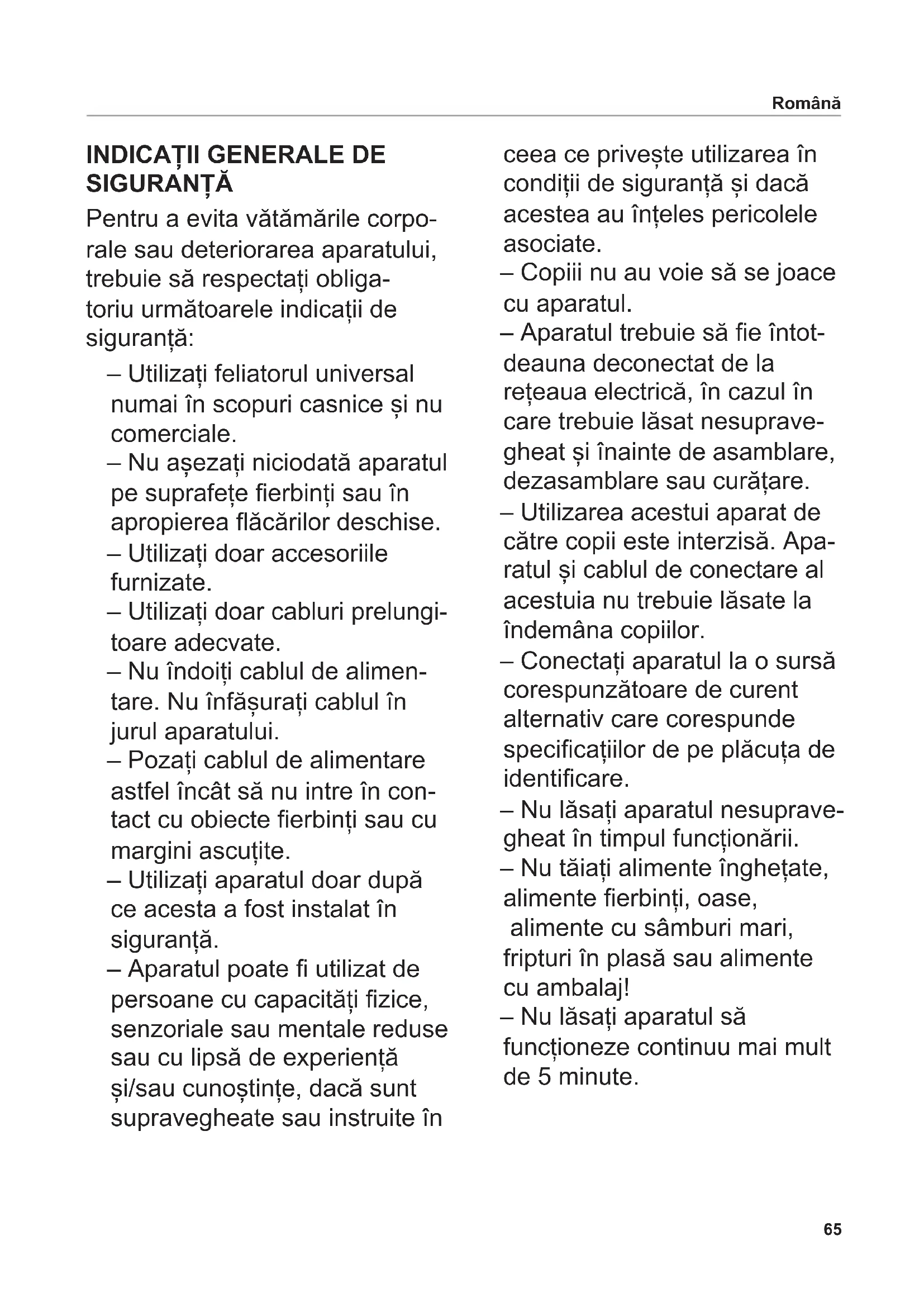 SIGURANȚĂ Pentru a evita vătămările corpo- rale sau deteriorarea aparatului, trebuie să respectați obliga- toriu următoarele indicații de siguranță: – Utilizați feliatorul universal numai în scopuri casnice și nu comerciale. – Nu așezați niciodată aparatul pe suprafețe erbinți sau în apropierea ăcărilor deschise. – Utilizați doar accesoriile furnizate. – Utilizați doar cabluri prelungi- toare adecvate. – Nu îndoiți cablul de alimen- tare. Nu înfășurați cablul în jurul aparatului. – Pozați cablul de alimentare astfel încât să nu intre în con- tact cu obiecte erbinți sau cu margini ascuțite. – Utilizați aparatul doar după ce acesta a fost instalat în siguranță. – Aparatul poate utilizat de persoane cu capacități zice, senzoriale sau mentale reduse sau cu lipsă de experiență și/sau cunoștințe, dacă sunt supravegheate sau instruite în ceea ce privește utilizarea în condiții de siguranță și dacă acestea au înțeles pericolele asociate. – Copiii nu au voie să se joace cu aparatul. – Aparatul trebuie să e întot- deauna deconectat de la rețeaua electrică, în cazul în care trebuie lăsat nesuprave- gheat și înainte de asamblare, dezasamblare sau curățare. – Utilizarea acestui aparat de către copii este interzisă. Apa- ratul și cablul de conectare al acestuia nu trebuie lăsate la îndemâna copiilor. – Conectați aparatul la o sursă corespunzătoare de curent alternativ care corespunde specicațiilor de pe plăcuța de identicare. – Nu lăsați aparatul nesuprave- gheat în timpul funcționării. – Nu tăiați alimente înghețate, alimente erbinți, oase, alimente cu sâmburi mari, fripturi în plasă sau alimente cu ambalaj! – Nu lăsați aparatul să funcționeze continuu mai mult de 5 minute. Română66 Pericol de electrocutare – În caz de defecțiuni, înainte de ecare curățare și atunci când aparatul nu este utilizat, scoateți întotdeauna ștecărul din priză. În acest scop, trageți de ștecăr și nu de cablu. – Nu scufundați niciodată apa- ratul în apă. Nu expuneți niciodată aparatul la ploaie sau umiditate. În cazul în care aparatul a căzut o dată în apă, mai întâi scoateți ștecărul din priză și apoi scoateți aparatul din apă. Dispuneți vericarea aparatului de către un centru de service autorizat, înainte de al pune din nou în funcțiune. – Nu utilizați aparatul cu mâi- nile ude. Nu utilizați aparatul atunci când este ud sau umed sau atunci când vă aați pe o suprafață umedă. Nu utilizați aparatul în aer liber. – În caz de deteriorare a pie- selor aparatului, întrerupeți imediat utilizarea și contactați serviciul clienți ritter. – În cazul în care cablul de alimentare este deteriorat, acesta trebuie înlocuit de producător, de serviciul clienți sau de persoane cu o cali- care similară, pentru a evita pericolele. Pericol de rănire – Acest aparat nu trebuie utilizat fără sania pentru produsul de tăiat sau fără suportul pentru resturi, cu excepția cazului în care dimensiunea și forma produsului de tăiat nu permit utilizarea acestora. – Înainte de înlocuirea acceso- riilor sau a pieselor suplimen- tare, care sunt deplasate în timpul funcționării, aparatul trebuie să e oprit și deconec- tat de la rețeaua electrică. – Cuțitul rotativ este foarte ascuțit. – Nu atingeți niciodată cuțitul rotativ în timpul funcționării aparatului! – Înainte de curățare, opriți aparatul, scoateți ștecărul din priză și rotiți butonul de reglare a grosimii de tăiere în poziția „0”. – Cuțitul rotativ continuă să funcționeze pentru o perioadă scurtă de timp după oprire. Română67 Desfaceți gracele de la începutul și sfârșitul acestui manual. Citiți cu atenție instrucțiunile înainte de punerea în funcțiune a aparatului. Păstrați instrucțiunile de utilizare și transmitețile mai departe eventualilor proprietari. Alternativ, instrucțiunile actuale de utilizare sunt disponibile la adresa www.ritterwerk.de. UTILIZARE CONFORM DESTINAȚIEI Feliatorul universal servește la tăierea alimentelor pentru uz casnic. Toate feliatoarele universale sunt adecvate pentru contactul cu alimentele. Utilizarea necorespunzătoare sau operarea incorectă poate duce la vătămări corporale grave sau la deteriorarea aparatului. În acest caz, toate pretențiile care decurg din garanție și răspundere devin nule.