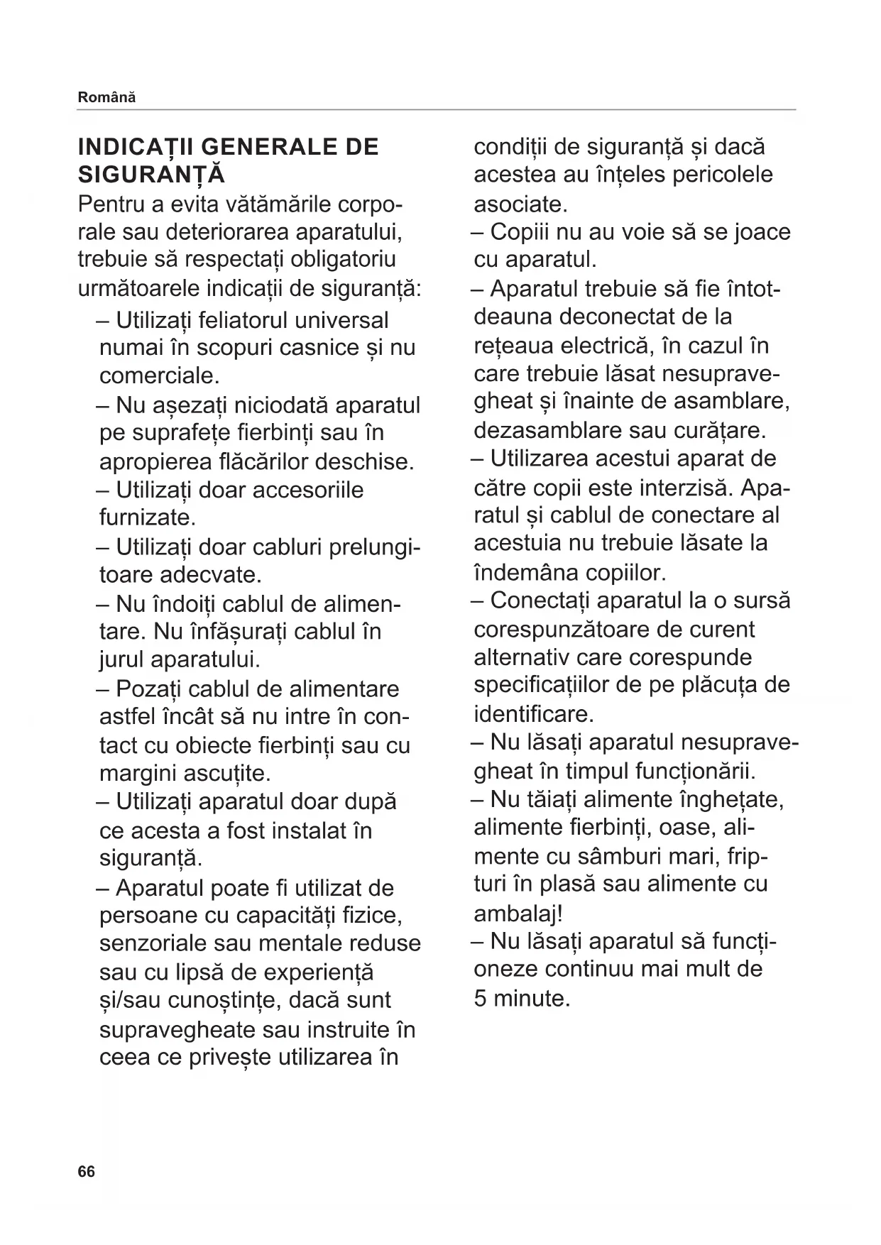 SIGURANȚĂ Pentru a evita vătămările corpo- rale sau deteriorarea aparatului, trebuie să respectați obligatoriu următoarele indicații de siguranță: – Utilizați feliatorul universal numai în scopuri casnice și nu comerciale. – Nu așezați niciodată aparatul pe suprafețe erbinți sau în apropierea ăcărilor deschise. – Utilizați doar accesoriile furnizate. – Utilizați doar cabluri prelungi- toare adecvate. – Nu îndoiți cablul de alimen- tare. Nu înfășurați cablul în jurul aparatului. – Pozați cablul de alimentare astfel încât să nu intre în con- tact cu obiecte erbinți sau cu margini ascuțite. – Utilizați aparatul doar după ce acesta a fost instalat în siguranță. – Aparatul poate utilizat de persoane cu capacități zice, senzoriale sau mentale reduse sau cu lipsă de experiență și/sau cunoștințe, dacă sunt supravegheate sau instruite în ceea ce privește utilizarea în condiții de siguranță și dacă acestea au înțeles pericolele asociate. – Copiii nu au voie să se joace cu aparatul. – Aparatul trebuie să e întot- deauna deconectat de la rețeaua electrică, în cazul în care trebuie lăsat nesuprave- gheat și înainte de asamblare, dezasamblare sau curățare. – Utilizarea acestui aparat de către copii este interzisă. Apa- ratul și cablul de conectare al acestuia nu trebuie lăsate la îndemâna copiilor. – Conectați aparatul la o sursă corespunzătoare de curent alternativ care corespunde specicațiilor de pe plăcuța de identicare. – Nu lăsați aparatul nesuprave- gheat în timpul funcționării. – Nu tăiați alimente înghețate, alimente erbinți, oase, ali- mente cu sâmburi mari, frip- turi în plasă sau alimente cu ambalaj! – Nu lăsați aparatul să funcți- oneze continuu mai mult de 5 minute. Română67 Pericol de electrocutare – În caz de defecțiuni, înainte de ecare curățare și atunci când aparatul nu este utilizat, scoateți întotdeauna ștecărul din priză. În acest scop, trageți de ștecher și nu de cablu.Nu scufundați niciodată aparatul în apă. Nu expuneți niciodată aparatul la ploaie sau umidi- tate. În cazul în care aparatul a căzut o dată în apă, mai întâi scoateți ștecărul din priză și apoi scoateți aparatul din apă. Dispuneți vericarea apara- tului de către un centru de service autorizat, înainte de a-l pune din nou în funcțiune. – Nu utilizați aparatul cu mâi- nile ude. Nu utilizați aparatul atunci când este ud sau umed sau atunci când vă aați pe o suprafață umedă. Nu utilizați aparatul în aer liber. – În caz de deteriorare a pie- selor aparatului, întrerupeți imediat utilizarea și contactați serviciul clienți ritter. – În cazul în care cablul de alimentare este deteriorat, acesta trebuie înlocuit de producător, de serviciul clienți sau de persoane cu o cali- care similară, pentru a evita pericolele. Pericol de rănire – Acest aparat nu trebuie utilizat fără sania pentru produsul de tăiat sau fără suportul pentru resturi, cu excepția cazului în care dimensiunea și forma produsului de tăiat nu permit utilizarea acestora. – Înainte de înlocuirea acceso- riilor sau a pieselor suplimen- tare, care sunt deplasate în timpul funcționării, aparatul trebuie să e oprit și deconec- tat de la rețeaua electrică. – Cuțitul rotativ este foarte ascuțit. – Nu atingeți niciodată cuțitul rotativ în timpul funcționării aparatului! – Înainte de curățare, opriți aparatul, scoateți ștecărul din priză și rotiți butonul de reglare a grosimii de tăiere în poziția „0”. – Cuțitul rotativ continuă să funcționeze pentru o perioadă scurtă de timp după oprire. Română68 Desfaceți gracele de la începutul și sfârșitul acestui manual. Citiți cu atenție instrucțiunile înainte de punerea în funcțiune a aparatului. Păstrați instrucțiunile de utilizare și transmitețile mai departe eventualilor proprietari. Alternativ, instrucțiunile actuale de utilizare sunt disponibile la adresa www.ritterwerk.de. UTILIZARE CONFORM DESTINAȚIEI Feliatorul universal servește la tăierea alimentelor pentru uz casnic. Toate feliatoarele universale sunt adecvate pentru contactul cu alimentele. Utilizarea necorespunzătoare sau operarea incorectă poate duce la vătămări corporale grave sau la deteriorarea aparatului. În acest caz, toate pretențiile care decurg din garanție și răspundere devin nule.