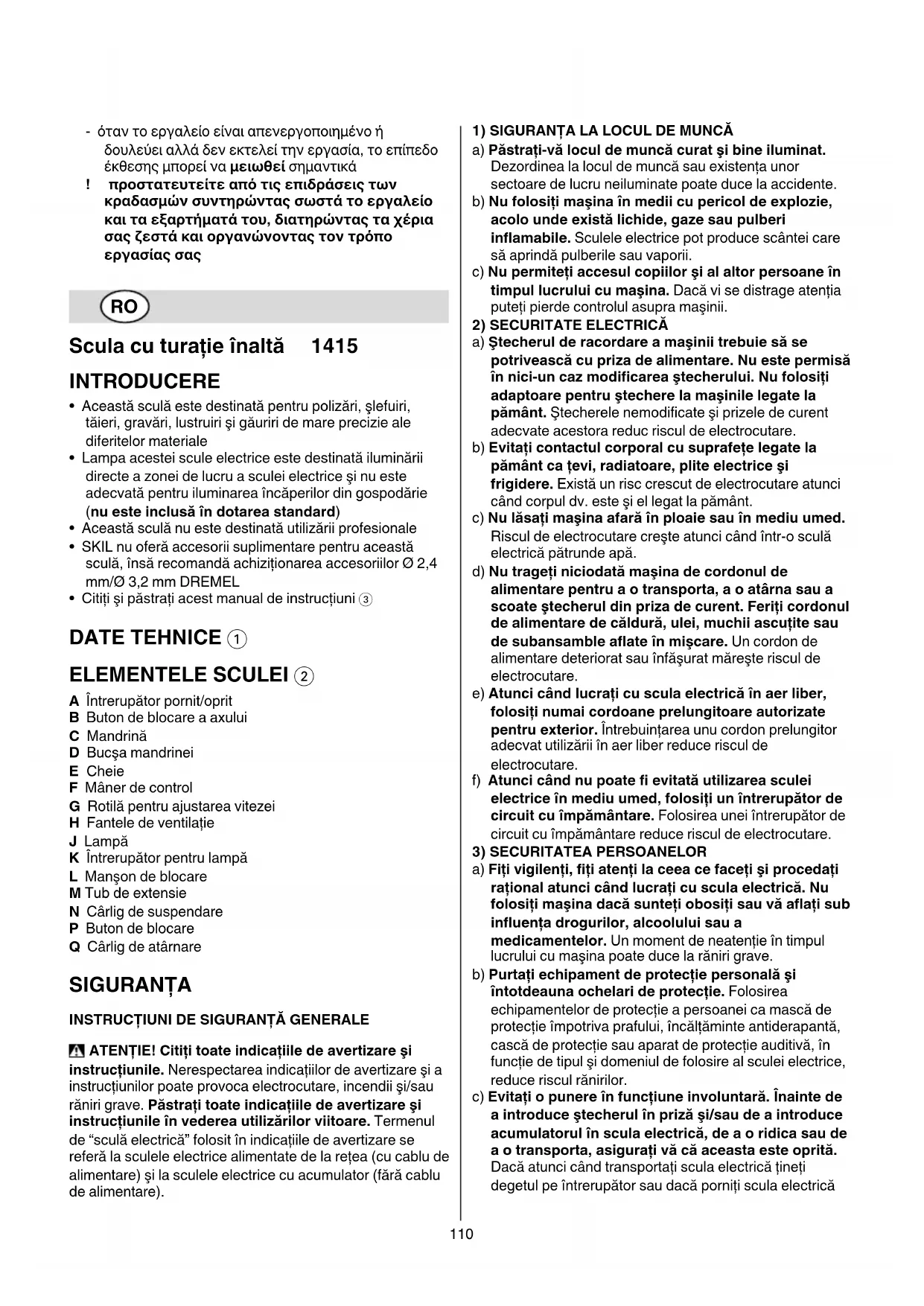 - Citiţi şi păstraţi acest manual de instrucţiuni 3 DATE TEHNICE 1 ELEMENTELE SCULEI 2 A Întrerupător pornit/oprit B Buton de blocare a axului C Mandrină D Bucşa mandrinei E Cheie F Mâner de control G Rotilă pentru ajustarea vitezei H Fantele de ventilaţie J Lampă K Întrerupător pentru lampă L Manşon de blocare M Tub de extensie N Cârlig de suspendare P Buton de blocare Q Cârlig de atârnare SIGURANŢA