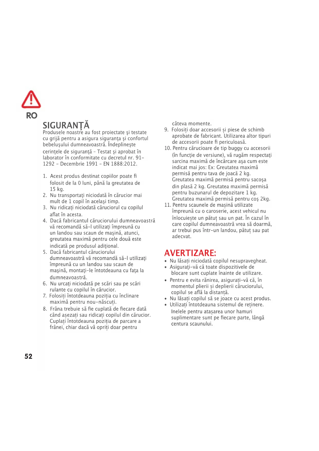 SIGURANŢĂ Produsele noastre au fost proiectate şi testate cu grijă pentru a asigura siguranţa şi confortul bebeluşului dumneavoastră. Îndeplineşte cerinţele de siguranţă – Testat şi aprobat în laborator în conformitate cu decretul nr. 91- 1292 - Decembrie 1991 - EN 1888:2012.