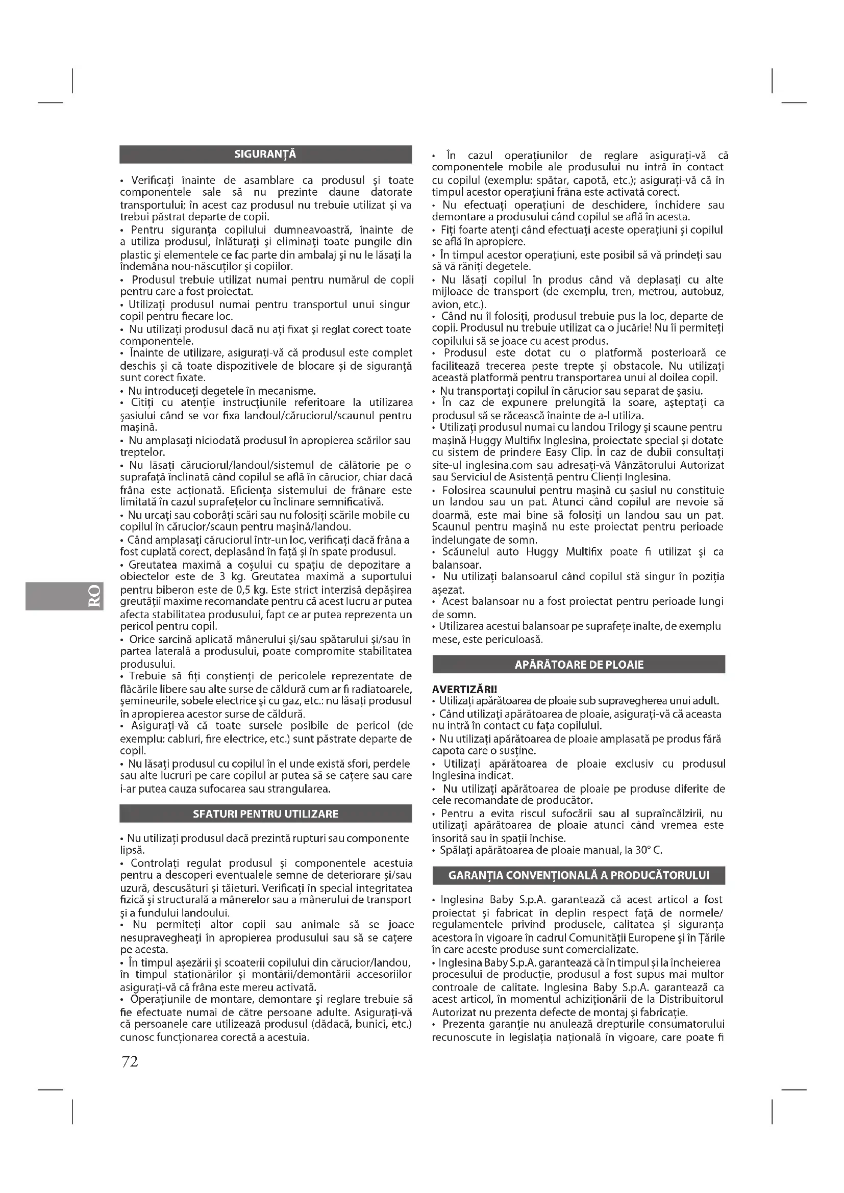 - Inglesina Baby S.p.A. garantează că în timpul şi la încheierea procesului de producţie, produsul a fost supus mai multor controale de calitate. Inglesina Baby S.p.A. garantează ca acest articol, în momentul achiziţionării de la Distribuitorul Autorizat nu prezenta defecte de montaj şi fabricaţie.