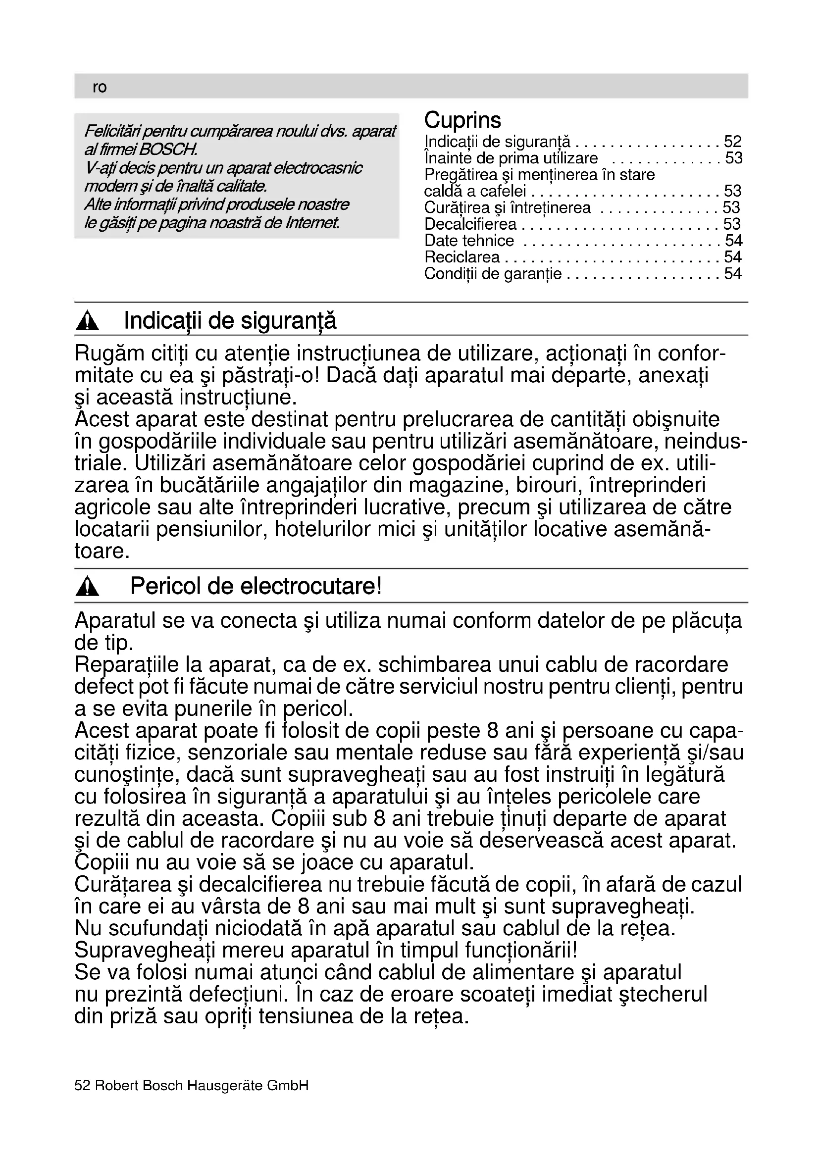 - Condiţii de garanţie , Indicaţii de siguranţǎ Rugăm citiţi cu atenţie instrucţiunea de utilizare, acţionaţi în confor- mitate cu ea şi păstraţi-o! Dacă daţi aparatul mai departe, anexaţi şi această instrucţiune. Acest aparat este destinat pentru prelucrarea de cantităţi obişnuite în gospodăriile individuale sau pentru utilizări asemănătoare, neindus- triale. Utilizări asemănătoare celor gospodăriei cuprind de ex. utili- zarea în bucătăriile angajaţilor din magazine, birouri, întreprinderi agricole sau alte întreprinderi lucrative, precum şi utilizarea de către locatarii pensiunilor, hotelurilor mici şi unităţilor locative asemănă- toare. , Pericol de electrocutare! Aparatul se va conecta şi utiliza numai conform datelor de pe plăcuţa de tip. Reparaţiile la aparat, ca de ex. schimbarea unui cablu de racordare defect pot fi făcute numai de către serviciul nostru pentru clienţi, pentru a se evita punerile în pericol. Acest aparat poate fi folosit de copii peste 8 ani şi persoane cu capa- cităţi fizice, senzoriale sau mentale reduse sau fără experienţă şi/sau cunoştinţe, dacă sunt supravegheaţi sau au fost instruiţi în legătură cu folosirea în siguranţă a aparatului şi au înţeles pericolele care rezultă din aceasta. Copiii sub 8 ani trebuie ţinuţi departe de aparat şi de cablul de racordare şi nu au voie să deservească acest aparat. Copiii nu au voie să se joace cu aparatul. Curăţarea şi decalcifierea nu trebuie făcută de copii, în afară de cazul în care ei au vârsta de 8 ani sau mai mult şi sunt supravegheaţi. Nu scufundaţi niciodată în apă aparatul sau cablul de la reţea. Supravegheaţi mereu aparatul în timpul funcţionării! Se va folosi numai atunci când cablul de alimentare şi aparatul nu prezintă defecţiuni. În caz de eroare scoateţi imediat ştecherul din priză sau opriţi tensiunea de la reţea. p. 54