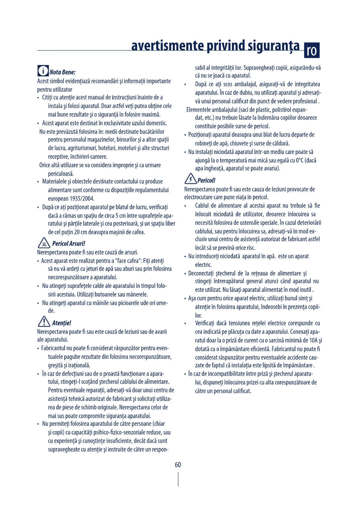 - Acest aparat este realizat pentru a “face cafea”: Fiţi atenţi să nu vă ardeţi cu jeturi de apă sau aburi sau prin folosirea necorespunzătoare a aparatului.