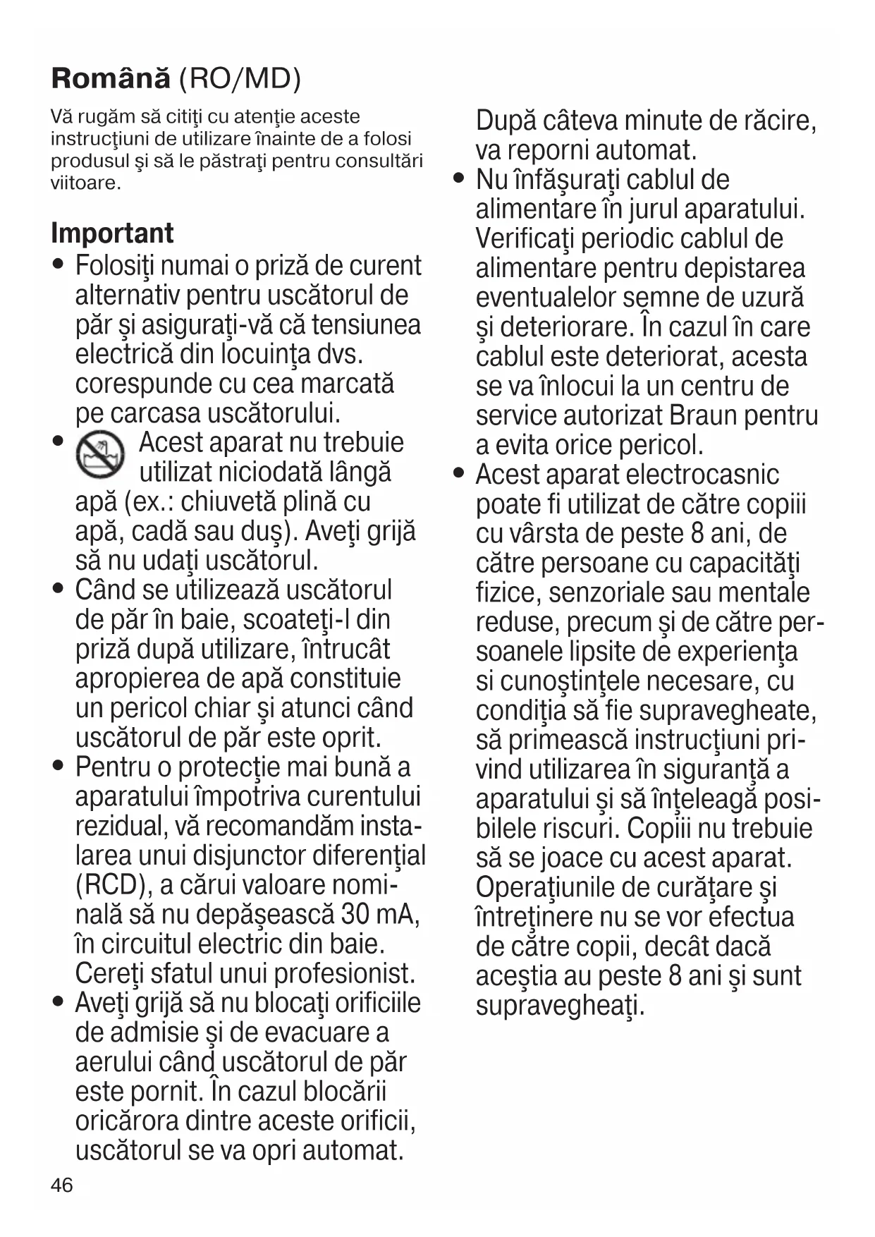 Pentru o protecţie mai bună a aparatului împotriva curentului rezidual, vă recomandăm insta- larea unui disjunctor diferenţial (RCD), a cărui valoare nomi- nală să nu depăşească 30 mA, în circuitul electric din baie. Cereţi sfatul unui profesionist.
