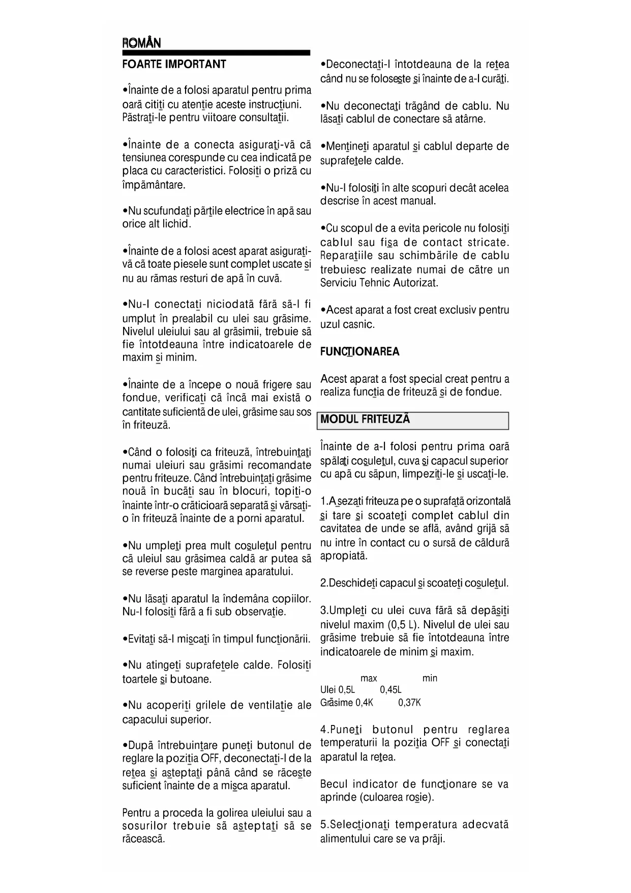 - Acest aparat a fost creat exclusiv pentru uzul casnic. FUNC TIONAREA Acest aparat a fost special creat pentru a realiza functia de friteuzã si de fondue. MODUL FRITEUZÃ Înainte de a-l folosi pentru prima oarã spãla ti cosuletul, cuva si capacul superior cu apã cu sãpun, limpezi ti-le si uscati-le. 1.A sezati friteuza pe o suprafatã orizontalã si tare si scoateti complet cablul din cavitatea de unde se aflã, având grijã sã nu intre în contact cu o sursã de cãldurã apropiatã. 2.Deschide ti capacul si scoateti cosuletul. 3.Umpleti cu ulei cuva fãrã sã depãsiti nivelul maxim (0,5 L). Nivelul de ulei sau grãsime trebuie sã fie întotdeauna între indicatoarele de minim si maxim. max min Ulei 0,5L 0,45L