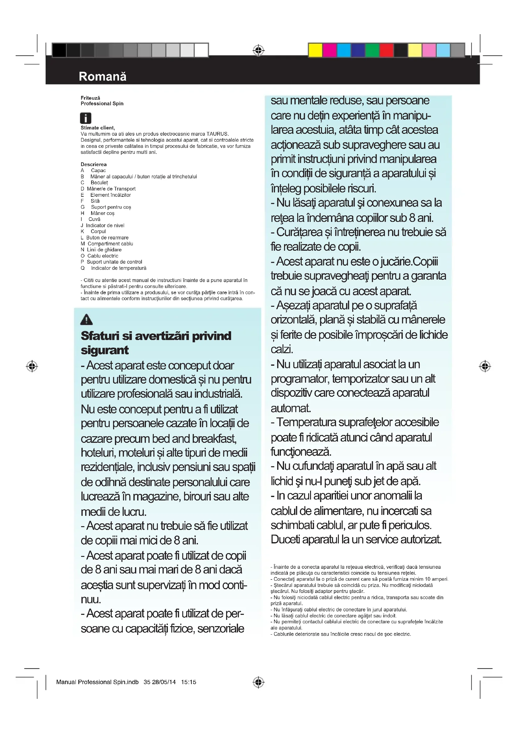 Защита окружающе среды и вторичная переработка продукта -Всоответствиистребованиямипоохранеокружающейсреды, упаковкаизготовленаизматериалов,предназначенныхдлявторичной переработки.Есливызахотитееевыбросить,томожетевоспользоваться специальнымиконтейнерамидлякаждоготипаматериала. -Нисамприбор,ниегоупаковканесодержатвеществ,представляющих опасностьдляокружающейсреды. Данныйсимволозначает,чтопоокончанииполезнойжизни прибораследуетпередатьеговпунктприемаотслуживших электрическихиэлектронныхприборов(RAEE)иливруки представителясоответствующейорганизации. ПриборизготовленвсоответствиисДирективой2006/95/EC понизковольтномуоборудованию,Директивой2004/108/ECпо электромагнитнойсовместимости,Директивой2011/65/ECпоограничению использованияопределенныхопасныхматериаловдляпроизводства электрическогоиэлектронногооборудованияиДирективой2009/125/EC, учреждающейсистемутребованийкэкологическомупроектированию продукции,связаннойсэнергопотреблением. Manual Professional Spin.indb 34 28/05/14 15:15Friteuză Professional Spin Stimate client, Va multumim ca ati ales un produs electrocasnic marca TAURUS. Designul, performantele si tehnologia acestui aparat, cat si controalele stricte in ceea ce priveste calitatea in timpul procesului de fabricatie, va vor furniza satisfactii depline pentru multi ani. Descrierea A Capac B Mâneralcapacului/butonrotațiealtrinchetului C Beculeț D Mâner/e de Transport E Elementîncălzitor F Sitã G Suportpentrucoș H Mânercoș I Cuvă J Indicator de nivel K Corpul L Buton de rearmare M Compartiment cablu N Linii de ghidare O Cablu electric P Suport unitate de control Q Indicatordetemperatură - Cititi cu atentie acest manual de instructiuni înainte de a pune aparatul în functiune si pãstrati-l pentru consulte ulterioare. -Înaintedeprimautilizareaprodusului,sevorcurăţapărţilecareintrăîncon- tactcualimenteleconforminstrucţiunilordinsecţiuneaprivindcurăţarea. Sfaturi si avertizãri privind sigurant - Acest aparat este conceput doar pentruutilizaredomesticășinupentru utilizareprofesionalăsauindustrială. Nu este conceput pentru a fi utilizat pentrupersoanelecazateînlocațiide cazare precum bed and breakfast, hoteluri,motelurișialtetipuridemedii rezidențiale,inclusivpensiunisauspații deodihnădestinatepersonaluluicare lucreazăînmagazine,birourisaualte medii de lucru. -Acestaparatnutrebuiesăfieutilizat de copiii mai mici de 8 ani. - Acest aparat poate fi utilizat de copii de8anisaumaimaride8anidacă aceștiasuntsupervizațiînmodconti- nuu. - Acest aparat poate fi utilizat de per- soanecucapacitățifizice,senzoriale sau mentale reduse, sau persoane carenudeținexperiențăînmanipu- larea acestuia, atâta timp cât acestea acționeazăsubsupravegheresauau primitinstrucțiuniprivindmanipularea încondițiidesiguranțăaaparatuluiși înțelegposibileleriscuri. -Nulăsaţiaparatulşiconexuneasala reţealaîndemânacopiilorsub8ani. -Curățareașiîntreținereanutrebuiesă fie realizate de copii. -Acestaparatnuesteojucărie.Copiii trebuiesupravegheaţipentruagaranta cănusejoacăcuacestaparat. -Așezațiaparatulpeosuprafață orizontală,planășistabilăcumânerele șiferitedeposibileîmproșcăridelichide calzi. -Nuutilizațiaparatulasociatlaun programator, temporizator sau un alt dispozitivcareconecteazăaparatul automat. -Temperaturasuprafeţeloraccesibile poatefiridicatăatuncicândaparatul funcţionează. -Nucufundaţiaparatulînapăsaualt lichidşinu-lpuneţisubjetdeapă. - In cazul aparitiei unor anomalii la cablul de alimentare, nu incercati sa schimbati cablul, ar pute fi periculos. Duceti aparatul la un service autorizat. -Înaintedeaconectaaparatullareţeauaelectrică,vericaţidacătensiunea indicatăpeplăcuţacucaracteristicicoincidecutensiuneareţelei. -Conectaţiaparatullaoprizădecurentcaresăpoatăfurnizaminim10amperi. -Ştecărulaparatuluitrebuiesăcoincidăcupriza.Numodicaţiniciodată ştecărul.Nufolosiţiadaptorpentruştecăr. -Nufolosiţiniciodatăcablulelectricpentruaridica,transportasauscoatedin prizăaparatul. -Nuînfăşuraţicablulelectricdeconectareînjurulaparatului. -Nulăsaţicablulelectricdeconectareagăţatsauîndoit. -Nupermiteţicontactulcabluluielectricdeconectarecusuprafeţeleîncălzite ale aparatului. -Cabluriledeterioratesauîncâlcitecrescrisculdeşocelectric. Romană Manual Professional Spin.indb 35 28/05/14 15:15-Nuatingeţiştecărulcumâinileude. -Nuutilizaţiaparatuldacăştecărulsaucablulelectricsuntdeteriorate. -Dacăunadincarcaseleaparatuluisedeteriorează,deconectaţiimediatapara- tuldelareţeauaelectricăpentruaevitaposibilitateauneielectrocutări. -Nuutilizaţiaparatuldacăacestaacăzut,dacăprezintăsemnevizibilede daunesaudacăexistăoscăpare. -Aşezaţiaparatulpeosuprafaţăplanăşistabilă,carerezistălatemperaturi ridicate,departedeoricealtăsursădecăldurăşideposibilelestropiricuapă. -Păstraţiaparatulladistanţădeoricematerialecombustibile,cumarmateria- lele textile, carton, hârtie… -Nuatingeţipărţileîncălzitealeaparatului,deoareceelevăpotproducearsuri grave. Utilizare şi îngrijire: -Înainteaecăreiutilizări,desfăşuraţiînmodcompletcablulelectri